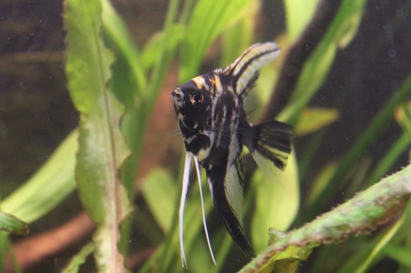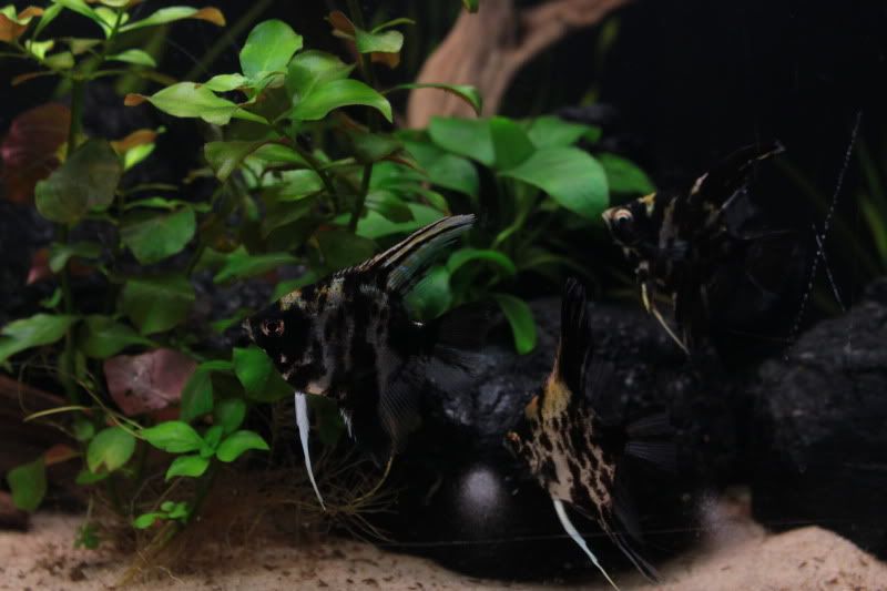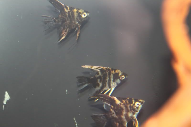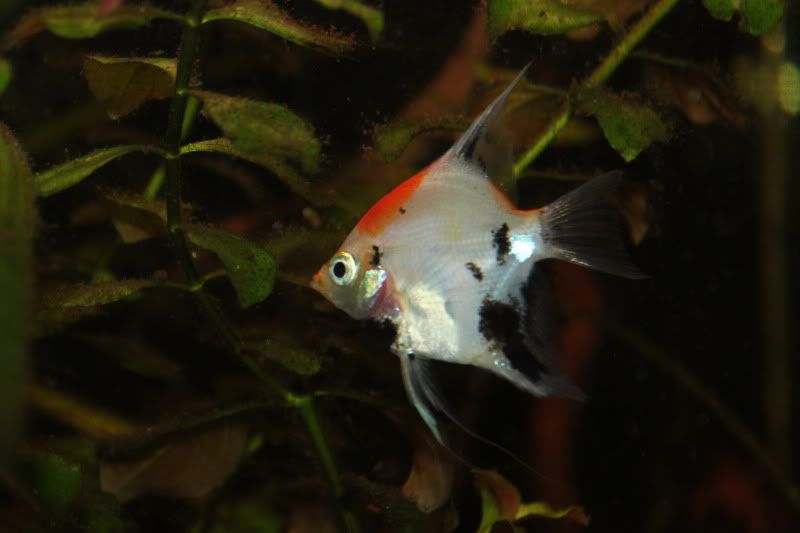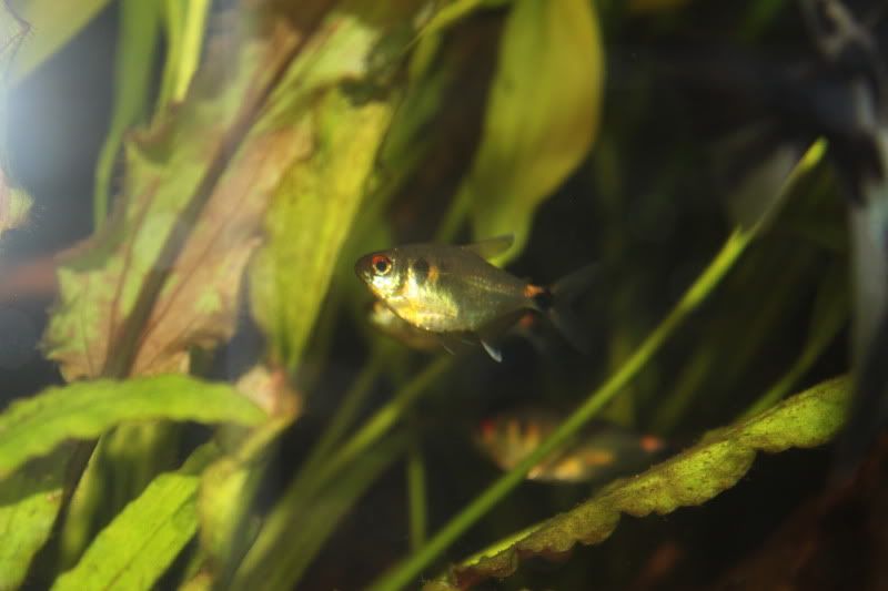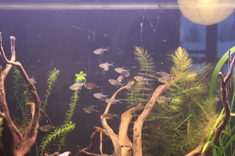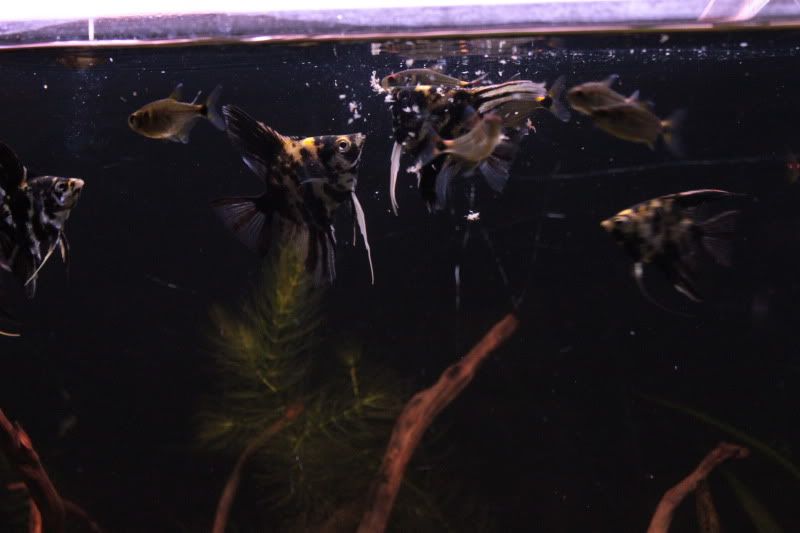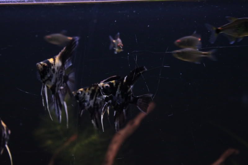 ett stim (ca 40?) av någon tetra. Har funderat på glödbandstetra men är orolig att de är för små med tanke på skalarerna. Å andra sidan tar det väl ett tag innan skalarerna är stora nog att ta dem...