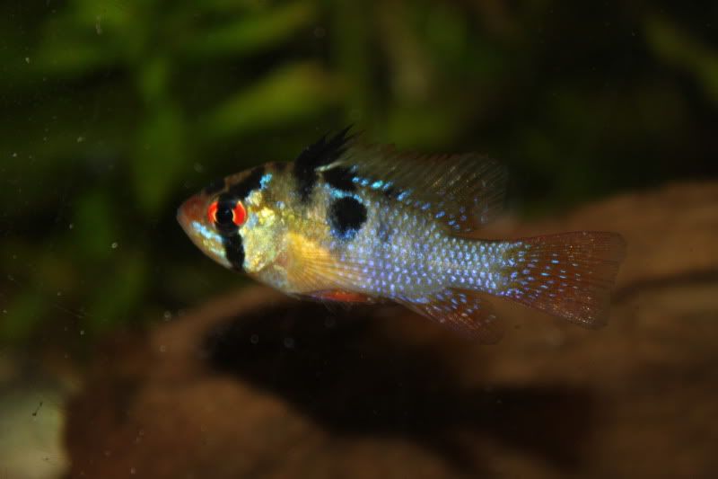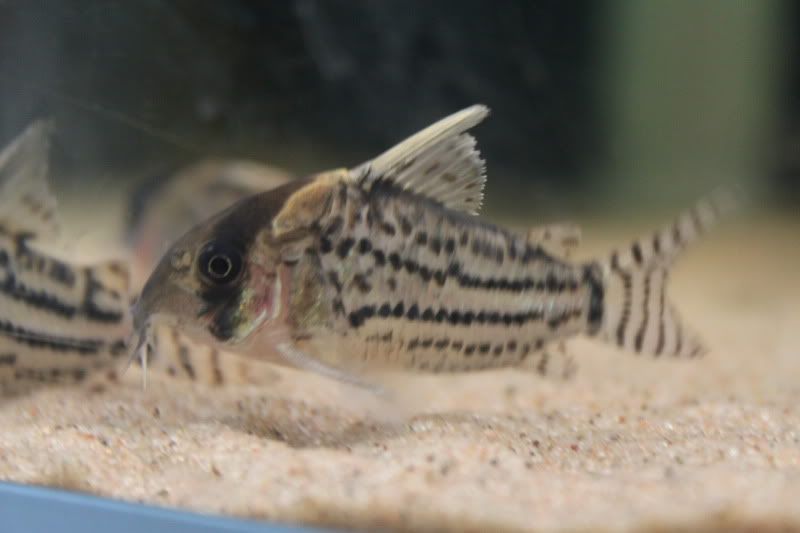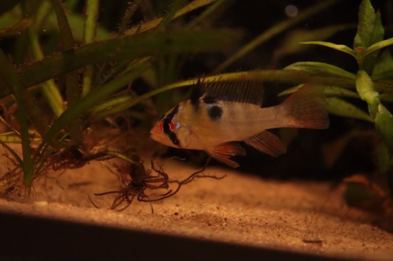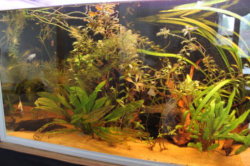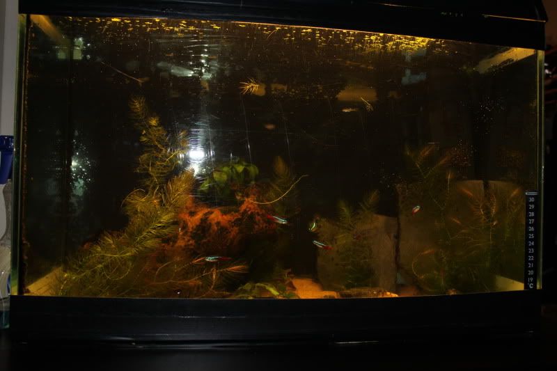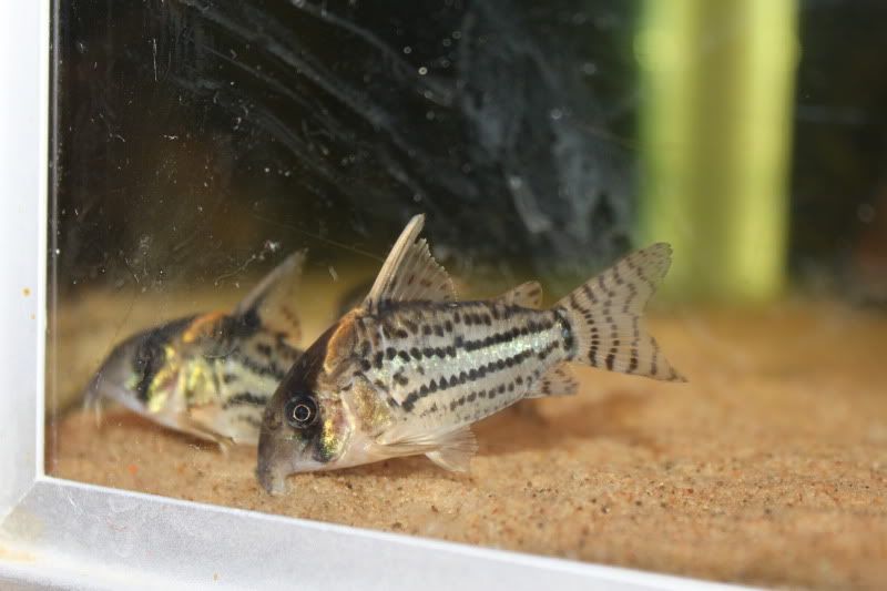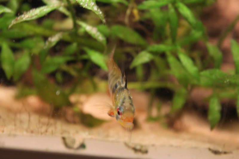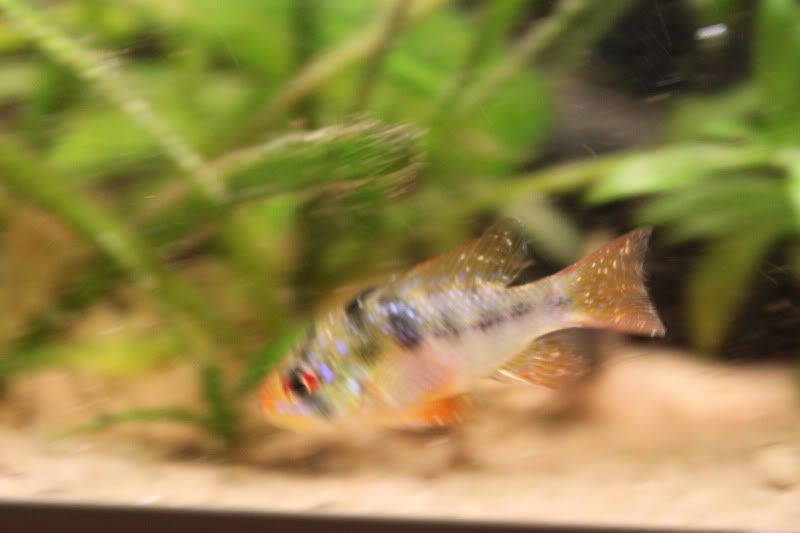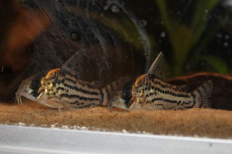 ett stim (ca 40?) av någon tetra. Har funderat på glödbandstetra men är orolig att de är för små med tanke på skalarerna. Å andra sidan tar det väl ett tag innan skalarerna är stora nog att ta dem...