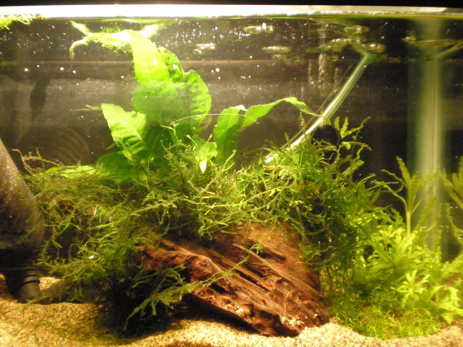[*]Det finns sex plantor av varierande storlek, samt en little grotta i mitten. Jag har täckt bakglaset med en grottliknande bild. Jag har också köpt en sådan magnetrensare för glaset i och med att det blev mycket alger (pågrund av att jag hade lyset på från 06:00-22:00).