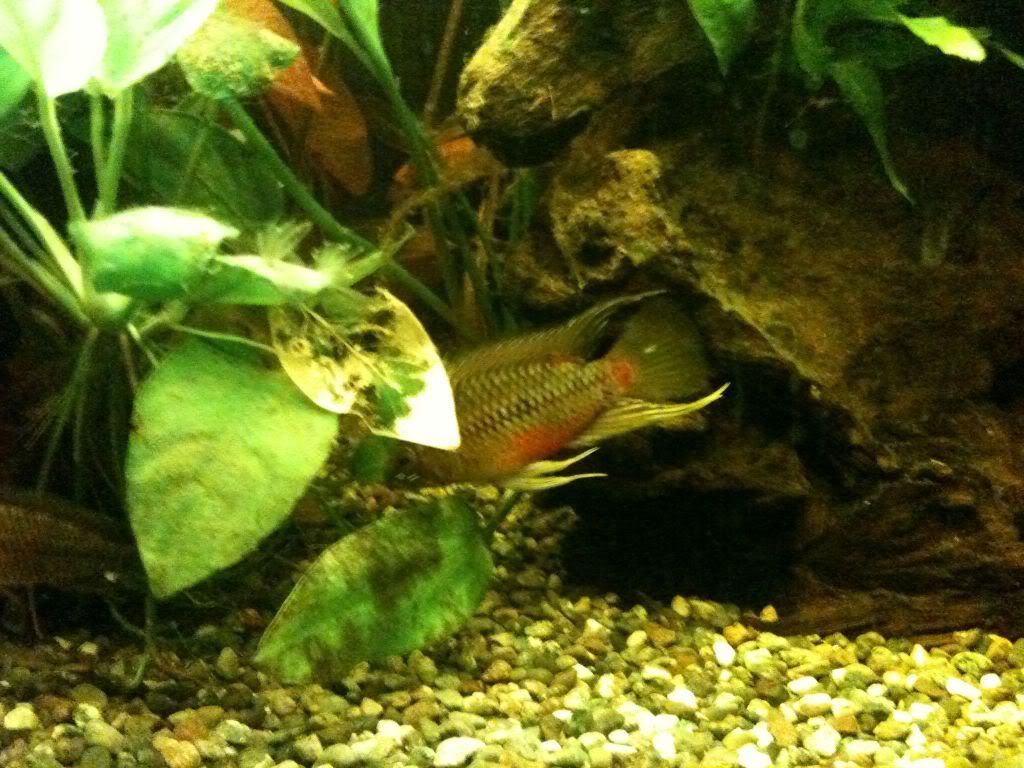 Har fyra stycken ap. hongsloi, och nu har hanen fått en liten vit prick på stjärtfenan. Försökte dokumentera den med en suddig bild som iaf visar den lilla fläcken...