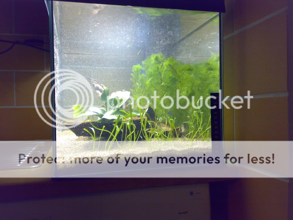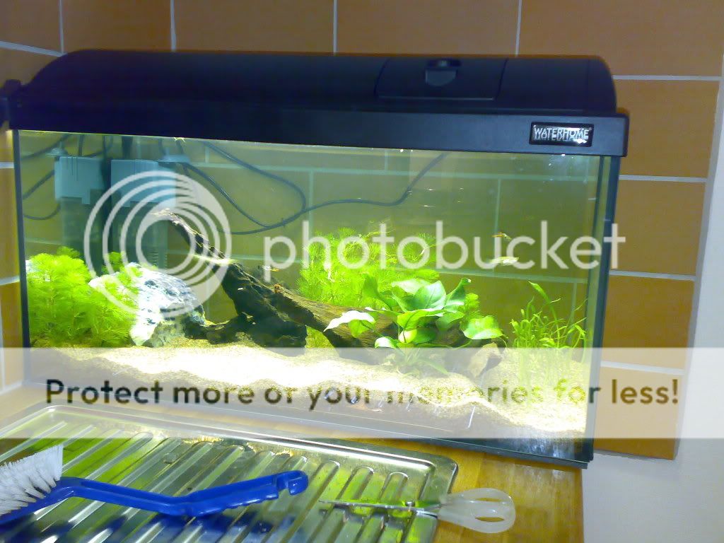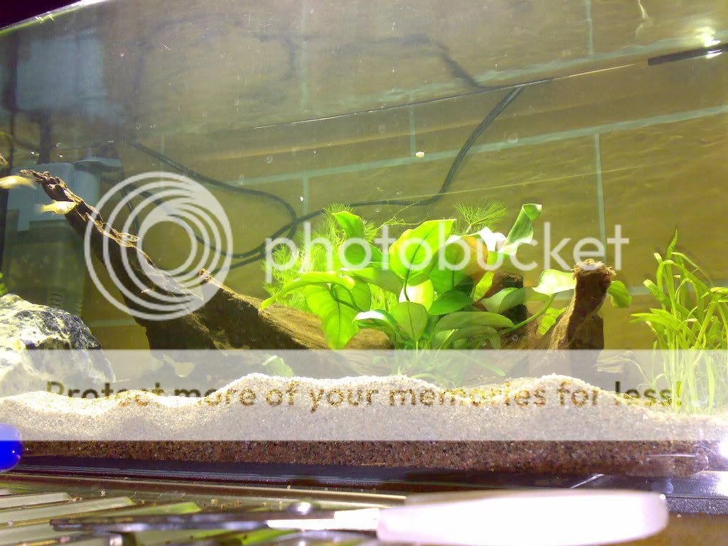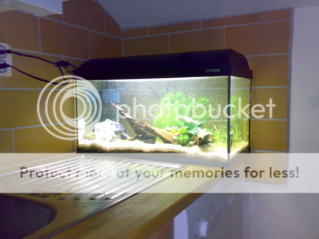 Bara några tankar från min sida. Jag tycker akvariet är jättefint inrett! Troligen kommer du få göda växterna efter ett tag, det brukar ta 1-2 månader innan man märker att de börjar må dåligt.