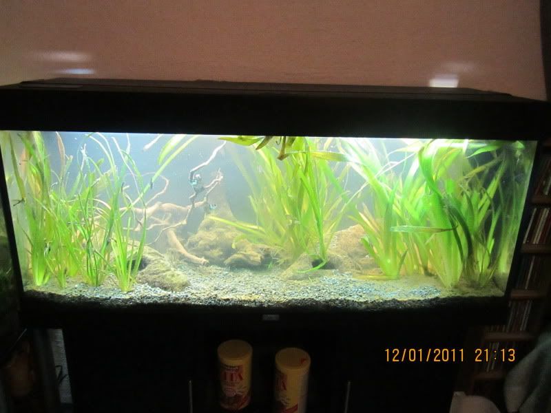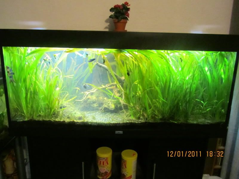 Har ett kar på 240 l som de senaste månaderna nästintill växt igen av all valle som blivit till i karet. Ikväll tröttnade jag på att se fiskarna kämpa runt i växtligheten för att komma fram till den enda lilla plätt som inte var igenvuxen.