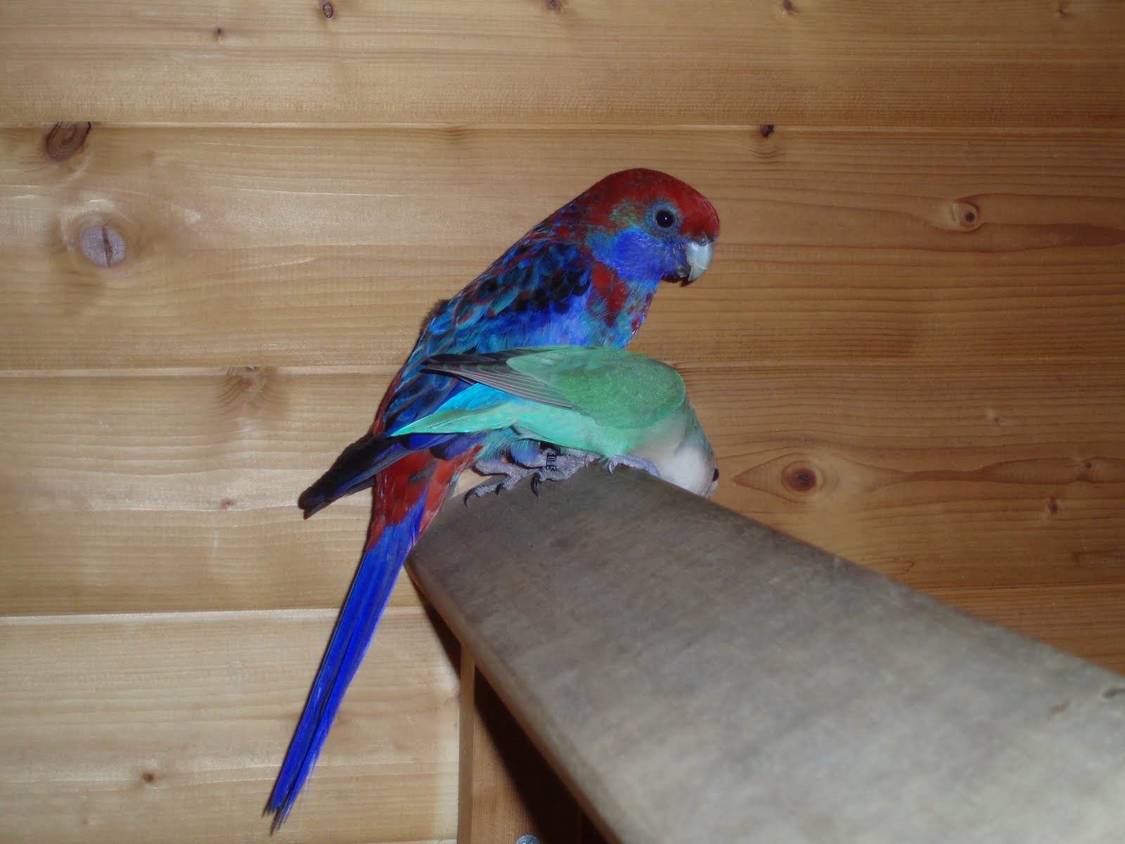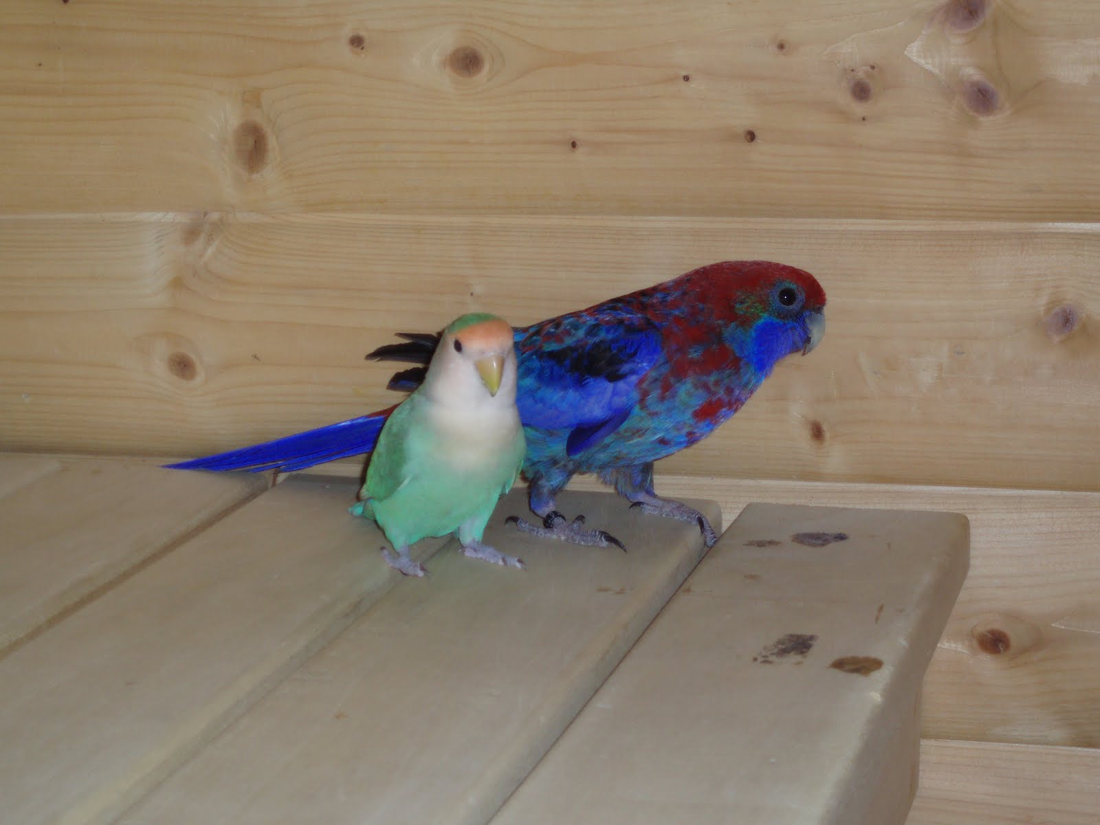 Jag har även ett par arter av gräsparakiter: blåvingeparakit och splendidparakit. Dessa är väldigt trevliga och förnöjsamma fåglar som också går att få tama. De har också en angenäm ljudnivå. Älskar att flyga gör de och de är oerhört snälla. Kan precis som katarinan hållas med olika finkarter. Här är mitt splendidpar. De är ungfåglar och hanen blir alldeles röd på bröstet när han färgar ut.