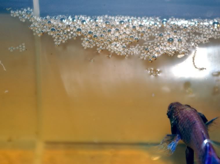 Jag satte min kampfiskhane i en lekbalja för någon vecka sedan mest för att se om han fortfarande kunde bygga skumbo (han är ganska gammal), då jag länge har tänkt avla på dem. Han visade att han kunde bygga, men det blev bara små bon, så jag la i honan för att liksom trigga honom att bygga större, men vad händer då? Jo de leker ändå i ett minilitet lager bubblor, där antalet ägg överstiger antalet bubblor. Dessutom är bubblorna sköra, så vissa går sönder lite då & då.