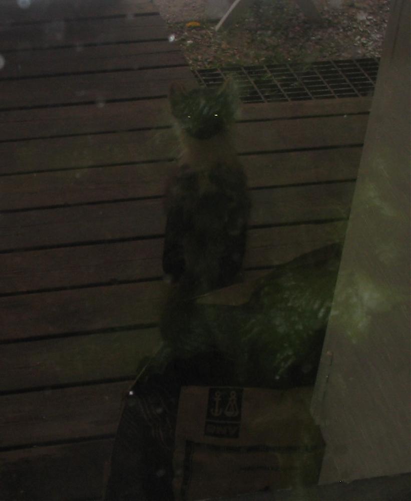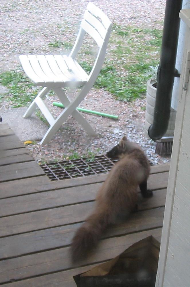 Igår kom mården och hälsade på... ända upp på alltan!! Såklart sprang jag och hämtade kameran och fick... blandat resultat. Ni vet ju hur man blir när man hetsar efter kameran, blixt genom fönster... ja. Jag lägger upp några bilder i alla fall. Jag lyckades ta mig ut relativt omärkt på alltan och tog bilder på denna väldigt nyfikna mård. Likt en iller hoppade den omkring och tittade på mig. Hade ju som vanligt inte ändrat inställningarna i kameran... *suck Så resultaten var blandade. Kolla in djävulsögonen på den mörka bilden..