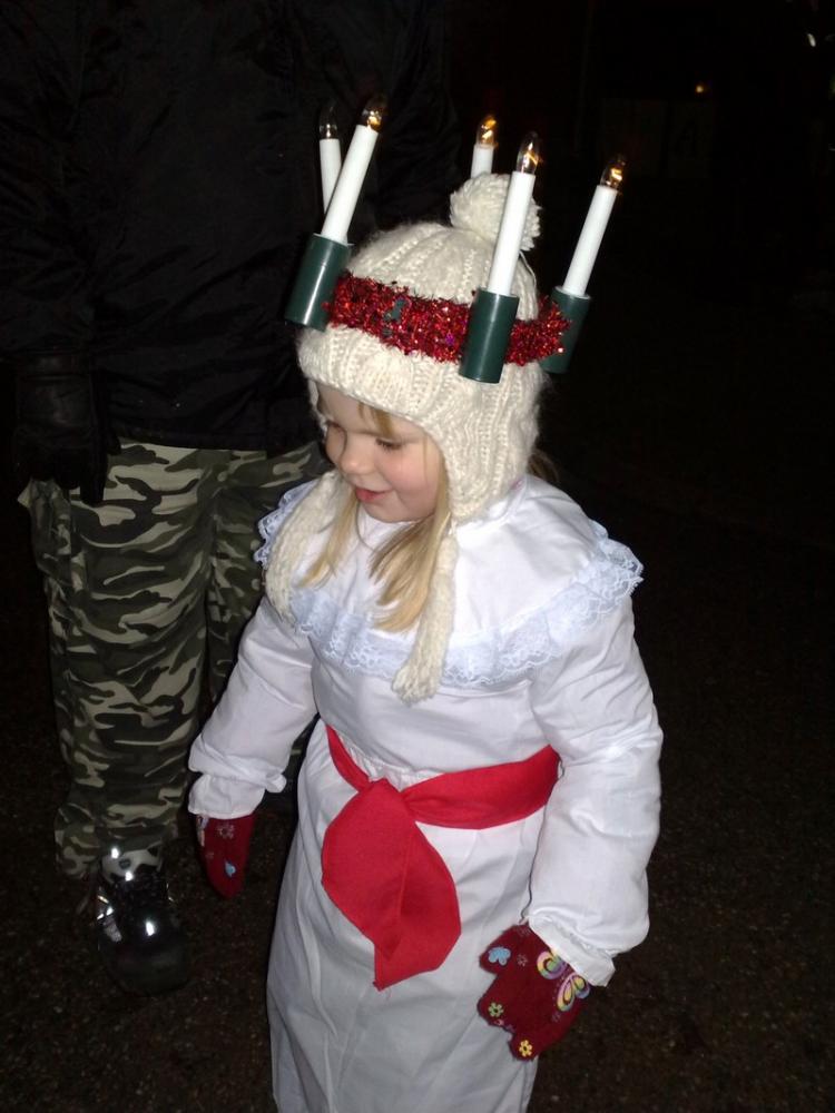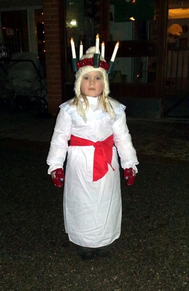 Igår var vi på dagis och firade lucia med barnen. De var så söta!!! Dotra ville ju så klart vara lucia och sonen tomte. Vi firar lucia ute på gården på vårt dagis och tycker det blir mycket mysigare då. Vi hade tur med vädret med och det kom lite snö strax innan firandet började! Innan luciatåget skulle börja var nog Tindra rätt nervös, vilket ni kan se på bilden. Men efteråt var hon glad igen. Vårt busfrö till son ville inte gå med i tåget. Han hade hittat glöggstället där det fanns russin, russin narkoman som han är. Ser ni hur det lyser bus från honom??