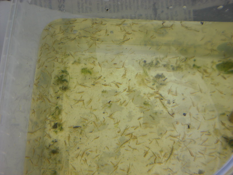Min mest exotiska odling är nog artemiakulturerna. Det är nu den sjunde sommaren som jag drar upp artemia utomhus. Jag har i sommar tre murbruksbaljor på 80-90 liter igång. Det började med att jag läste ett inlägg av Ron Schulz i Killietalk 2007 där han berättade om sina artemiabaljor utomhus. Egentligen inga konstiga saker överhuvudtaget, så det måste man ju bara pröva på. När jag startade upp den första baljan tog jag 2,5 kg vanligt grovsalt till 80 liter vatten. Då siktade jag på en densitet på 1,025 men numera tycker jag det går bättre med 1,030 eller mer. Så en densitometer behövs och ev en termometer (om det nu blir riktigt varmt på sommaren för att veta om man behöver skugga baljorna). Jag har artemia från Great Salt Lake och det kan givetvis vara annorlunda med salthalten för andra stammar. Jag har ställt mina baljor så soligt det går för att få bästa tillväxt. Blir det rikligt med regn får man överväga att täcka över baljorna. Annars skall i princip allt som ramlar i stanna i och omvandlas till näring åt artemian. Jag har märkt att om det hamnar en bit takmossa av knytnävsstorlek i baljan blir det riktigt bra, så nu hjälper jag till med det. Jag har också några grabbnävar faxekalk på botten och häller i en matsked bikarbonat på våren. På våren saltar man även upp kulturerna till lämplig densitet. Jag seedar sedan baljorna kontinuerligt med artemianauplier som blivit över vid yngelmatningen. Men för att kulturerna skall ta sej krävs riktig sommar och gärna en bra algblomning. Man skördar med en normal akvariehåv som lämnar de mindre artemiorna kvar i kulturen. Jag tror artemian är det foder som är mest stimulerande för fiskarna att jaga efter. En annan stor fördel är att det inte finns några luftlandsatta predatorer att oroa sej för.