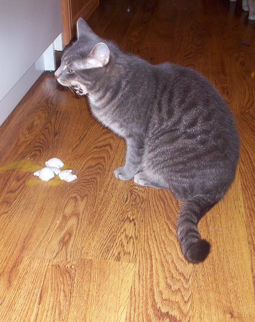Till äggens försvar skall dock sägas att första missödet var mitt fel... man ska INTE tappa ägg i golvet! Aldrig någonsin... och definitivt inte när tidsschemat är på gränsen till överskrivet. Kunde varit värre... det var det bara ett som jag tappade... men resten av äggen i asken hämnades.