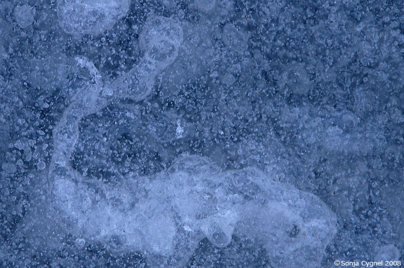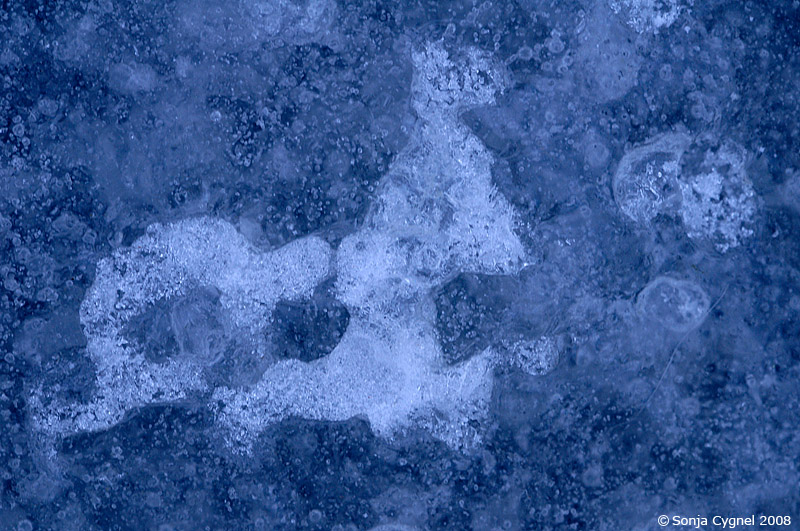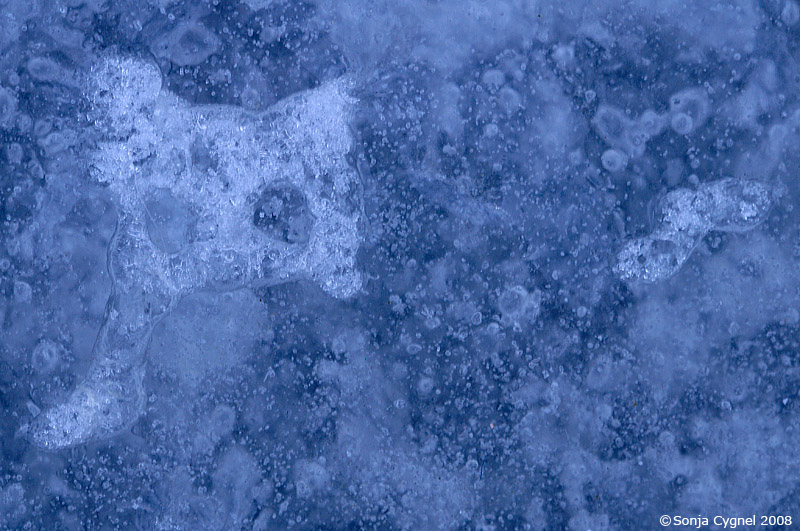 Hurra! Nu är det is i den översvämmade hästhagen igen. Jag gick omkring och letade efter fotomotiv och hittade små mönster som såg ut som figurer. Vet inte om det bara är jag som har livlig fantasi men jag tycker mig se t ex en maskeradmask, en val med en gubbe i änden på stjärten (Jona och valfisken kanske ) och en springande hjort.