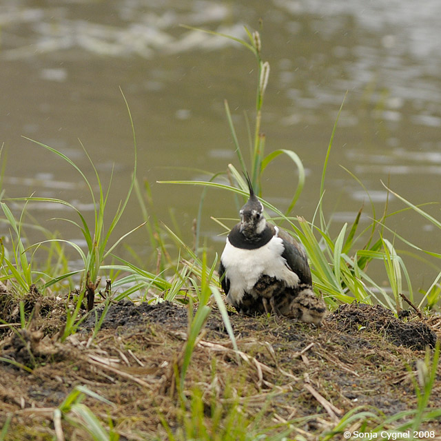 Bilden på tofsvipsmamman med alla fyra ungar som försöker klämma in sig under hennes varma fjädrar är söt.