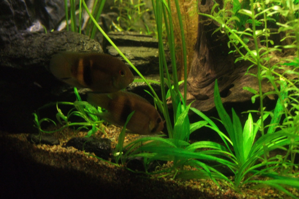 De går nu som ensamma ciklider i svartvattenkaret, vilket iof var planen, där de förhoppningsvis kan få leka i lugn och ro utan att behöva bekymra sig om vem och vilka som ska hunsas. Följdaktligen är de bolivianska fjärislhannarna tillbaks i detta kar. Vet inte vad jag ska göra av dessa två gossar som förlorade sina honor i camallanusutbrottet. Tycker inte de passar in i detta kar med sina ljusa starka färger, nästan lite pastellaktiga. Får se vad jag hittar på.