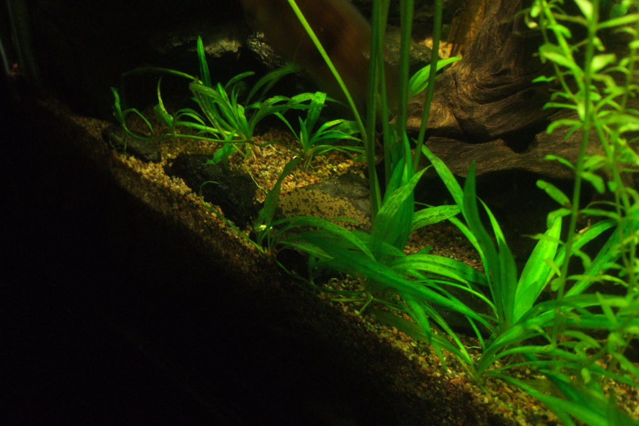 I växtväg inte mycket nytt. Fick en svärdsplanta gratis i en butik för den var lite trött. Släppte först ned krukan ett tag för att se om det var liv i den och den sken upp direkt så nu har jag planterat den bland rotkomplexet. Tror det blir kanon där, får över lite rödton till högra delen av karet och lite balans mot spikbladen som dominerar den delen totalt. Har identifierat den som Echinodorus Barthii (/double red) men är inte helt säker. Så här ser den ut iaf, lite dold här på bilden men den kommer nog buska upp sig rejält.
