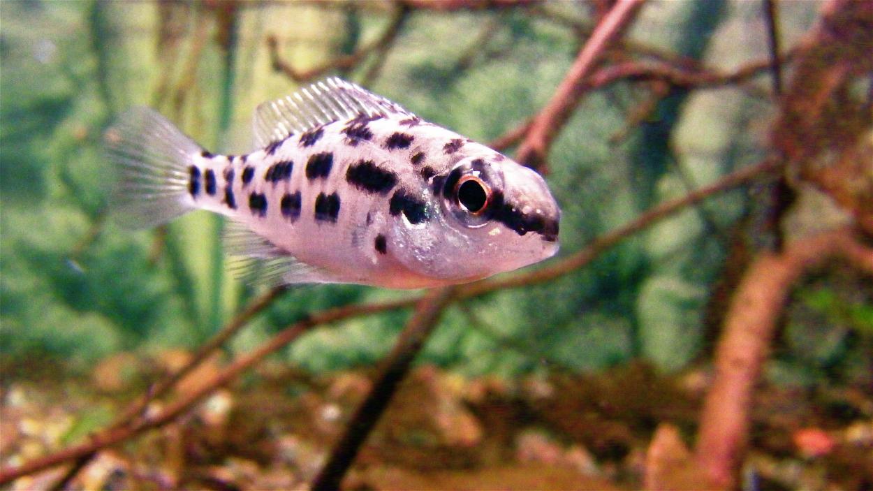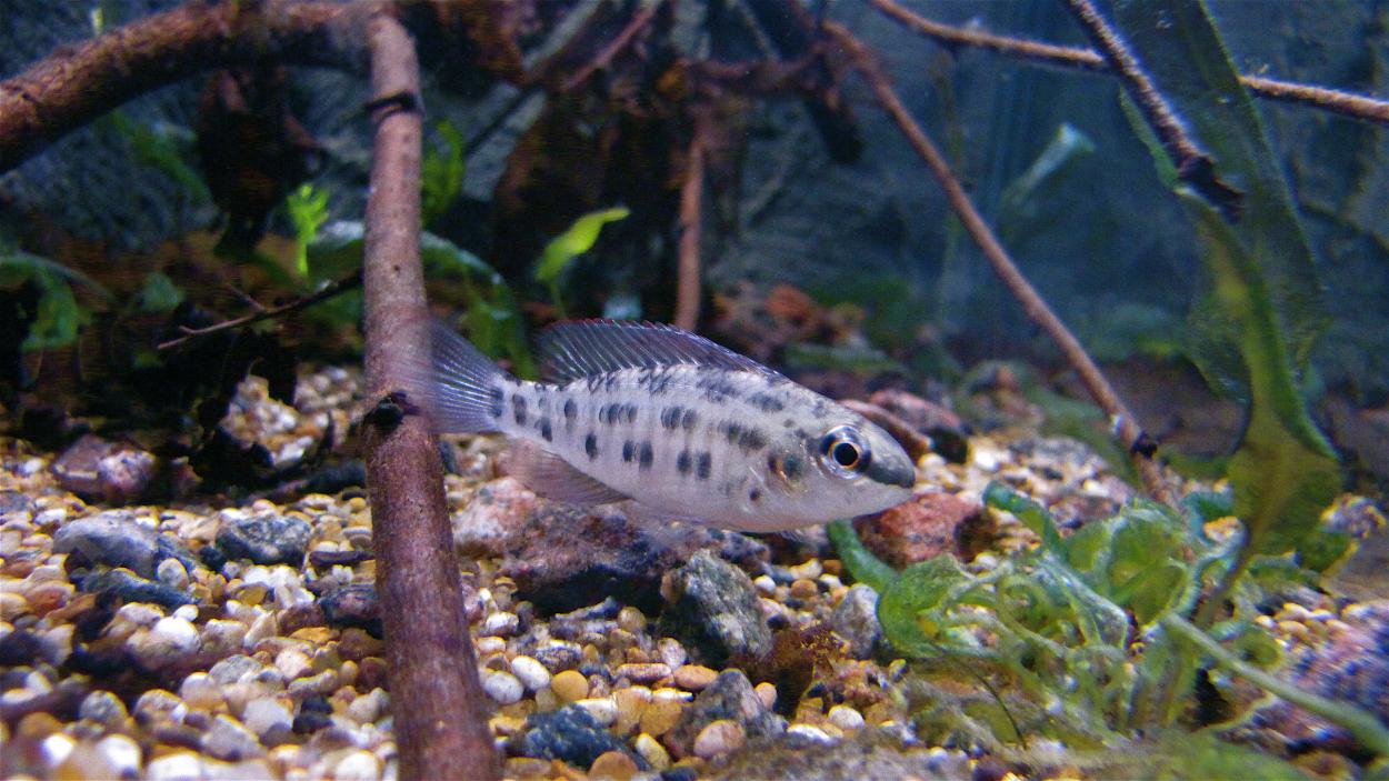 Det där är en Ivanacara adoketa-hane. Samma kille som jag har på min avatar! Han är lite grumpy för kärringen hans "löper" - då blir det alltid lite surt i baljan. Dom brukar vara ganska snälla och beskedliga annars!