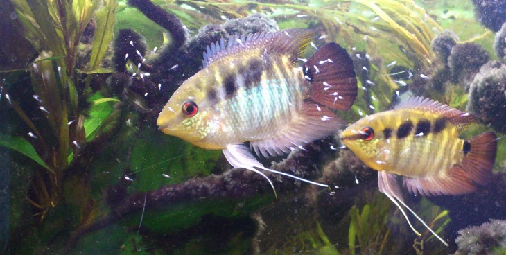 Men undrar vad som hänt med hanens ryggfena, ser ut som de hårda fenstrålarna är lite glesa på ett ställe. Kanske varit i luven på blåcikliderna... Läker så´nt?