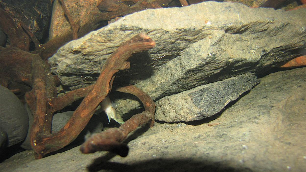 Jag har hyfsad koll på par- och lekbeteendet hos ett dominant par, som regerar över en växande yngelkoloni. Tricket med situationen i mitt kar är att det befinner sig sju vuxna individer, som ännu inte (som jag förstår det) har sorterat ut den inbördes ordningen - om vi bortser från de två "starkaste" - eller dominanta fiskarna, som har varsin sida av karet. Vi har också den där filuren som obehindrat växelverkar mellan dessa två - och så är det fyra andra som jag kallar "krypare", som är accepterade, men är klart underdåniga - och därmed uppträder på det klassiska krypande, korvande sättet.