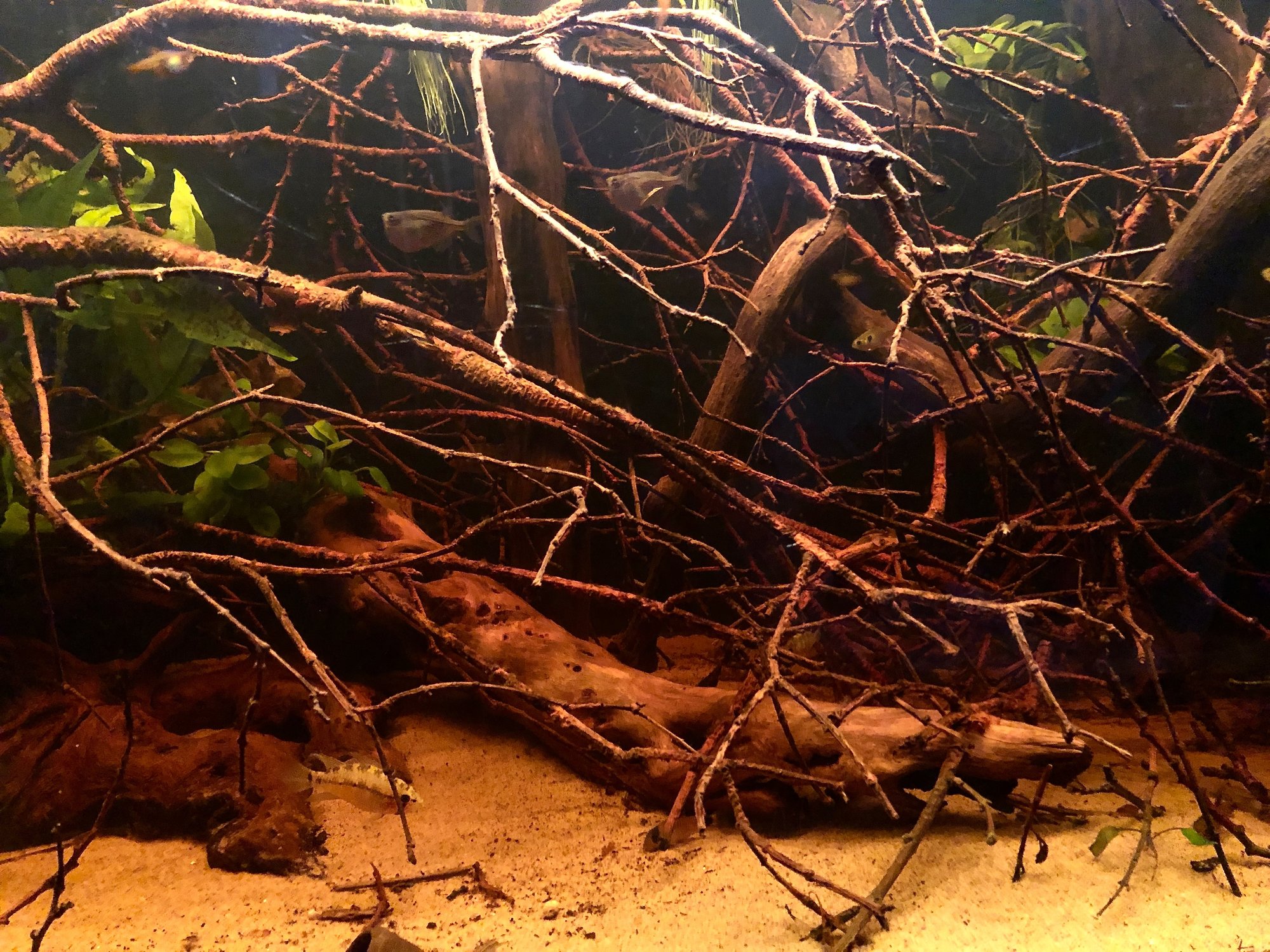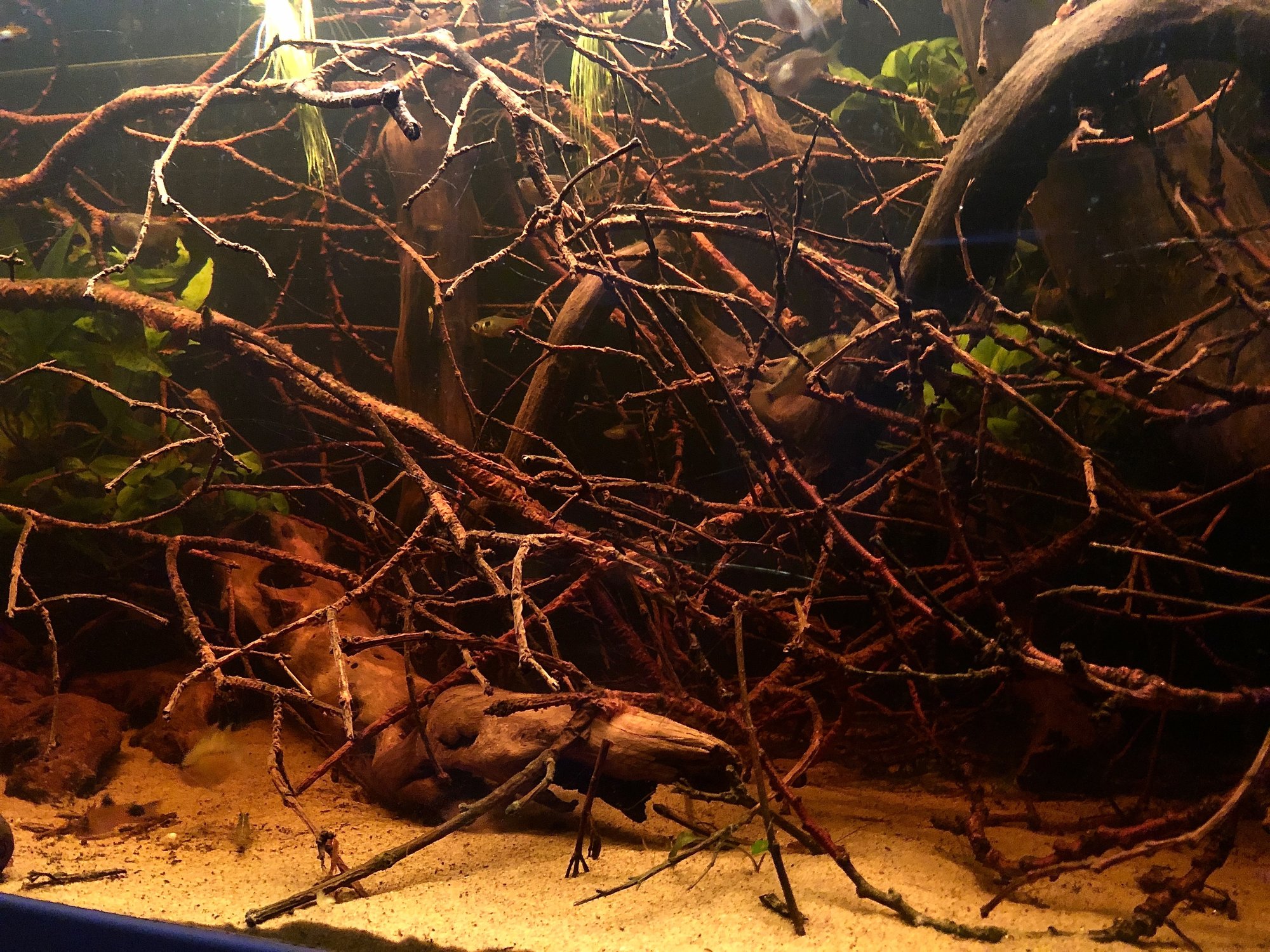 Det mesta arbetet inriktar sig nu på galvelglasen. Här har jag börjat ställa grenar lodrätt för att senare binda upp ett större antal Anubiasplantor på ytterligare pinnar som skall stickas ned bland dessa.