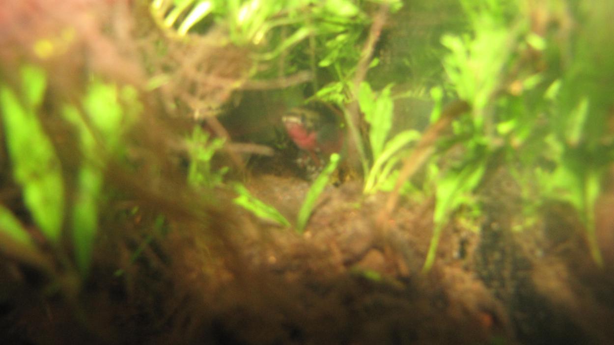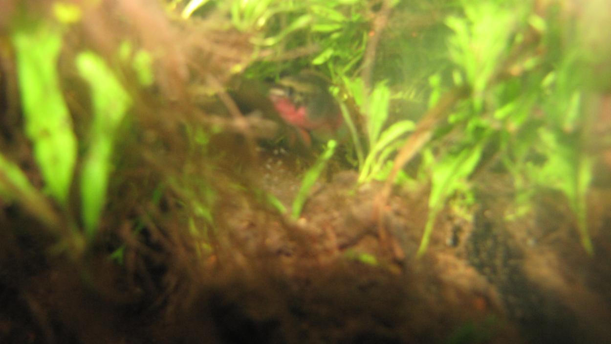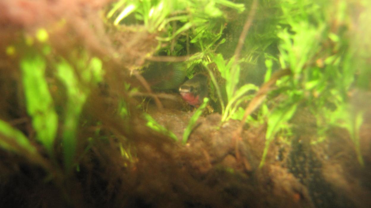 På andra sidan karet har det första paret en rätt skön yngelskock just nu - men det är lögn i helvete att få vettiga bilder eller filmer på dom. Paret står djupt inne i växtbôset och trycker med ynglen - dom har börjat lära sig grejen lite nu och håller sig undan.
