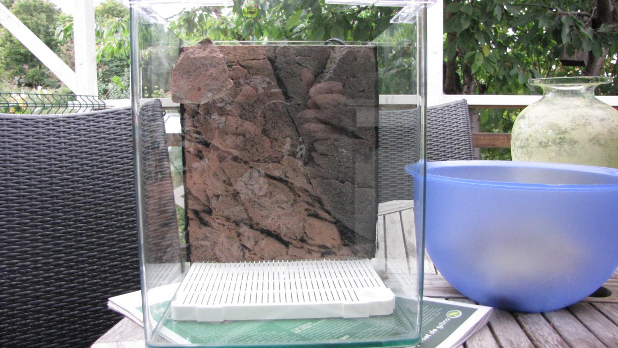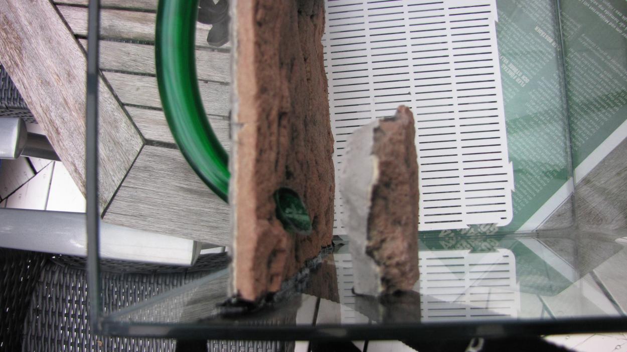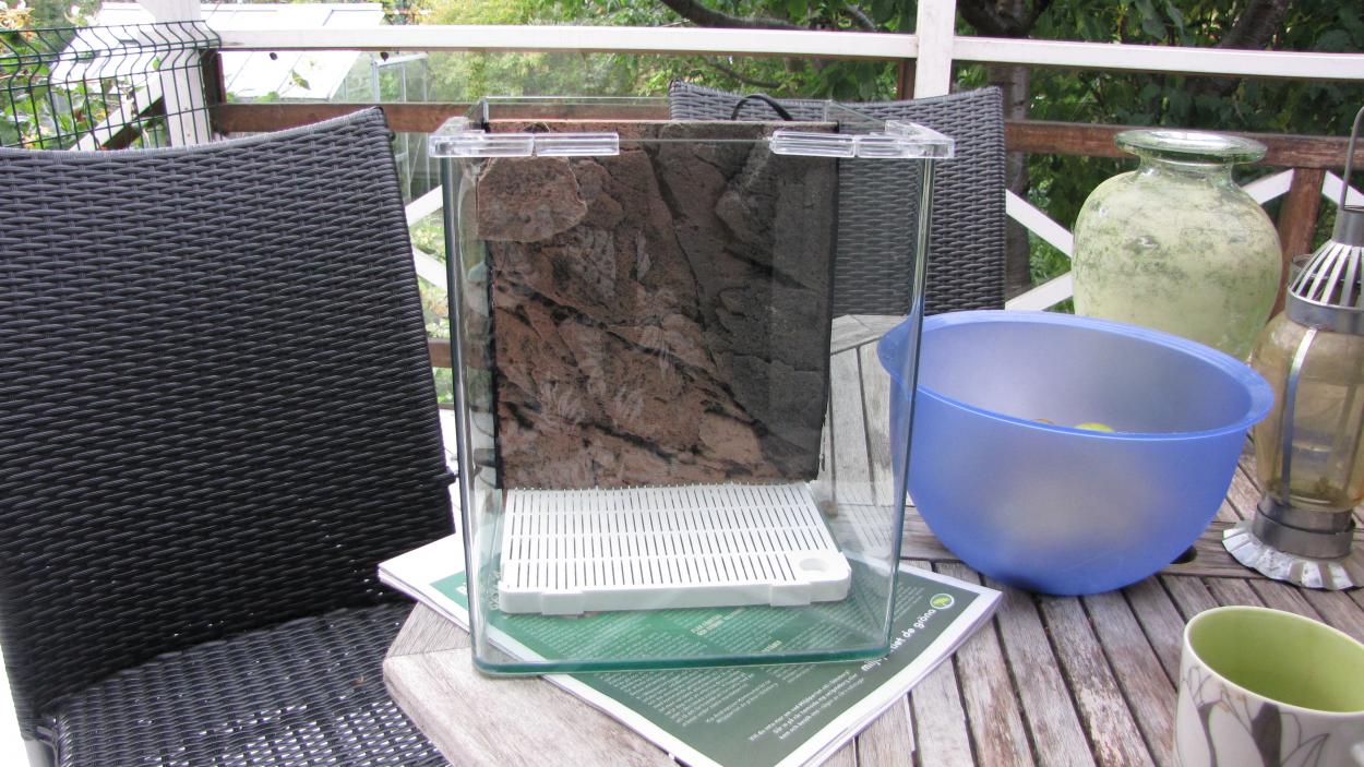 Sedan fick jag hem den lilla Dennerle-kuben på 20 liter också, som jag köpt av Anders. Han har monterat in den nya Slimline Gnejs i den här lilla rackaren - och gjort det redigt smart, med en del bakom s-linen där det sitter en liten käft-tyst eheim pumpskalle som drar vattnet genom filtermedia (kommer senare) via ett bottenfilter. Utblåset döljs av en bit s-line så man slipper se slangänden. Jag drar in några bilder på detta!