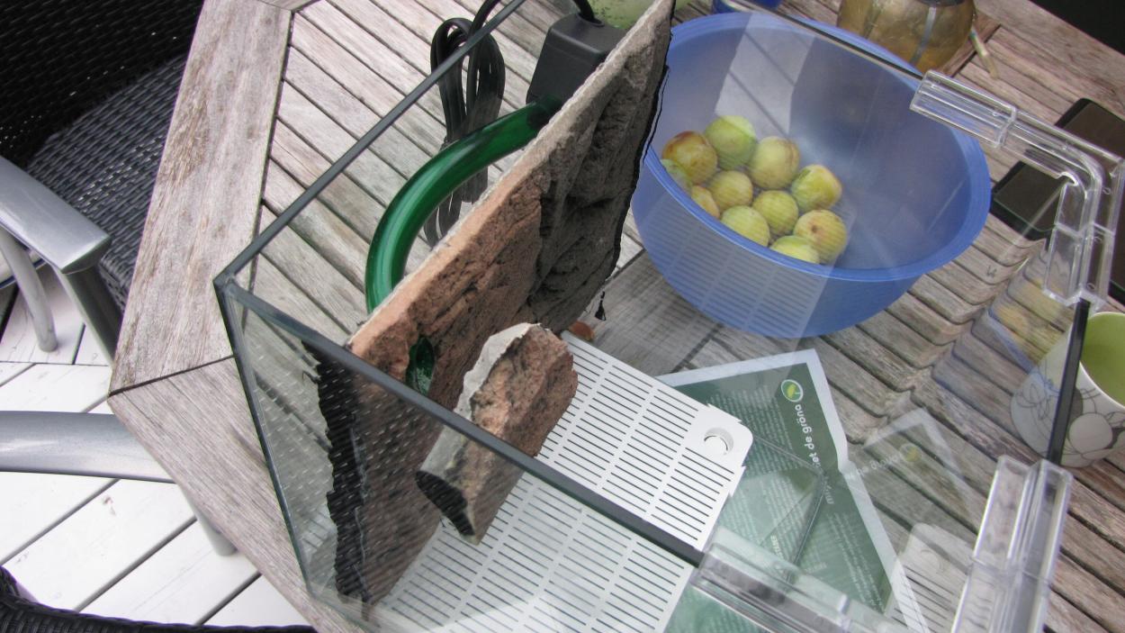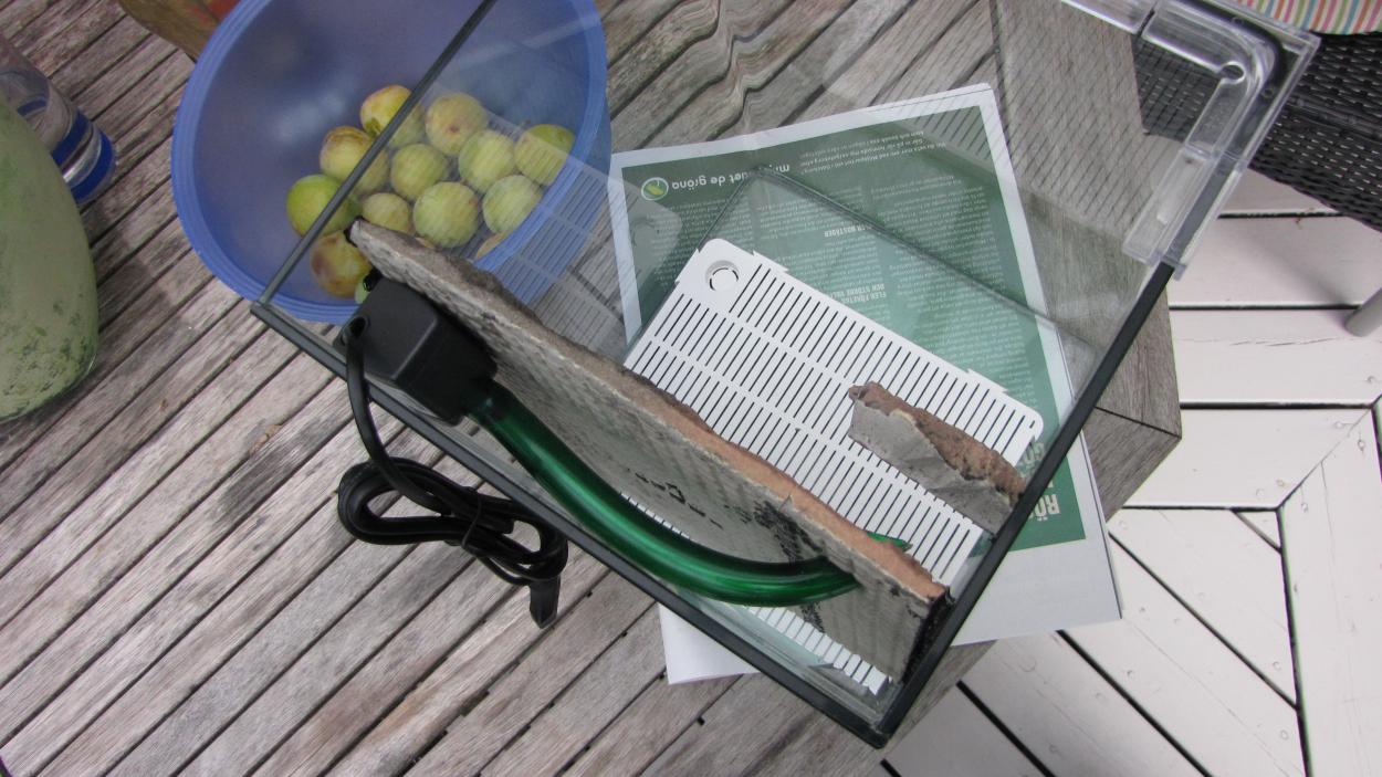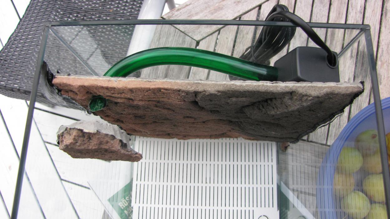 Har ett pumphuvud som ger allt för stark ström så allt åker omkring som i en tvättmaskin så det fick jag plocka ur. Vill ha detta i allafall för att göra ett stort innerfilter av grovporig filtermatta och pumphuvudet, nu har jag nog hittat en lösning.