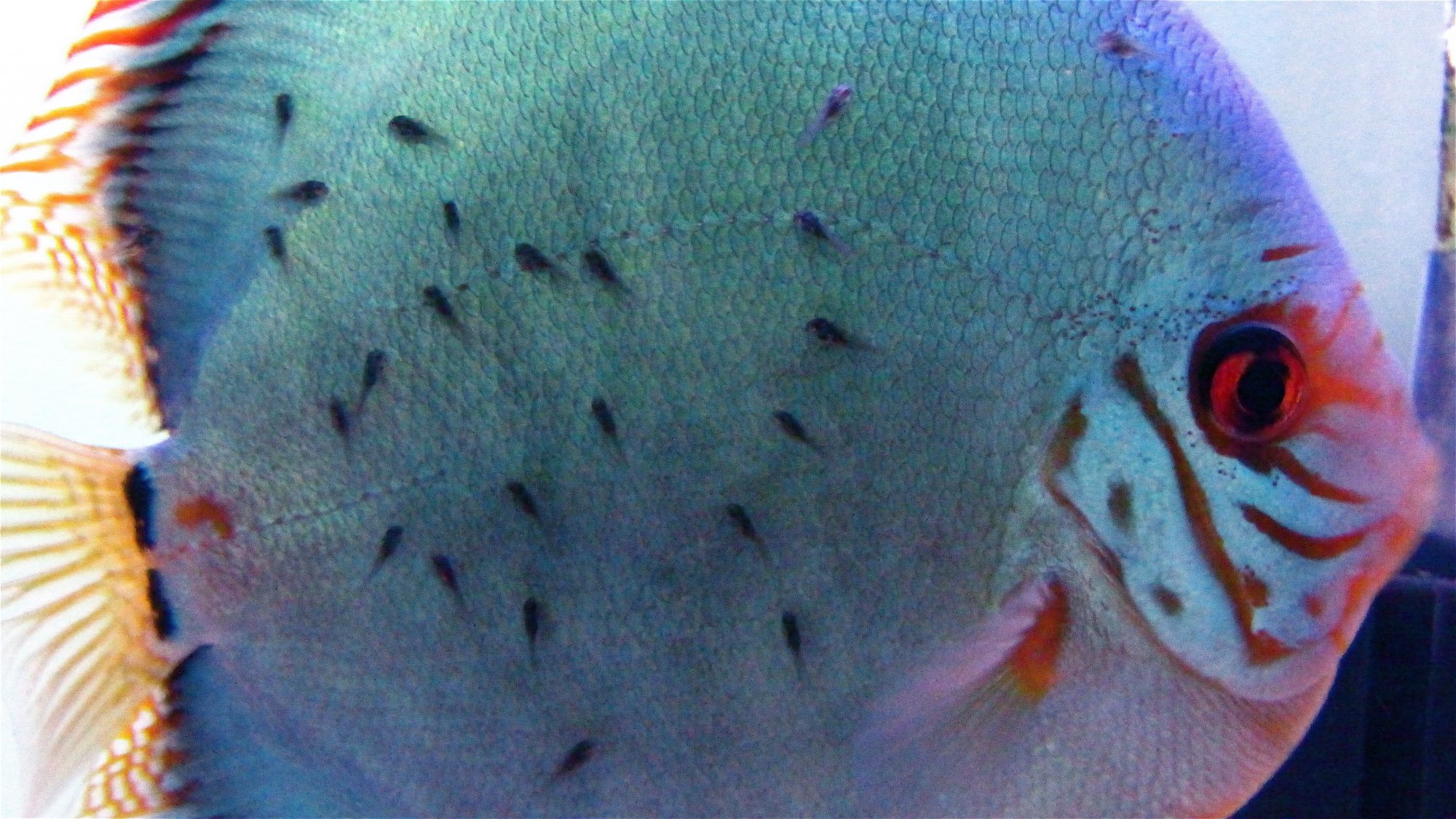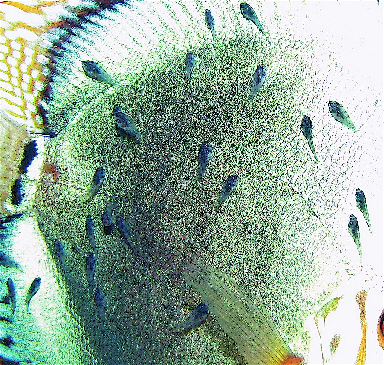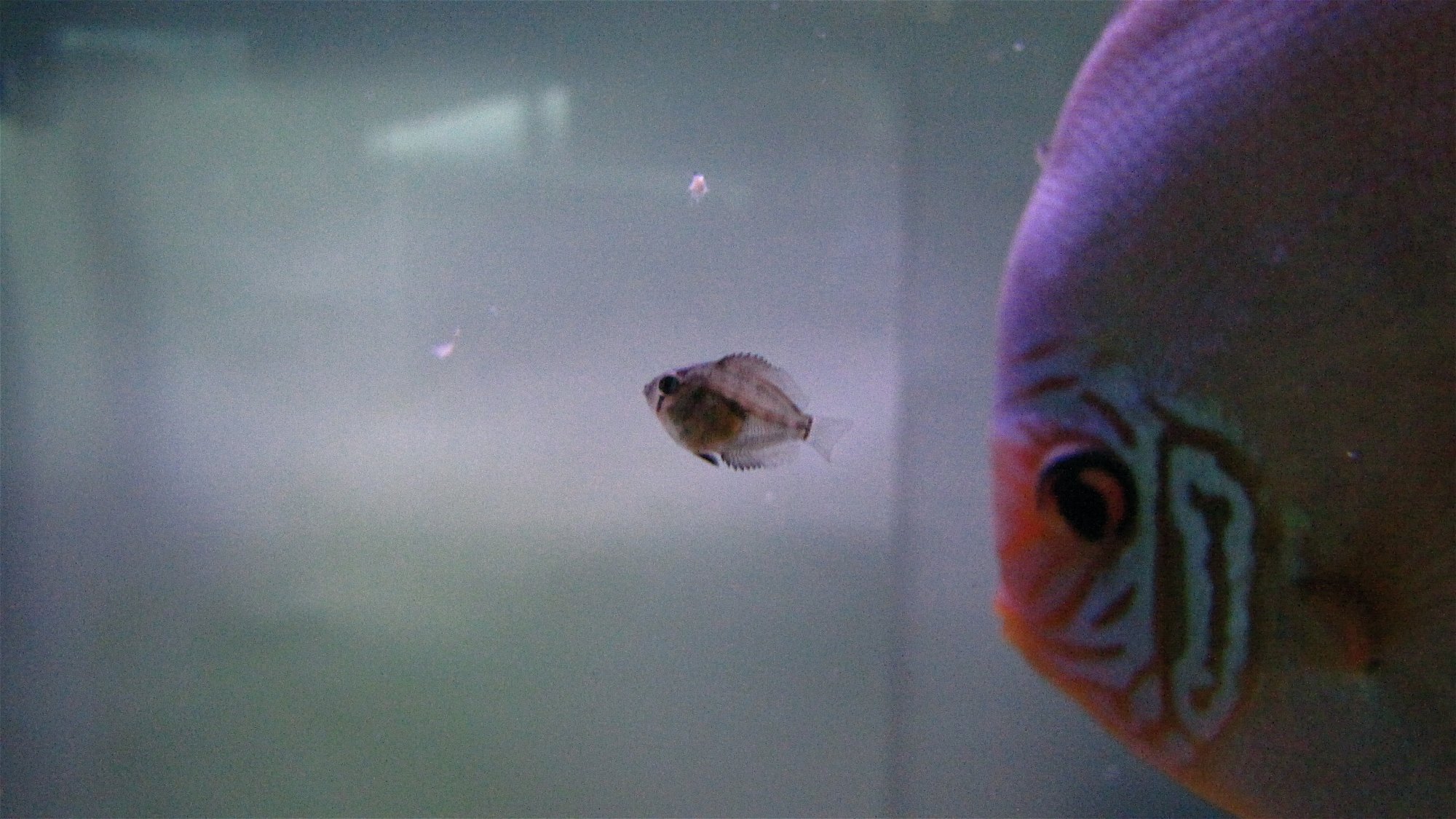 Min inställning är att ynglen får gå hos föräldrarna så länge de kan. Oftast stryker merparten med efter ett tag - blir uppätna av andra fiskar, främst andra discusar.