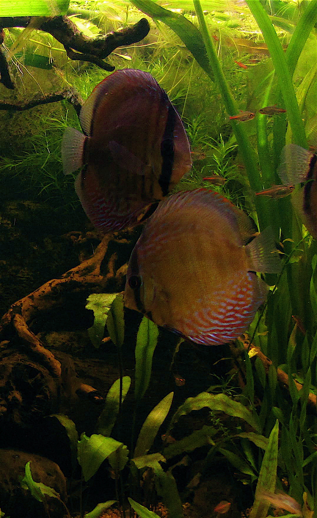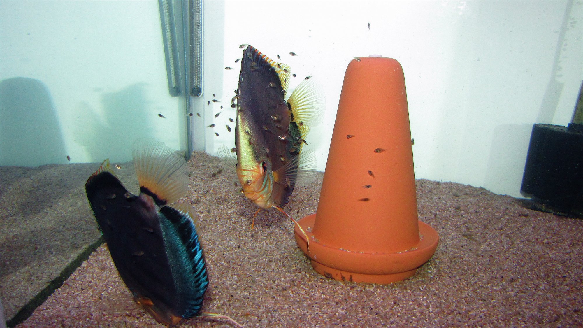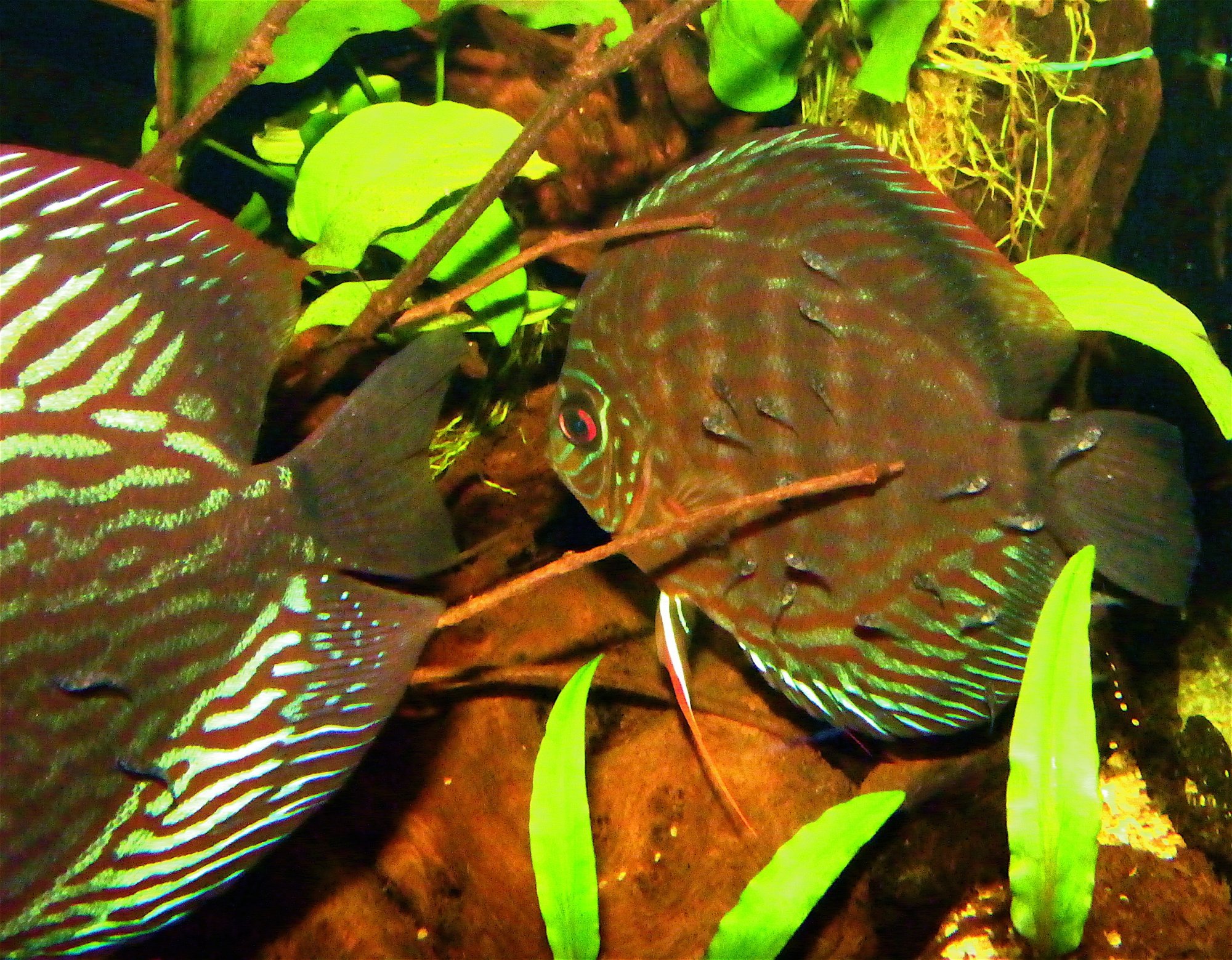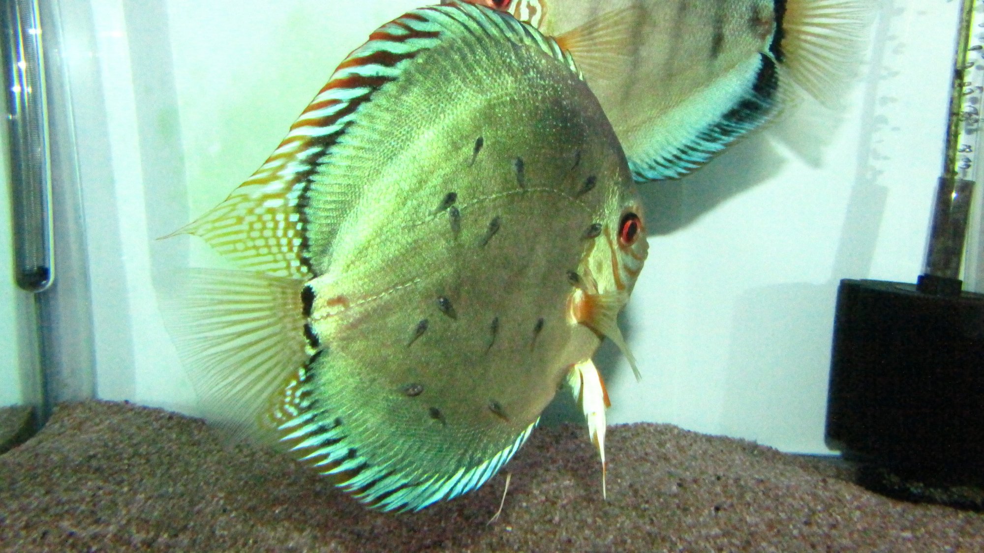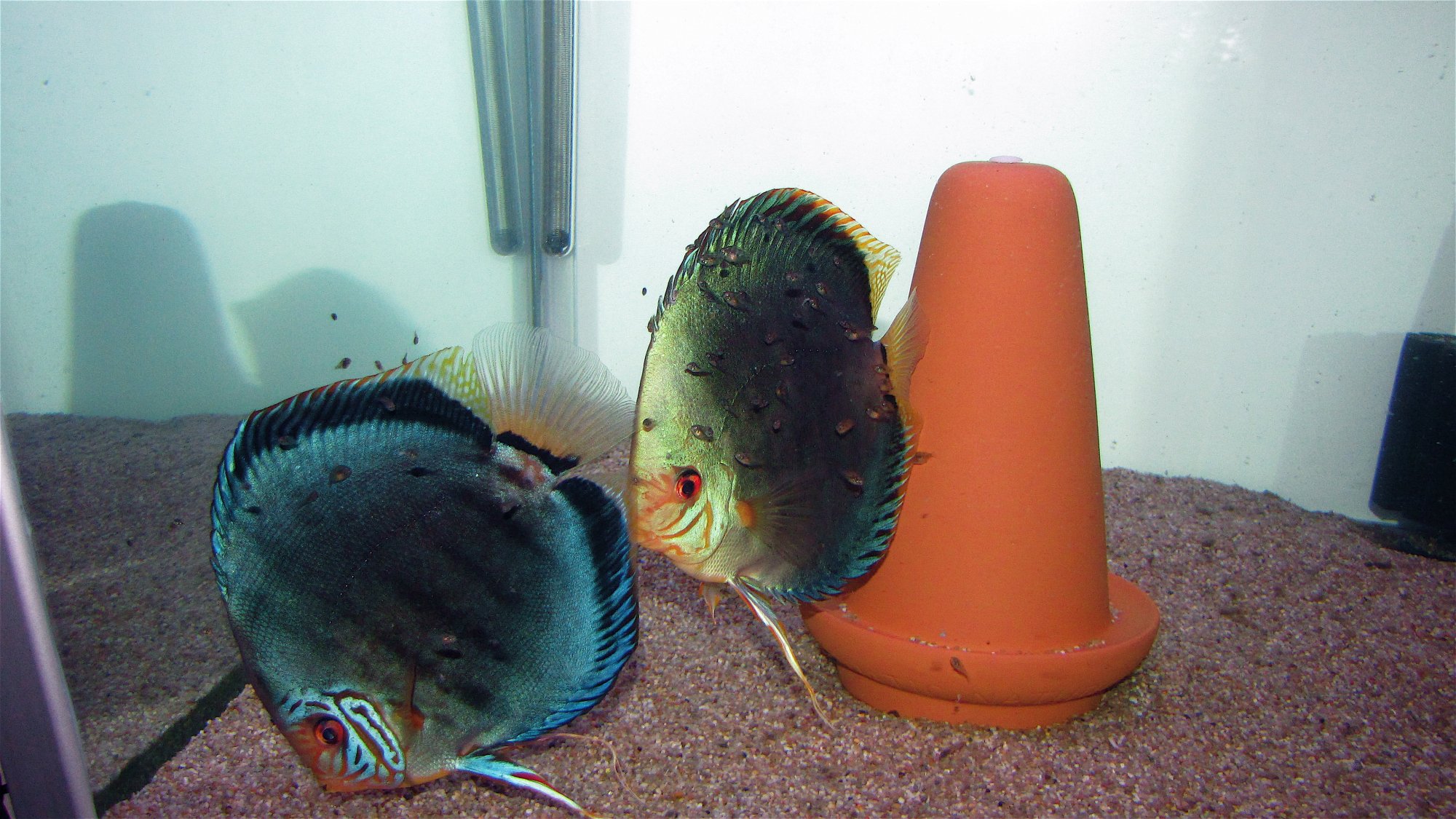 Många yngel från detta par klarade sig vidare. Jag har en kompis, Bosse, som i perioder drar upp lite Discus hemma. Han har fått Solid Turk-, och Röd Turk-yngel när de blivit ett par centimeter stora.