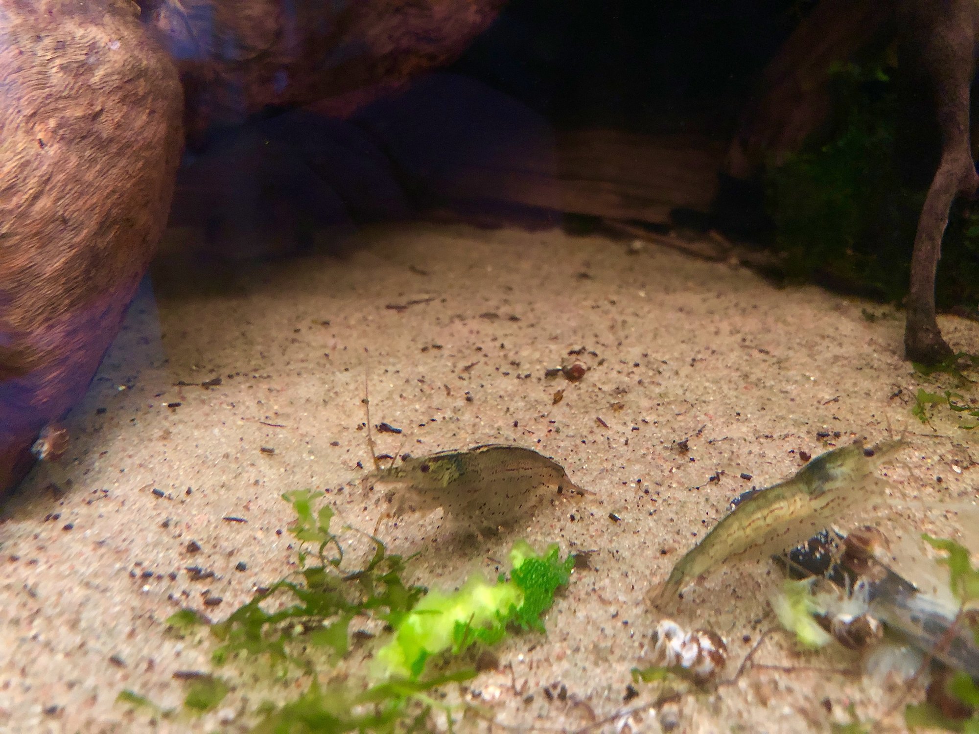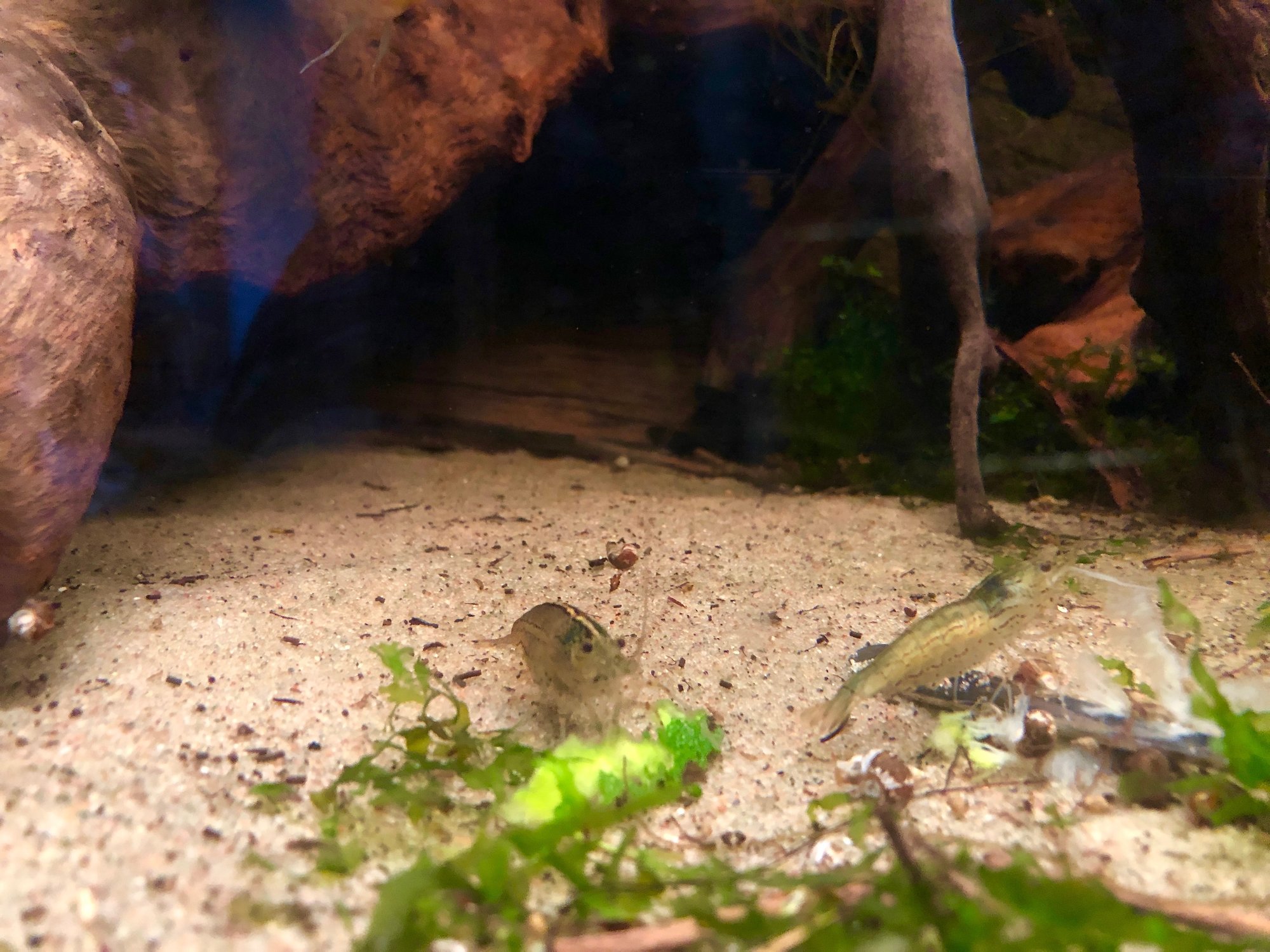 Som du ser finns inte tillstymmelse till fiskbajs - två Amanoräkor käkar rester av Zucchini, som jag brukar ge goldnuggetarna, uppträtt på en tesked.