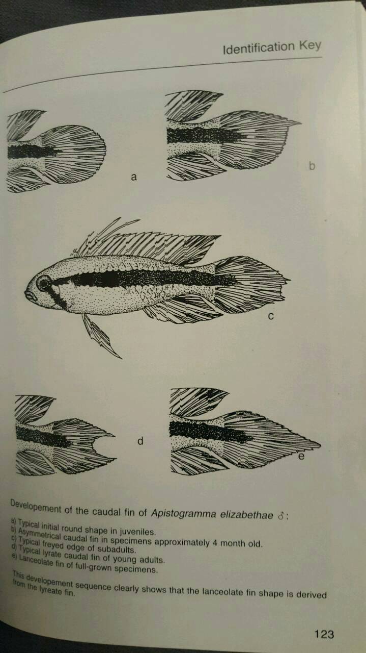 Inger och Maths, av någon anledning ser ni inte bilden jag lade in ovan. Bilden (ålderdomlig, visst - men ändå med adekvat information) visar de övergångsformer, i ålder, hos A. elizabethae-hanar, som i fullvuxen ålder får en lansformad (lanceolate) stjärtfena, liknande A. agassizii.