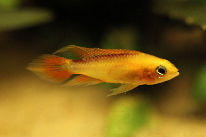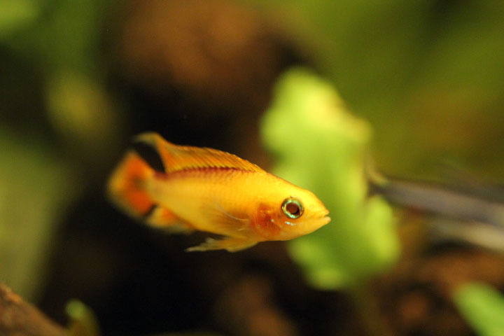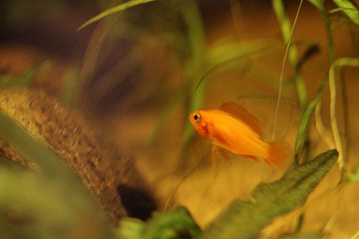 Så några bilder i stället, väldigt suddig på honan som befinner sig långt in i karet och vaktar sin kokosnöt, och sen pappan förstås. Några av er kanske inte gillar just den här färgvarianten "firered", jag gör det i alla fall