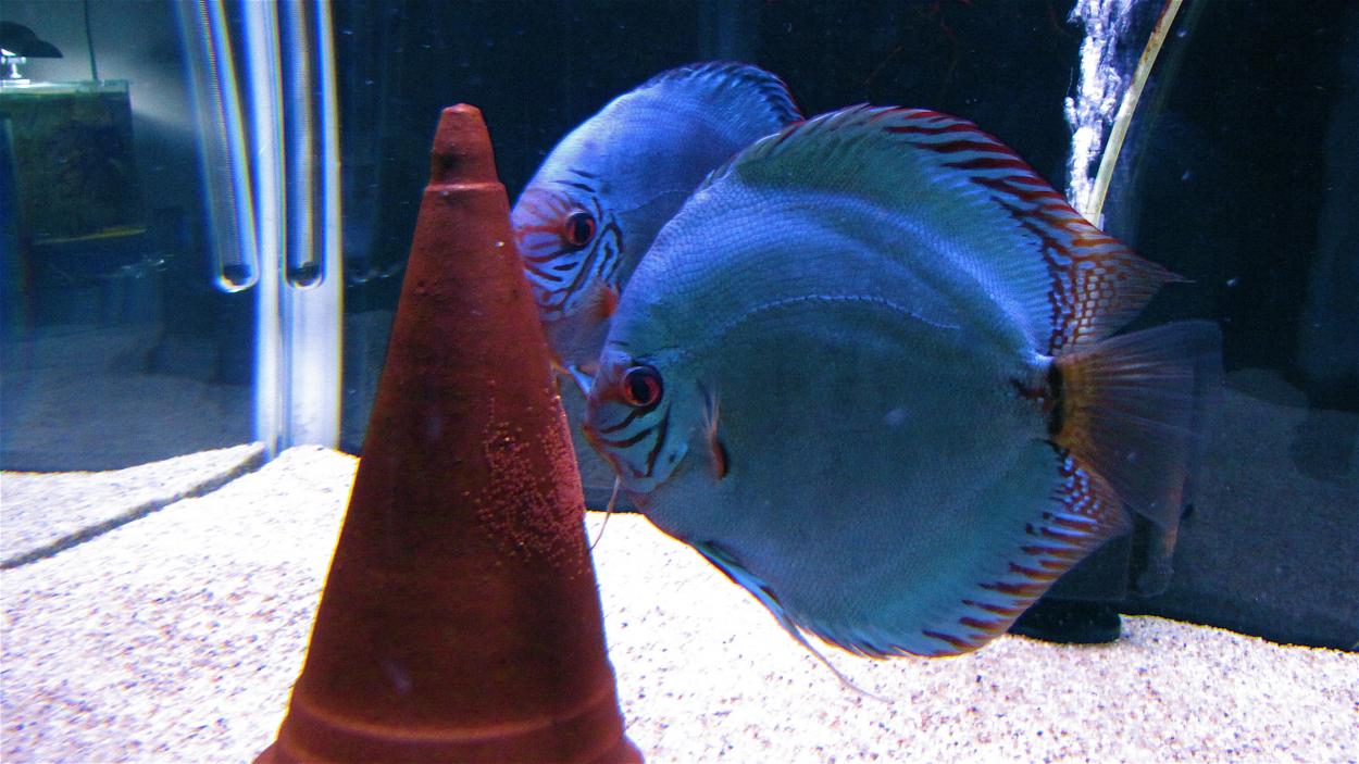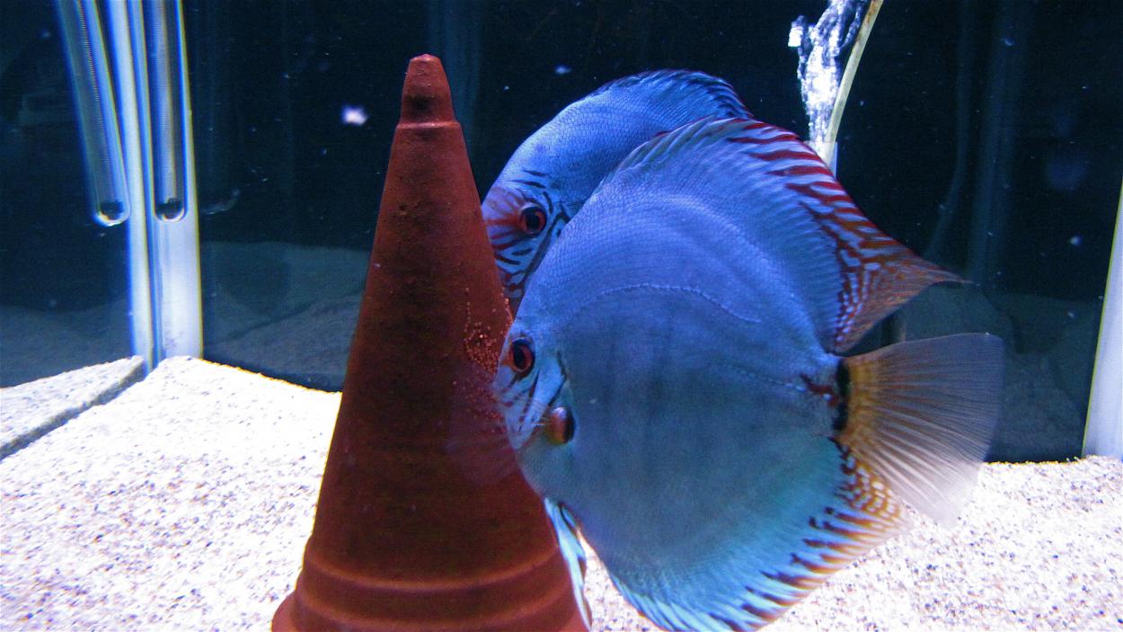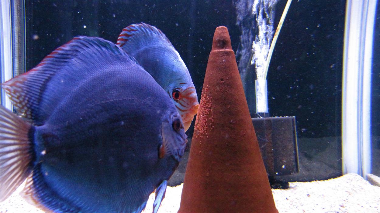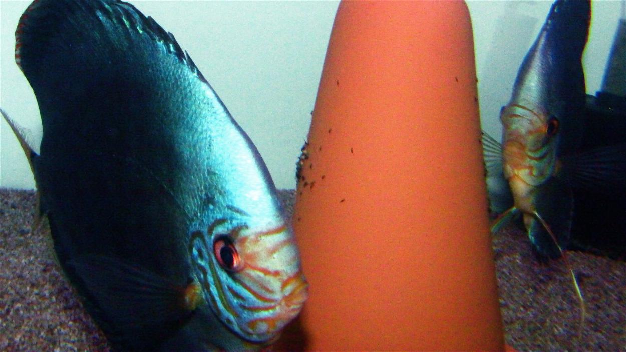 Men med risk för att bli alldeles helt galet odräglig måste jag säga att de är så himla mysiga Diskusarna. Nu börjar det bli så att om jag går in i rummet så kommer samtliga fram och kollar husse. Flera äter om jag ger frystorkad Artemia som lagts att dra i Aqua-Kraut. De börjar plocka från ytan och en tror jag tyvärr har upptäckt mina KörsbärsräkorSedan är min helgulliga fru så himla engagerad i dem. Hon är uppe flera gånger dagligen och donar kring akvariet och kollar läget oftare än mig faktiskt. Så snart tål de nästan vad som helst kring karet.