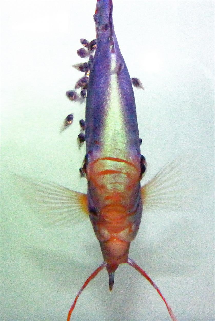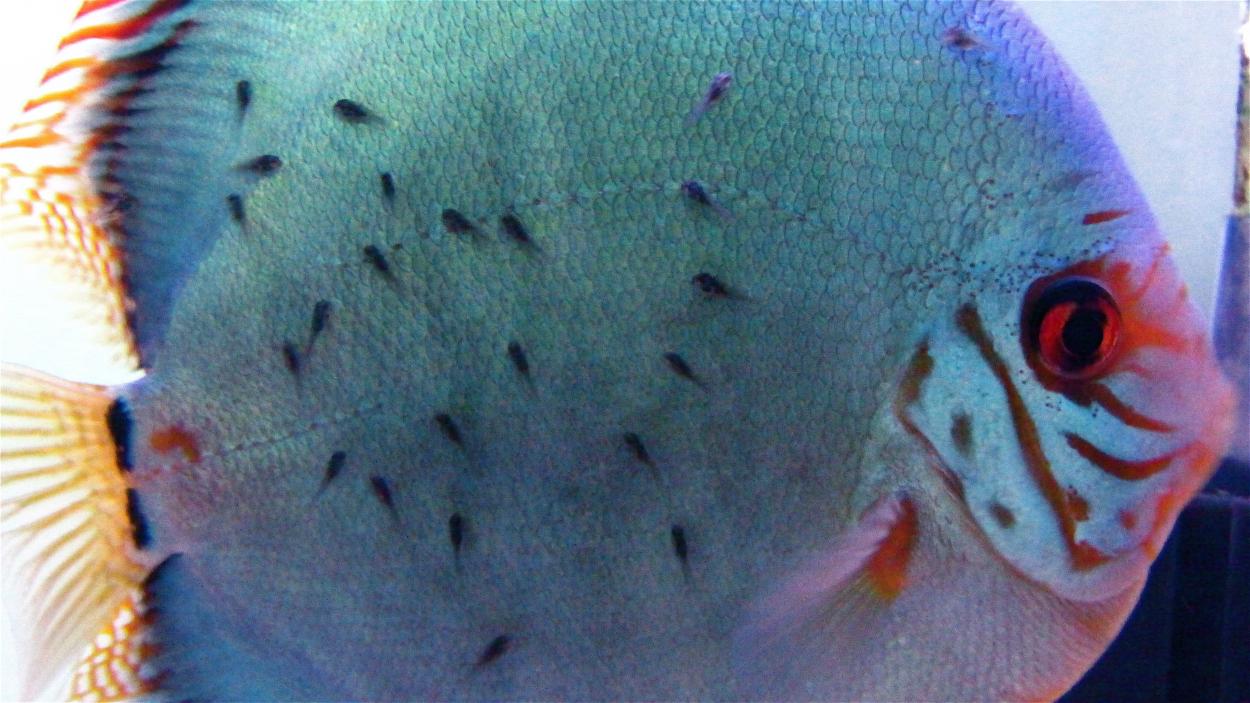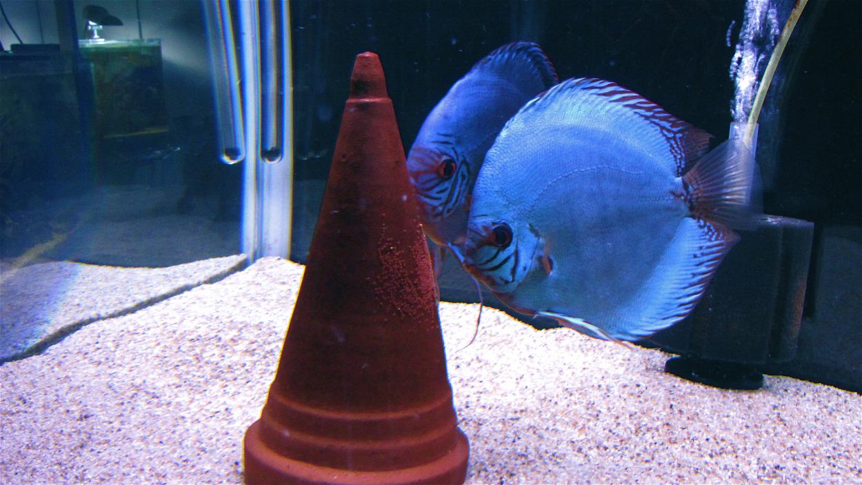 Men med risk för att bli alldeles helt galet odräglig måste jag säga att de är så himla mysiga Diskusarna. Nu börjar det bli så att om jag går in i rummet så kommer samtliga fram och kollar husse. Flera äter om jag ger frystorkad Artemia som lagts att dra i Aqua-Kraut. De börjar plocka från ytan och en tror jag tyvärr har upptäckt mina KörsbärsräkorSedan är min helgulliga fru så himla engagerad i dem. Hon är uppe flera gånger dagligen och donar kring akvariet och kollar läget oftare än mig faktiskt. Så snart tål de nästan vad som helst kring karet.