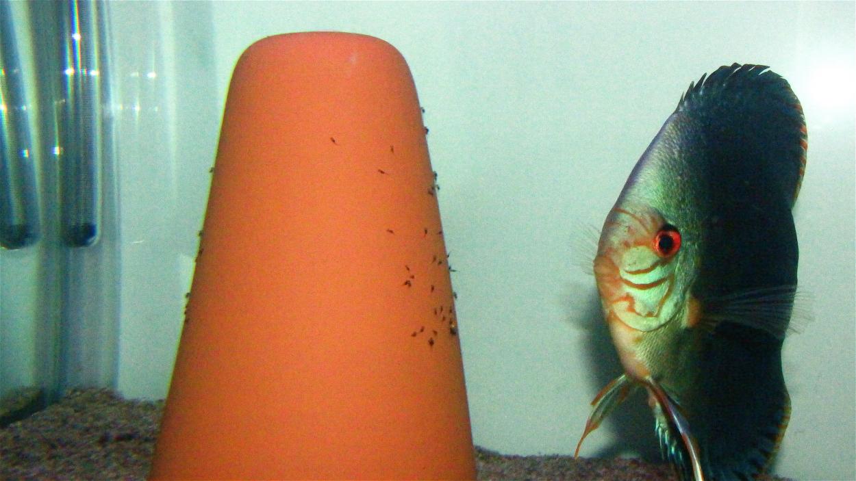 Jag hade svart bakgrund på tre sidor i 70-kuben där mina solidturkar gick. Jag blev otroligt förvånad över att ynglen hade så svårt att "fästa" på föräldrarna - de fick simma omkring och hämta ynglen överallt.