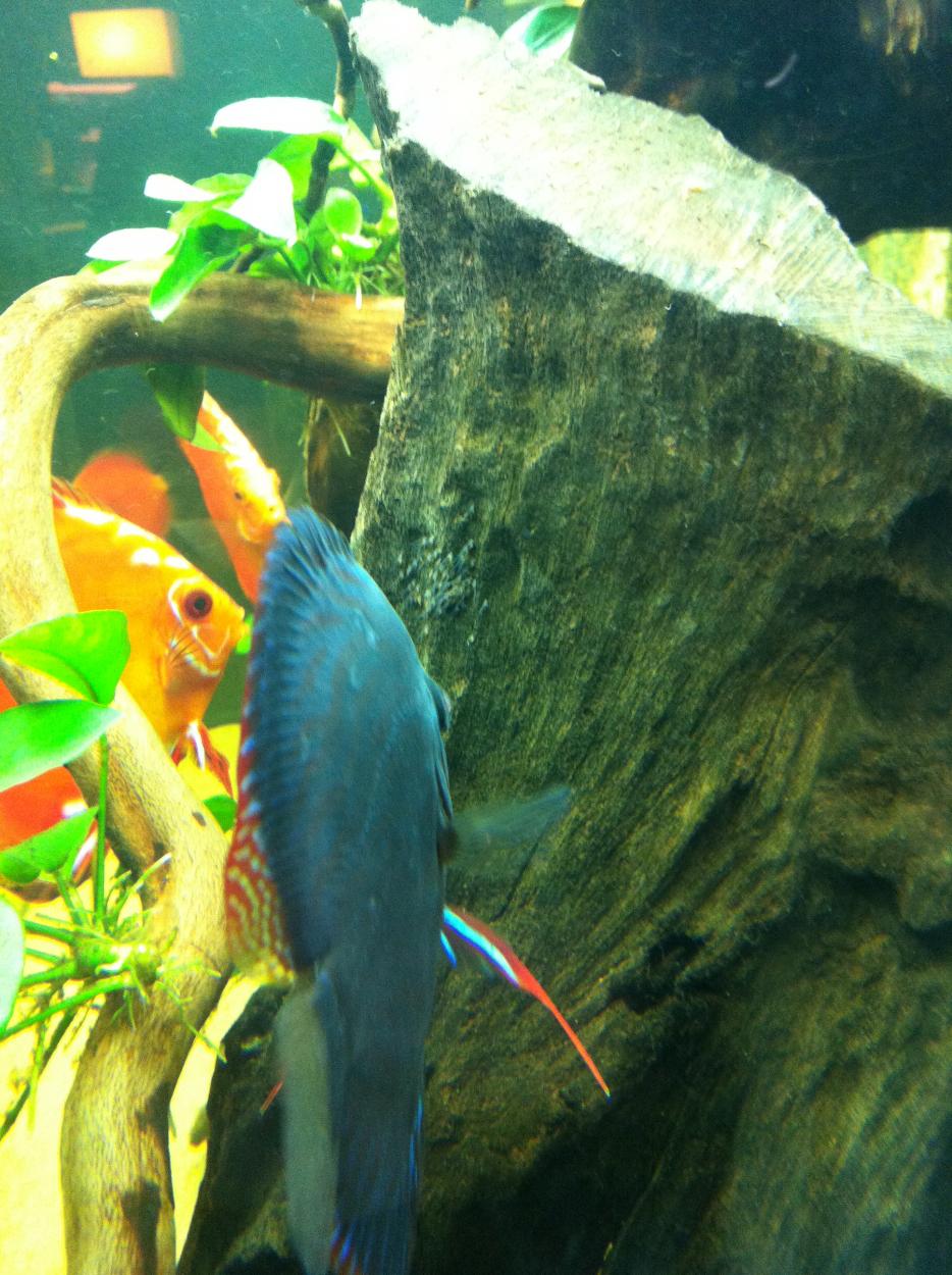 Fick problem med min rot, den började som sagt multna på ytan och det blev skitigt somfan i karet pga det. Lossnade massa smuts. Anyway, fick då ta ut den, kvar blev inte så mycket, den gjorde lixom hela inredningen. Detta gjorde mina stackars fiskar stressade och jag såg tydligt hur deras beteende förändrades till det sämre. De vill helt enkelt ha det mer dunkelt och mysigt så jag har tagit tag i det nu.