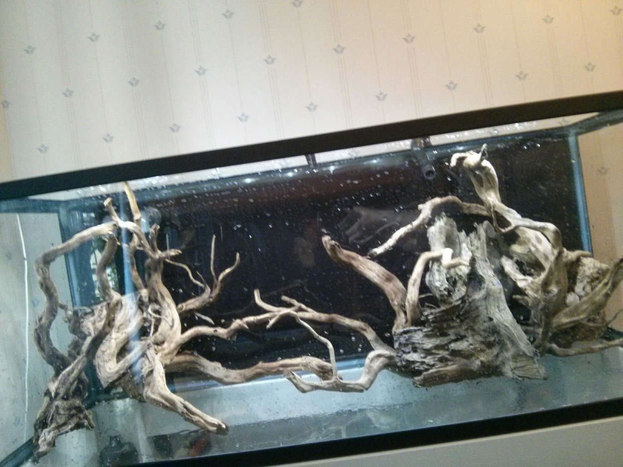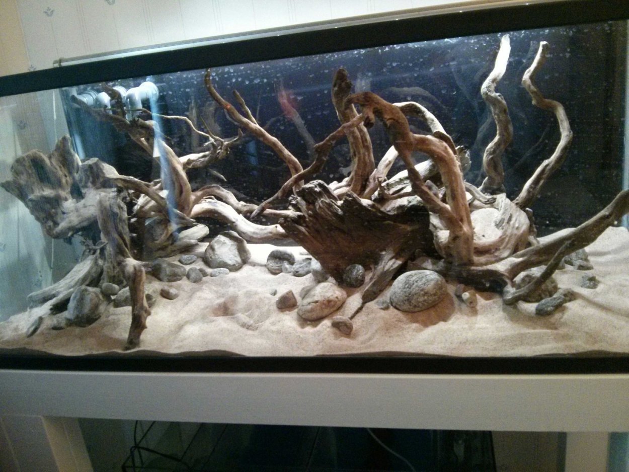 Sen lite grönt vallis på det, som kontrasterar mot pinnar och stenar, och lite schletna gamla löv på bottne ,eklök/catappa. Blir kasnke bra. Hade gärna haft något mycket grönre grus att strössla lite runt där stenarna ligger och i knaterna runt rötterna, så det inte blir lika skarp övergång mellan stenar och sand...Lämna en kommentar: