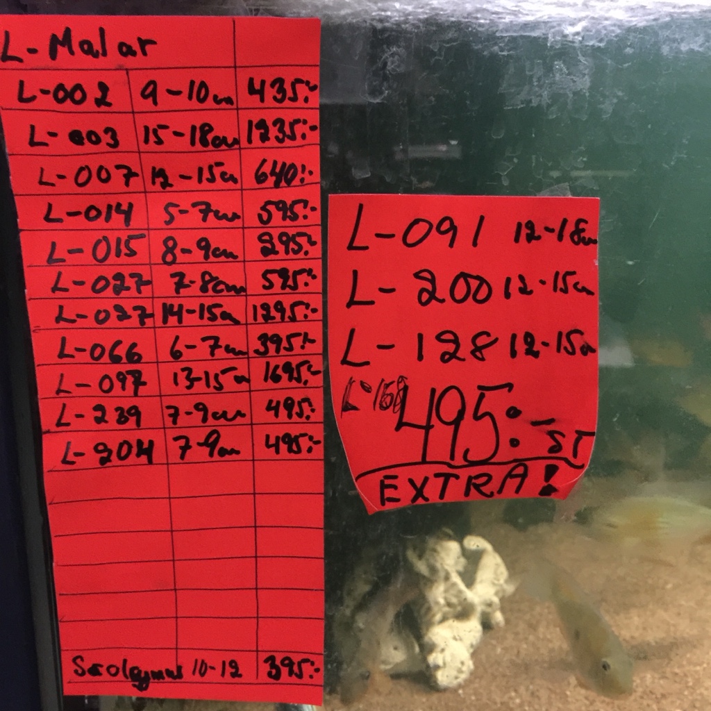 Jag vill ha små L-malar! Mina L201 blir inte mer än 10 cm. Den storleken är perfekt. : ) Får kasnke leta runt lite själv också men svårt att se på artbeskrivningar hur skygga de är och hur svåra de är att få tag på, pris etc.. : )
