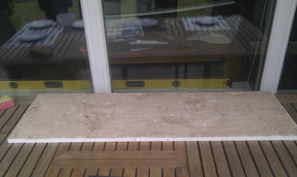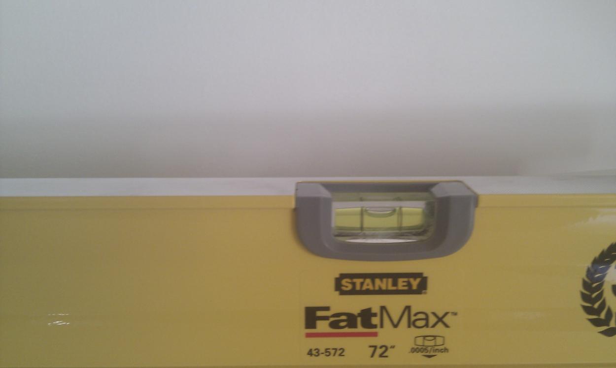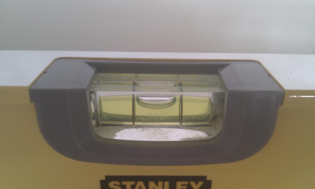 En intressant notering är att bänken står princip i våg (men inte 100%), bubblan är precis innanför strecken (off set vänster) från mitten till vänsterkanten helt i våg från mitten till högerkanten. (65 cm vattenpass). Men jag upptäckte att golvet off center mitten höger på är lite lägre, det tredje benet från vänster mot väggen har ingen kontakt med golvet, utan "svävar" 0,5 mm, här får jag chimsa in plastremsor. Efter ett tips från Bluewing så blir det nog att tillverka dessa från lock till matlådor.