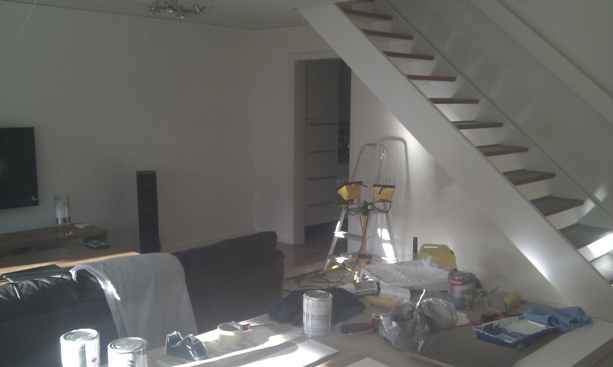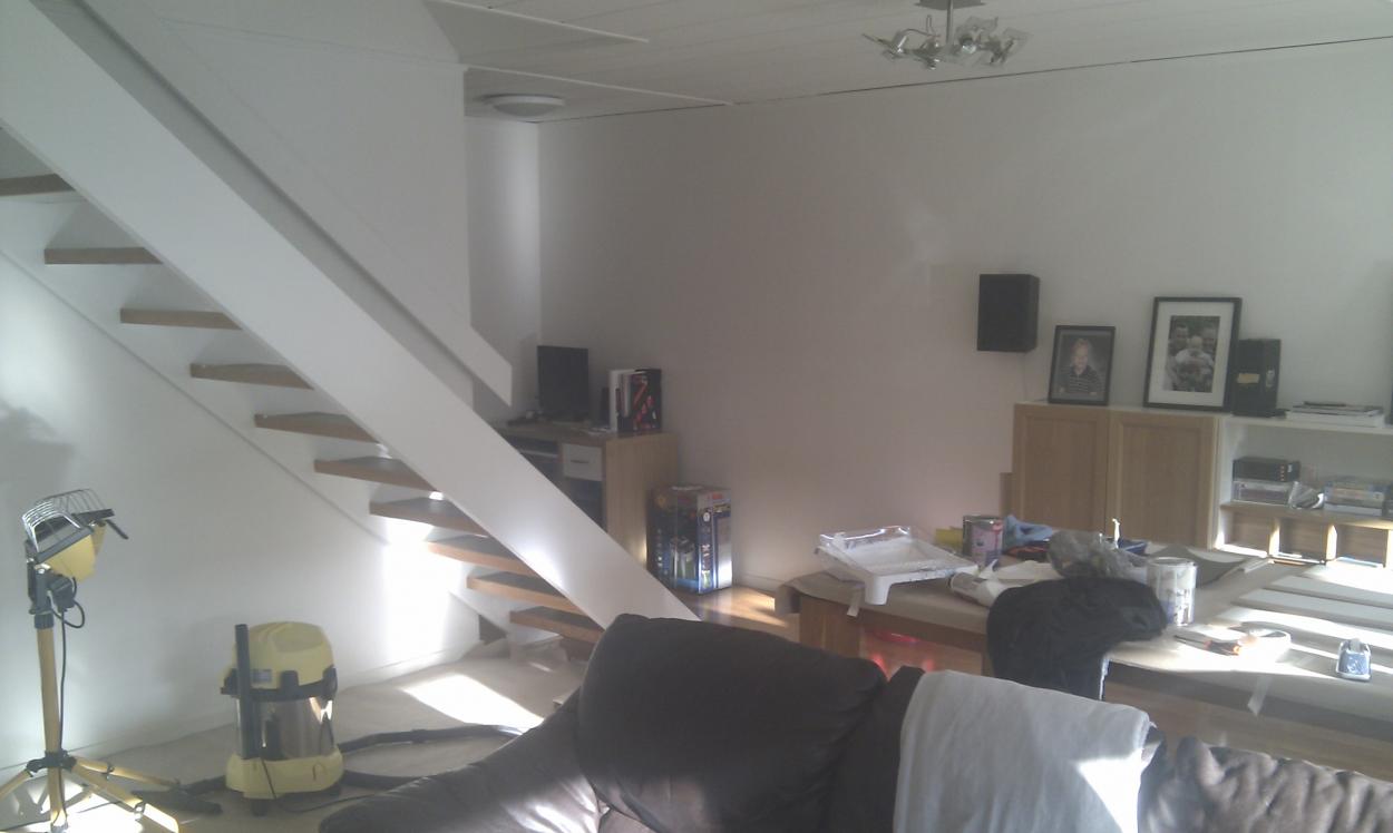 Efter att vi lagt barnen och jag monterat ihop bänken så fick Fru Erikderek hjälpte till med att flytta runt bänken i vardagsrummet, det vi kom fram till är att under trappan passar mest estetiskt, men Peter du har en poäng med solljus, en del av den väggen får direkt solljus under seneftermiddagen, men det hoppas jag lösa med markisen och persienner (riskerar att bli omständligt dock).