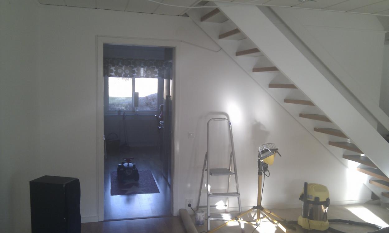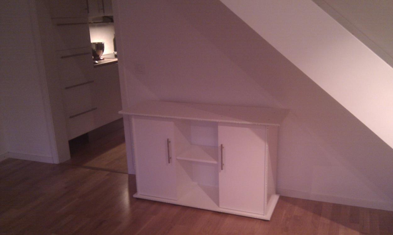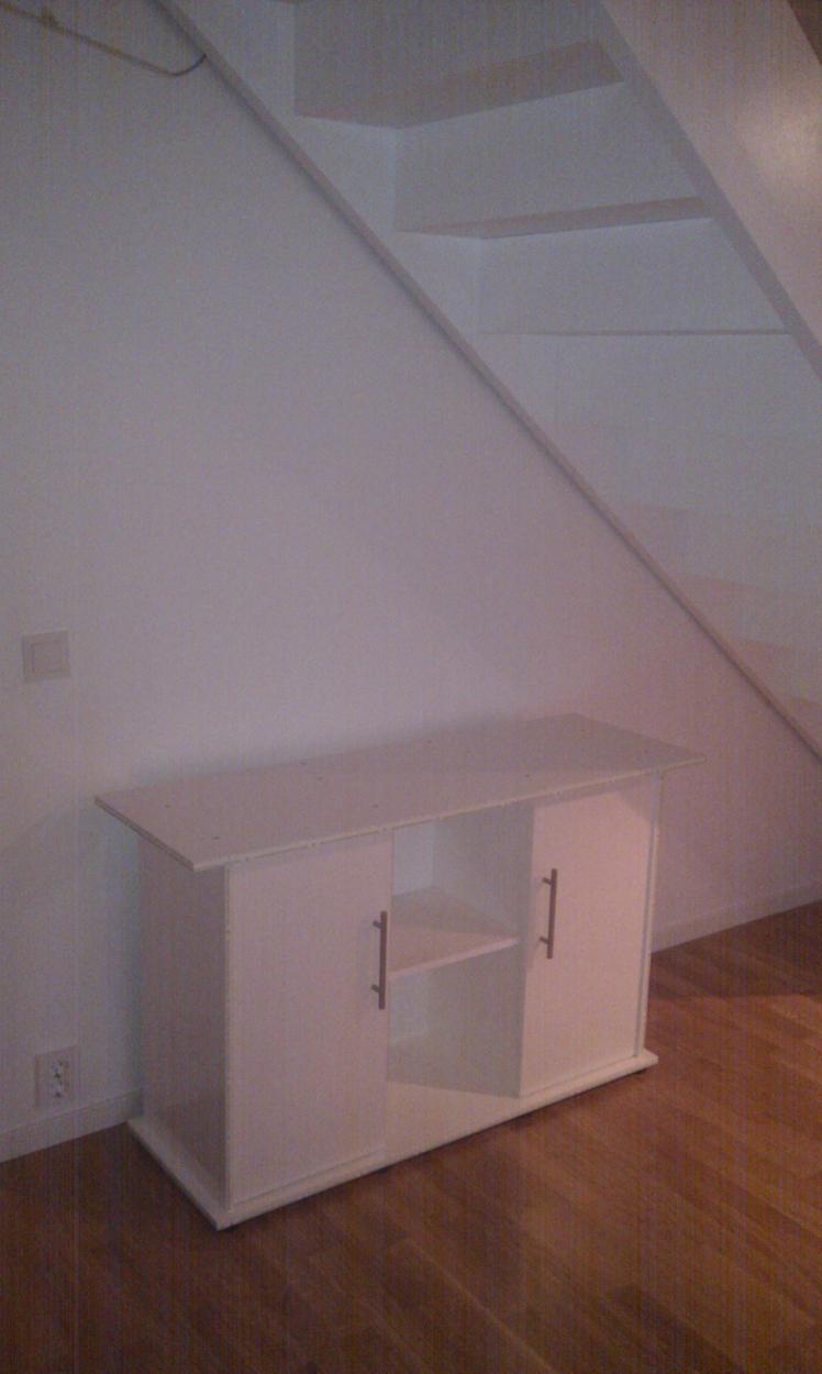 Jag bifogar ritning samt några kort (tagna med mobilkameran), tanken var att placera akvariet under trappan mot skjutdörrsöppningen till köket, Jag ser risken att det kommer se ut som akvariet är "intryckt/ undantryckt under trappan. Kreativa idéer mottages gärna, med reservation att total ommöblering inte är ett alternativ, utan det handlar om att packa akvariet i förhållande till övrigt möblemang.