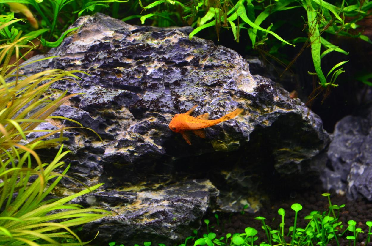 Den röda ancistrusen har verkligen en favoritsten - hen ligger där nästan jämt