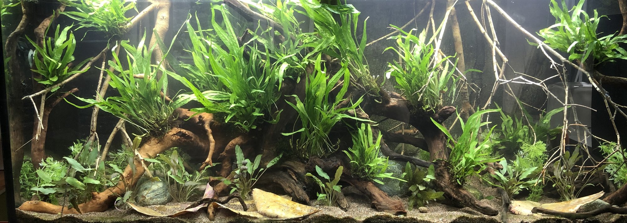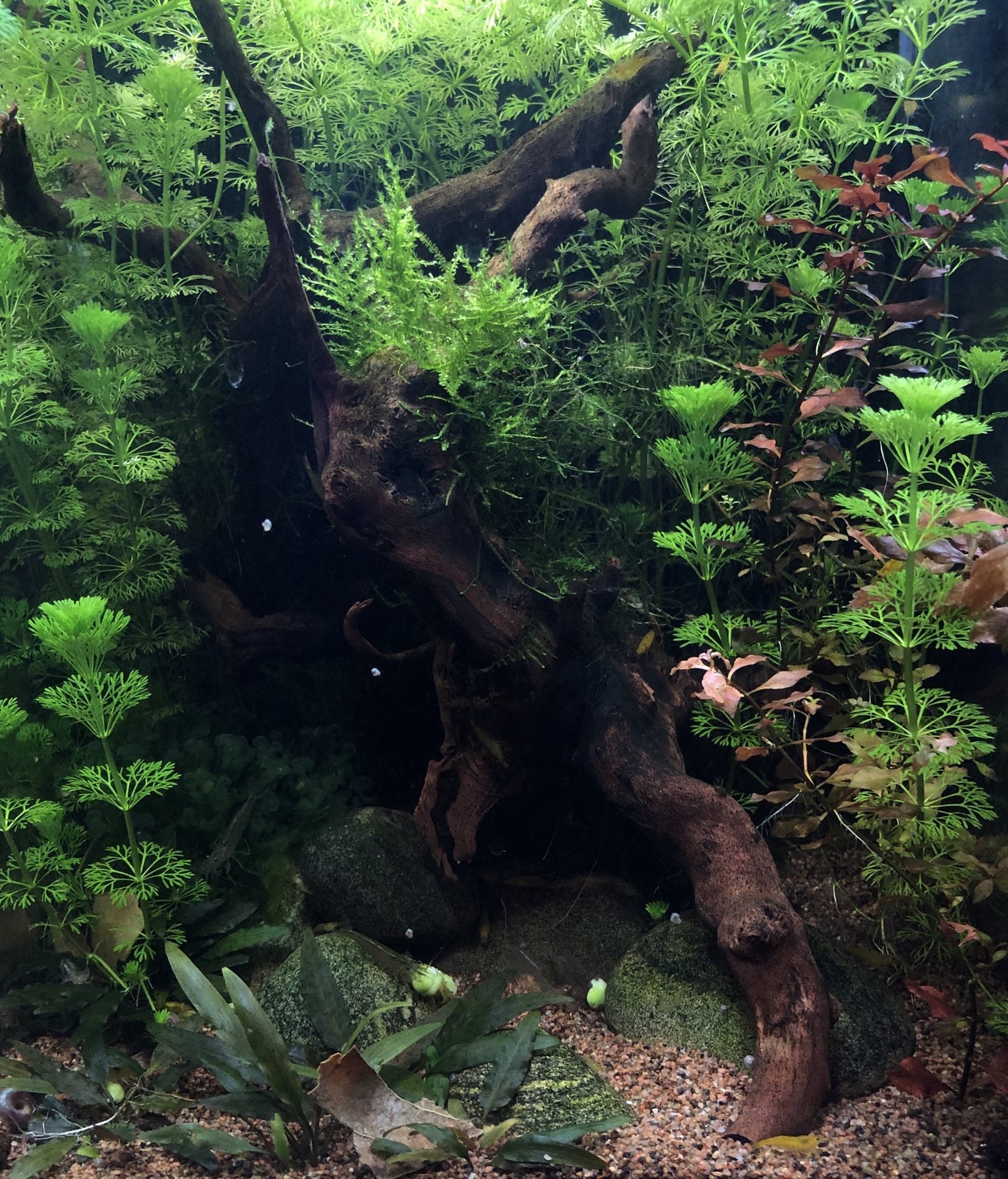 Väldigt fint, men en synpunkt. Det är väldigt kompakt med inredning i mitten, dit drar sig blicken vilket förminskar karet. Den där öppna platsen i mitten som suger in blicken med inredning på sidorna försvinner. Det gör inredningen lite "platt" och tyvärr kommer den bli än mer platt när växterna kommer igång, blir en vägg ett par decimeter in i karet.
