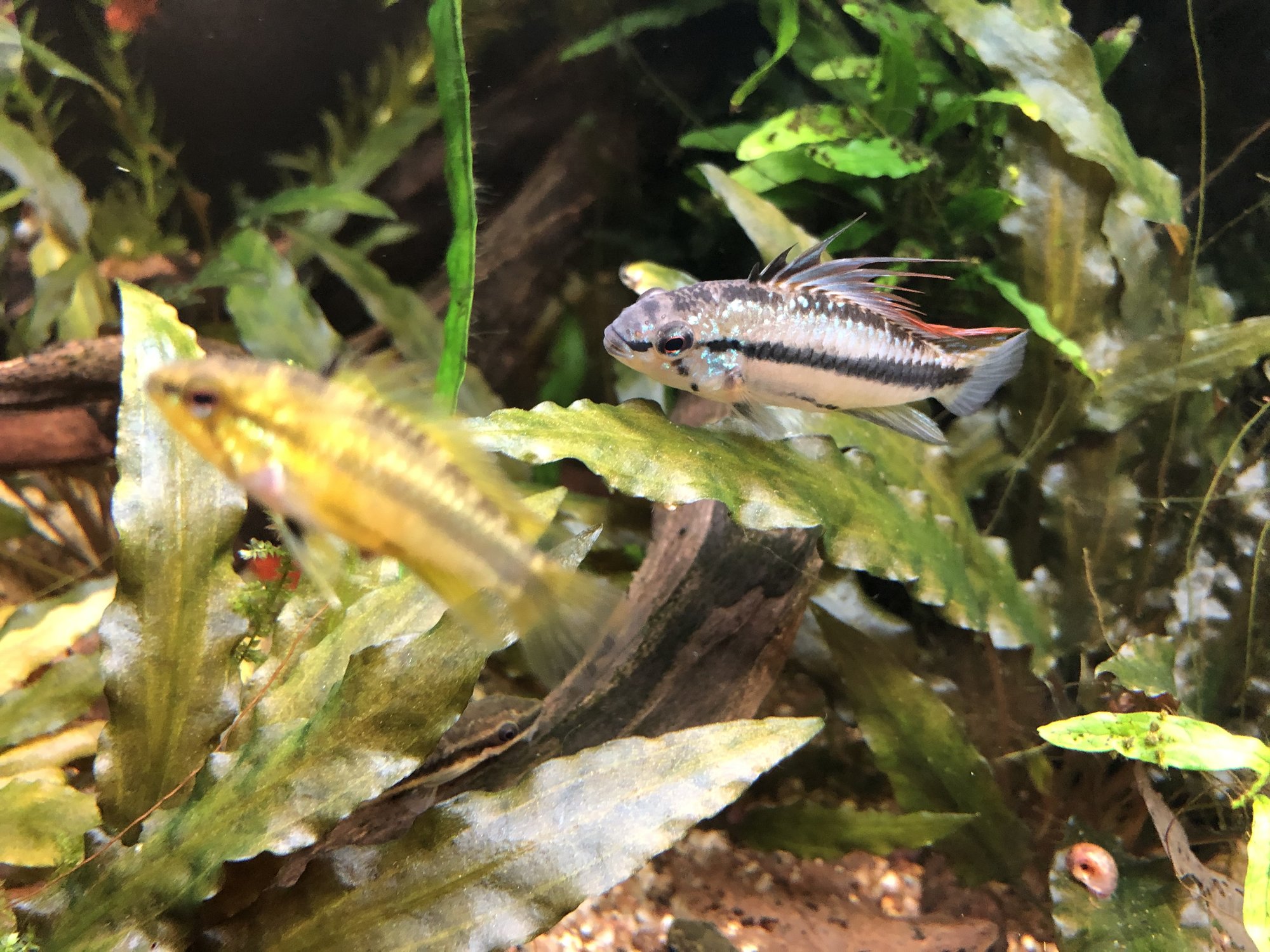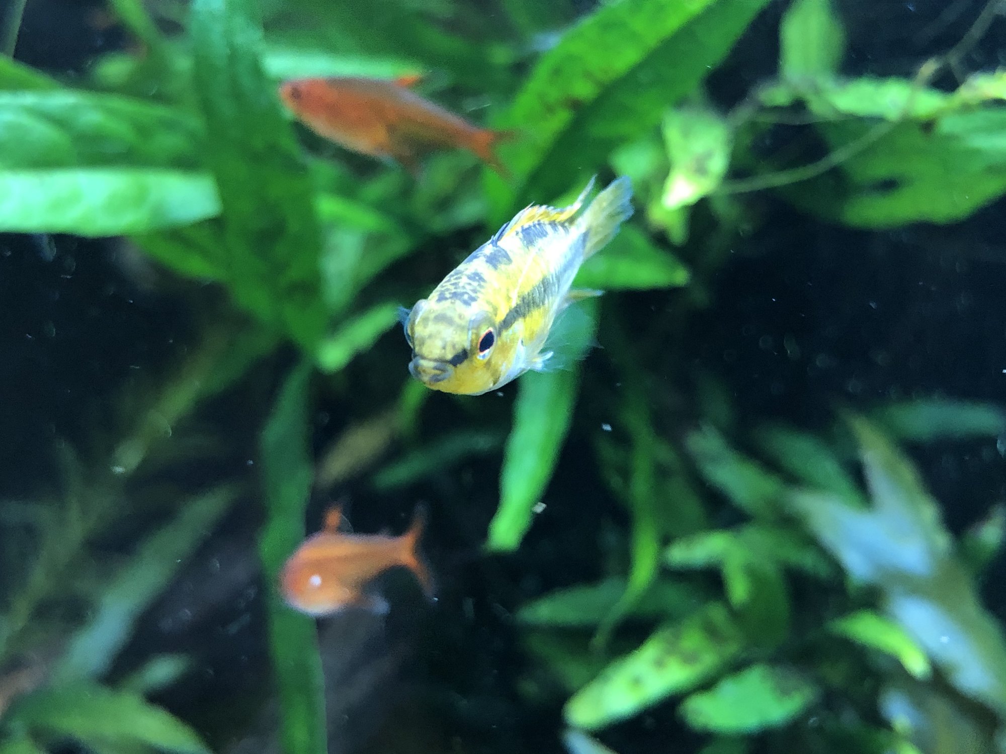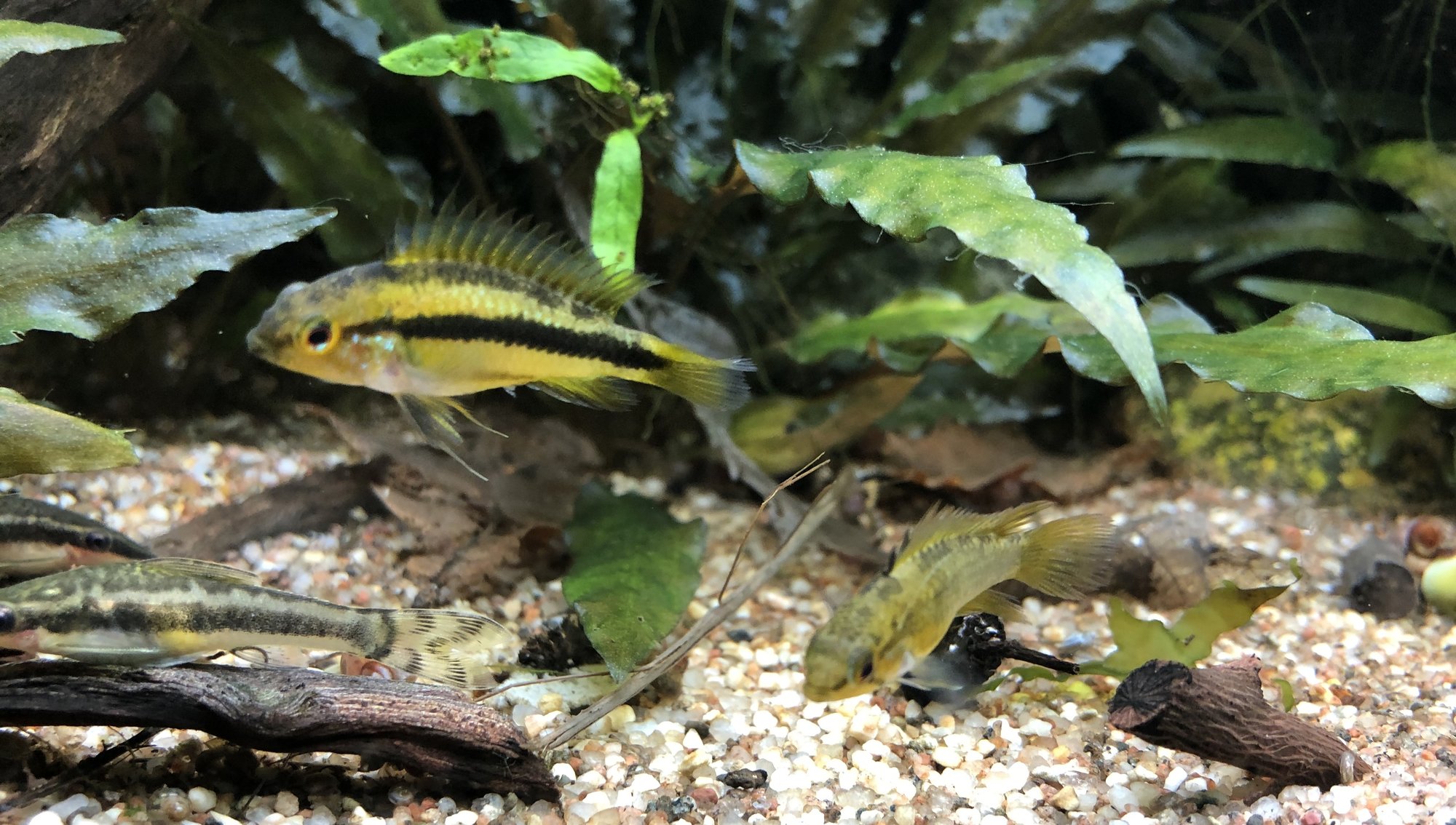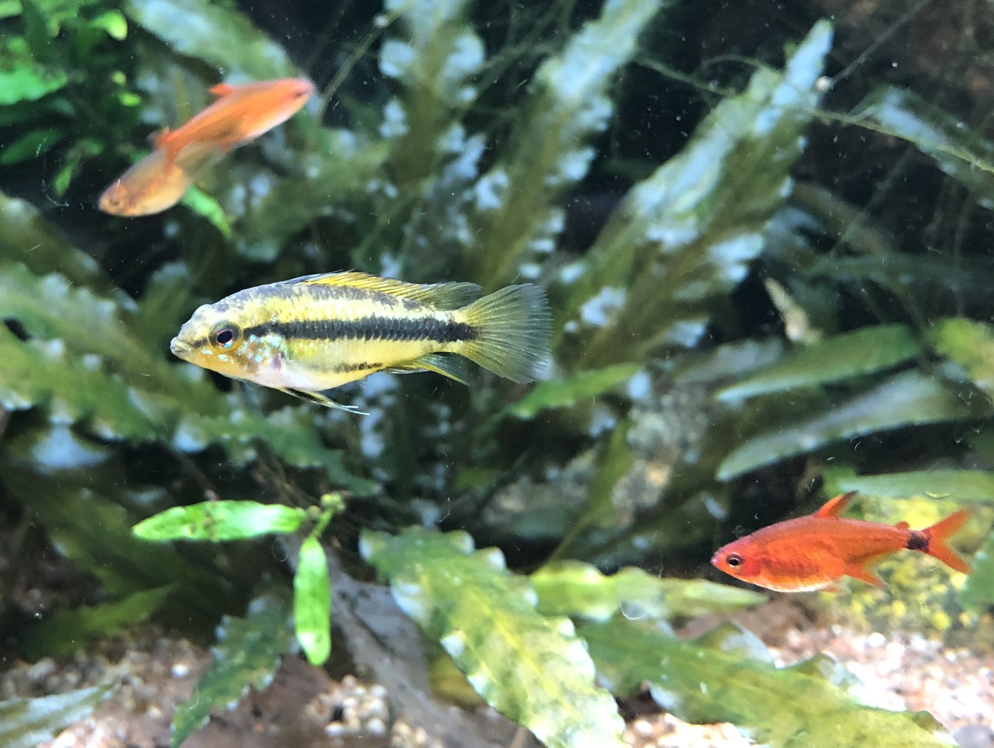 Ap. Trifasciatorna verkar må bra. Det var ju en av honorna som hade synliga maskar men behandlingen synes ha fungerat och hon är redan lite rundare. Hanen glider runt och visar upp sig för honorna när han får tillfälle. Det är inget synligt bråk mellan honorna så båda går fortfarande kvar i samma kar. Ska, som jag tidigare nämnt, åter lägga löv på botten när andra delen av behandlingen är avklarad. Aporna verkade uppskatta lövlagret när det fanns där tidigare. Bortsett från maskproblemet tidigare är jag väldigt nöjd över karets utveckling. Aporna är spännande att titta på och karet ger mig en känsla av lugn. Tetrorna mår bra och ynglar av sig ibland. Ev. ska röda smyckestetror tillsättas senare. Eller så chansar jag och låter dem gå i storkaret istället.Kommentar