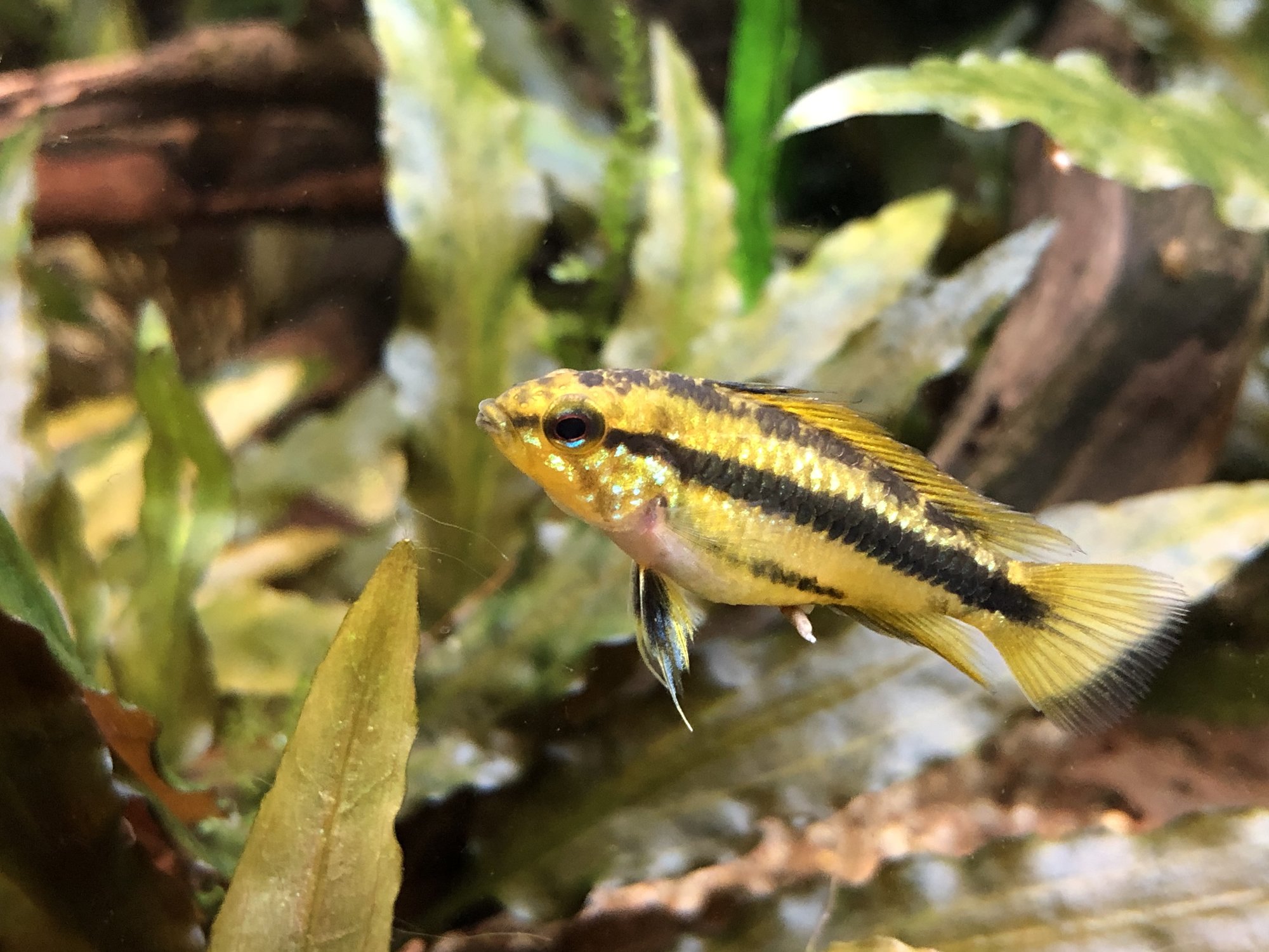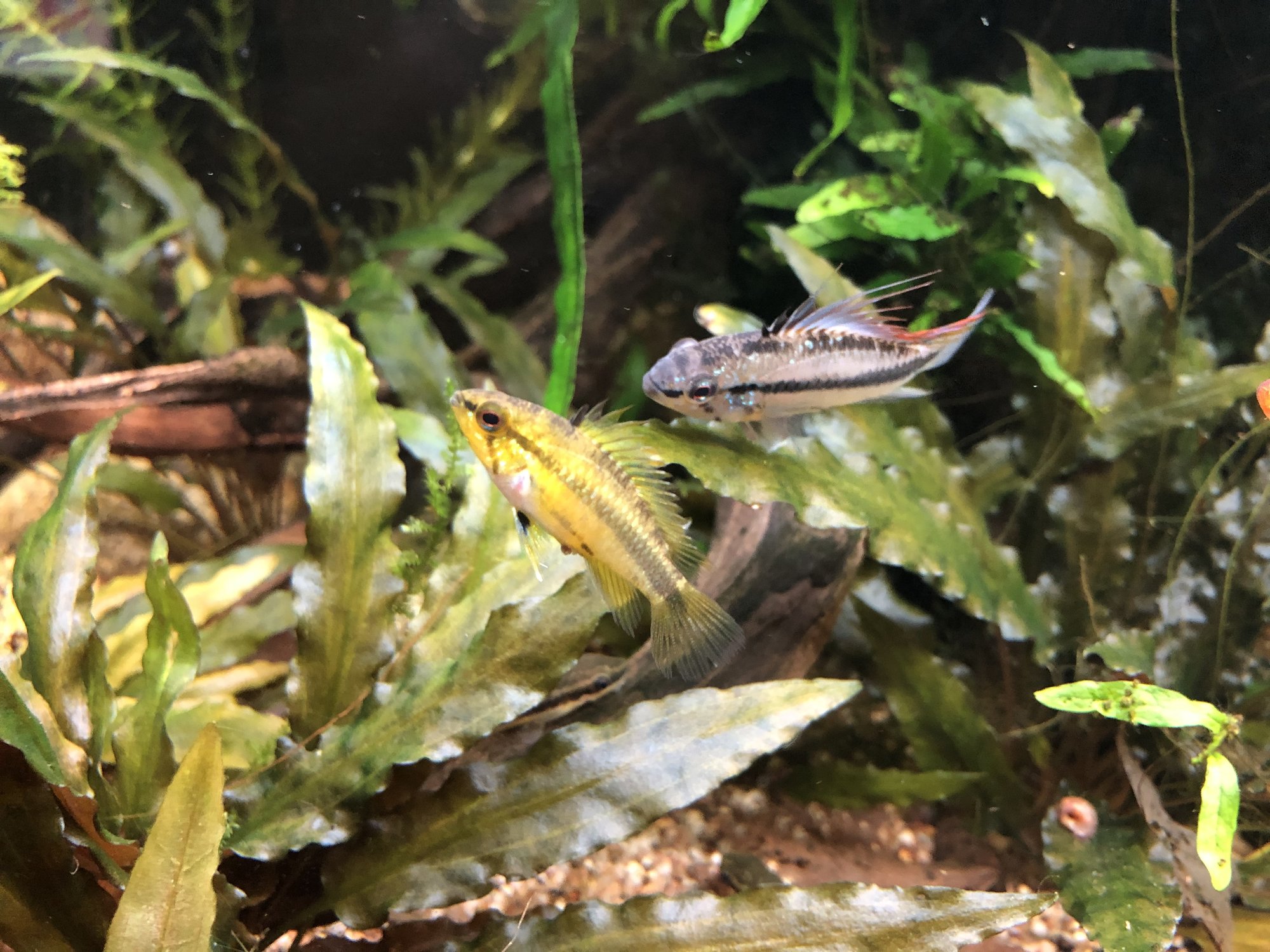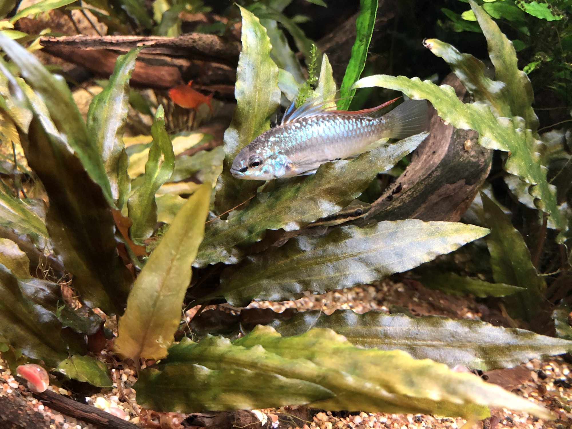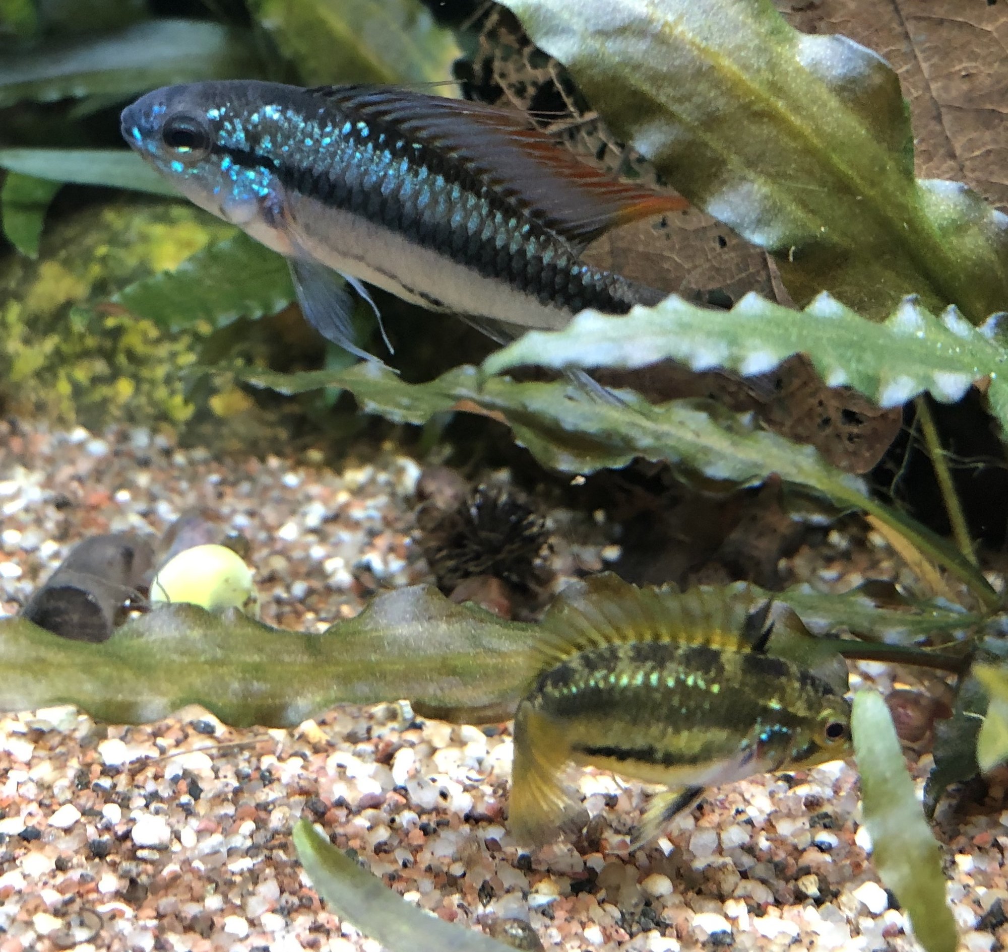 Ap. Trifasciatorna verkar må bra. Det var ju en av honorna som hade synliga maskar men behandlingen synes ha fungerat och hon är redan lite rundare. Hanen glider runt och visar upp sig för honorna när han får tillfälle. Det är inget synligt bråk mellan honorna så båda går fortfarande kvar i samma kar. Ska, som jag tidigare nämnt, åter lägga löv på botten när andra delen av behandlingen är avklarad. Aporna verkade uppskatta lövlagret när det fanns där tidigare. Bortsett från maskproblemet tidigare är jag väldigt nöjd över karets utveckling. Aporna är spännande att titta på och karet ger mig en känsla av lugn. Tetrorna mår bra och ynglar av sig ibland. Ev. ska röda smyckestetror tillsättas senare. Eller så chansar jag och låter dem gå i storkaret istället.Kommentar