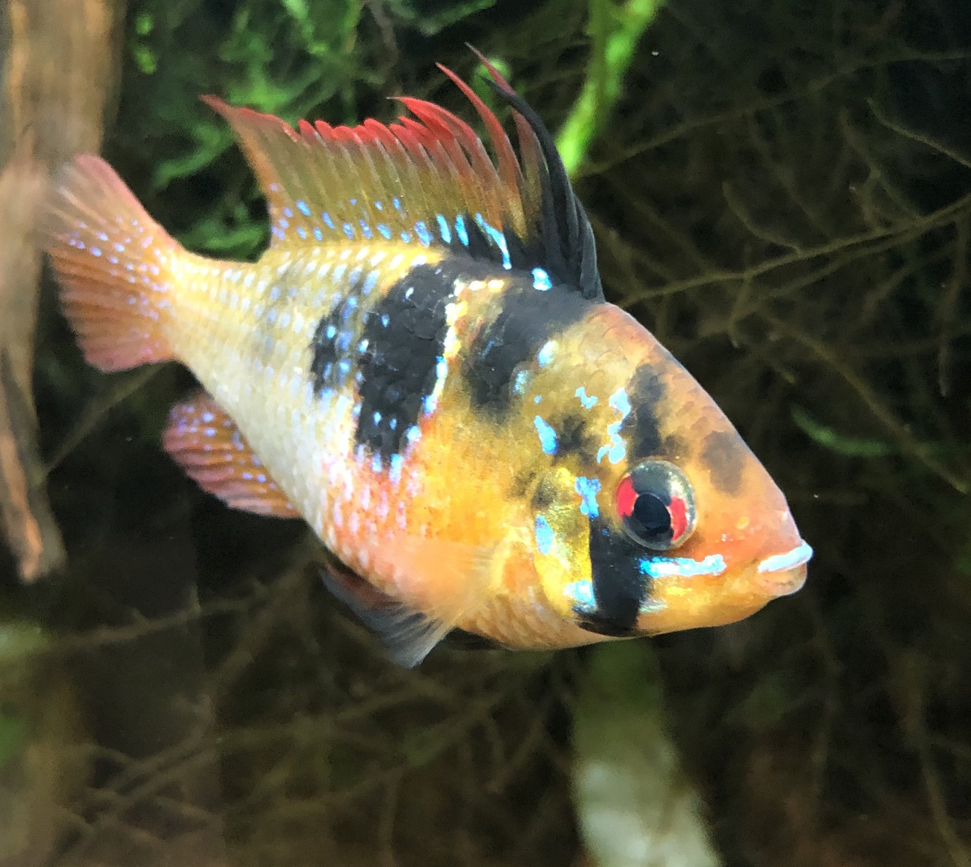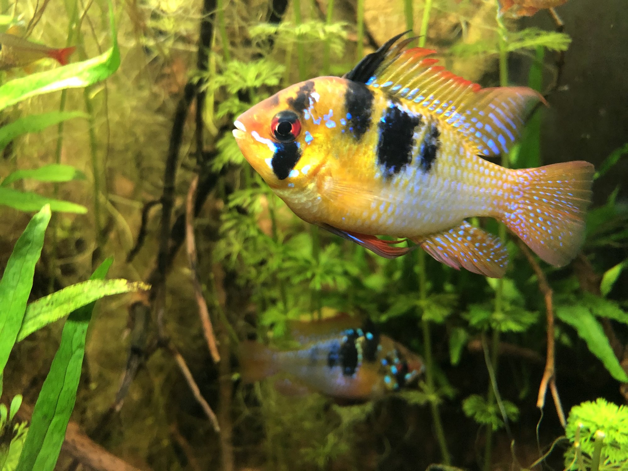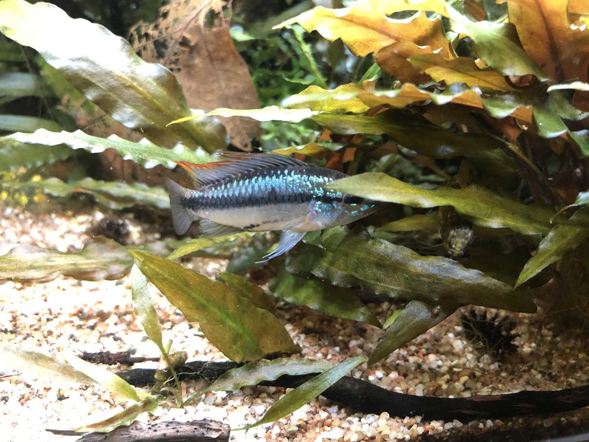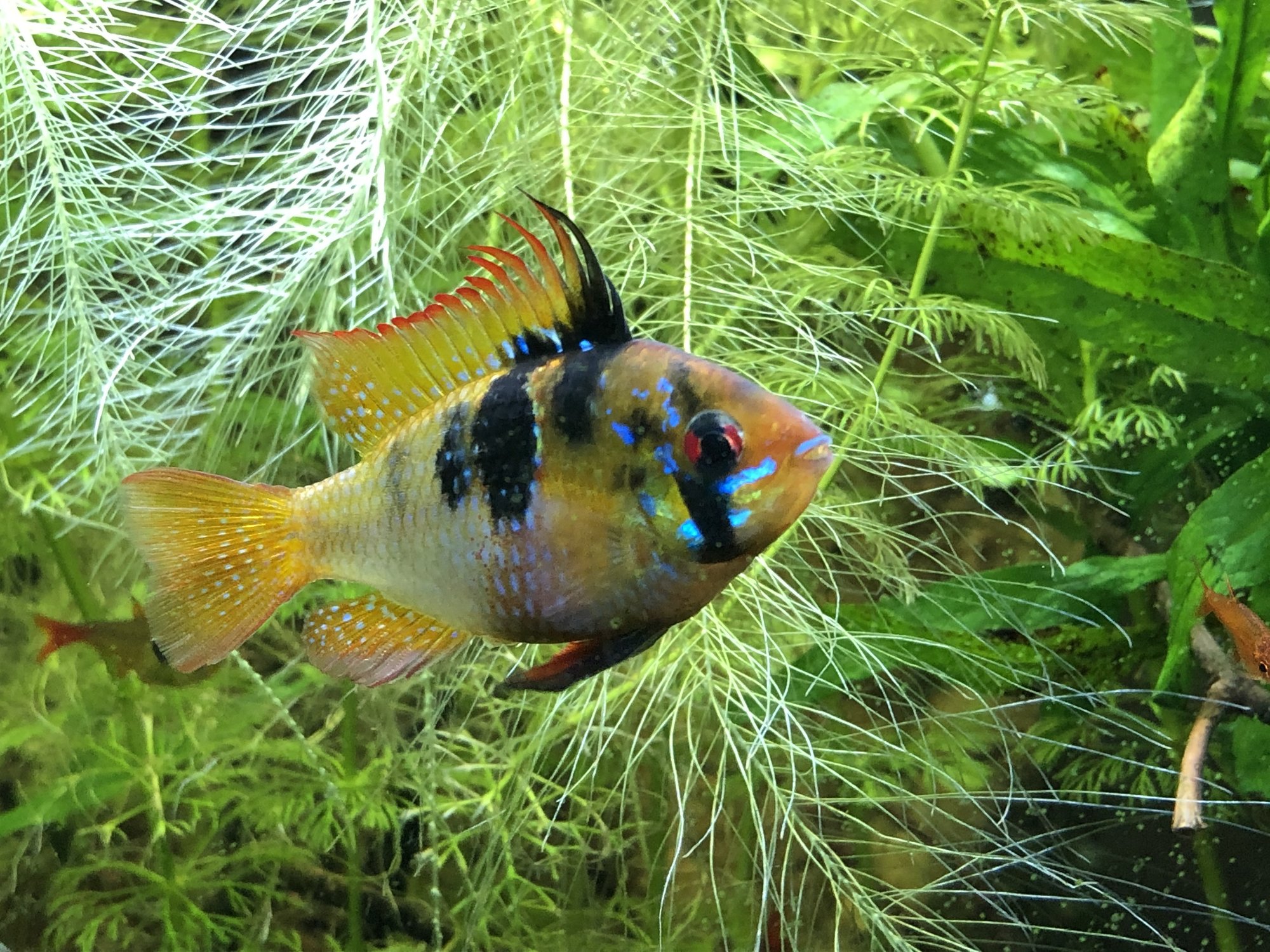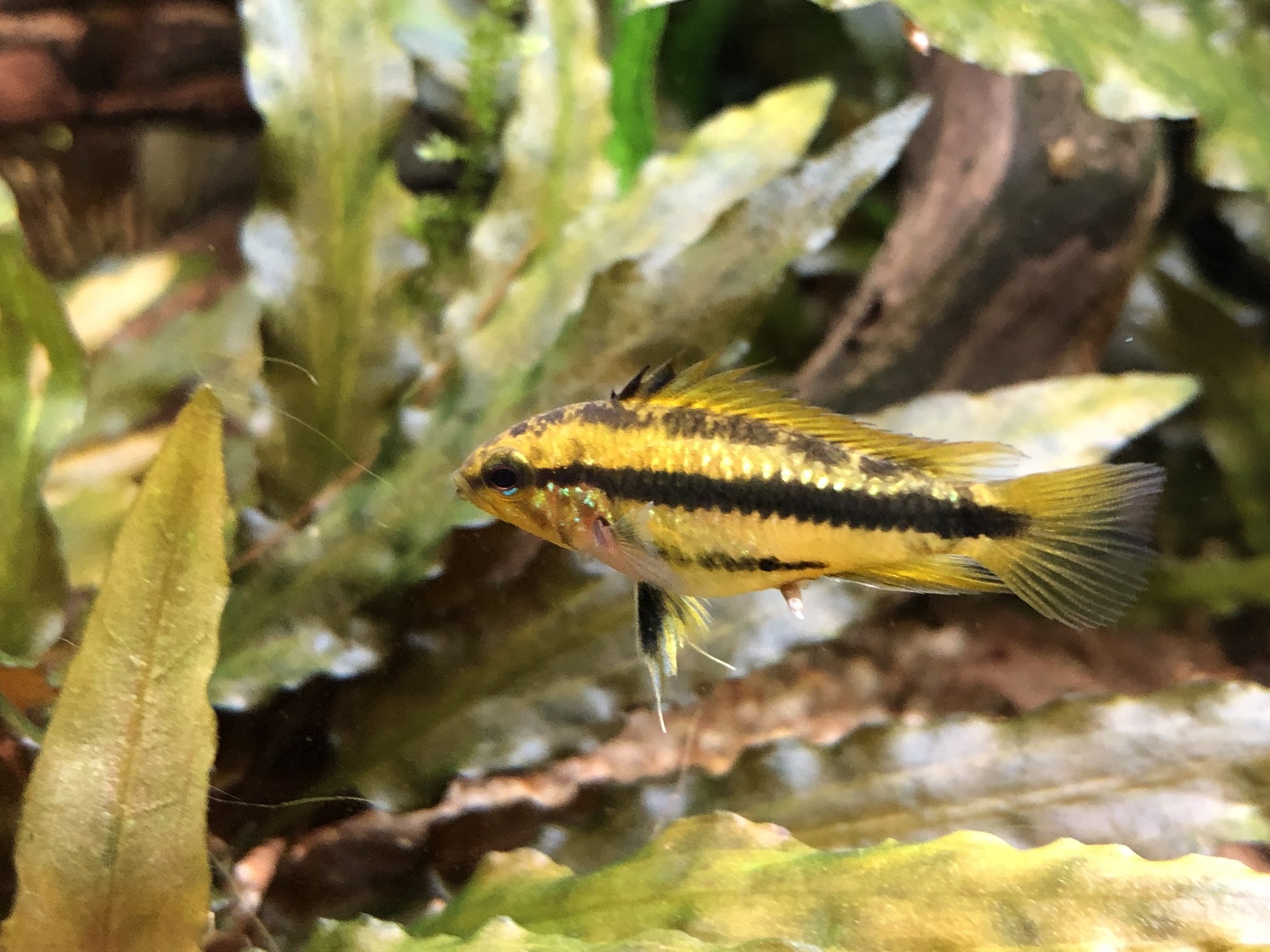 Ap. Trifasciatorna verkar må bra. Det var ju en av honorna som hade synliga maskar men behandlingen synes ha fungerat och hon är redan lite rundare. Hanen glider runt och visar upp sig för honorna när han får tillfälle. Det är inget synligt bråk mellan honorna så båda går fortfarande kvar i samma kar. Ska, som jag tidigare nämnt, åter lägga löv på botten när andra delen av behandlingen är avklarad. Aporna verkade uppskatta lövlagret när det fanns där tidigare. Bortsett från maskproblemet tidigare är jag väldigt nöjd över karets utveckling. Aporna är spännande att titta på och karet ger mig en känsla av lugn. Tetrorna mår bra och ynglar av sig ibland. Ev. ska röda smyckestetror tillsättas senare. Eller så chansar jag och låter dem gå i storkaret istället.Kommentar
