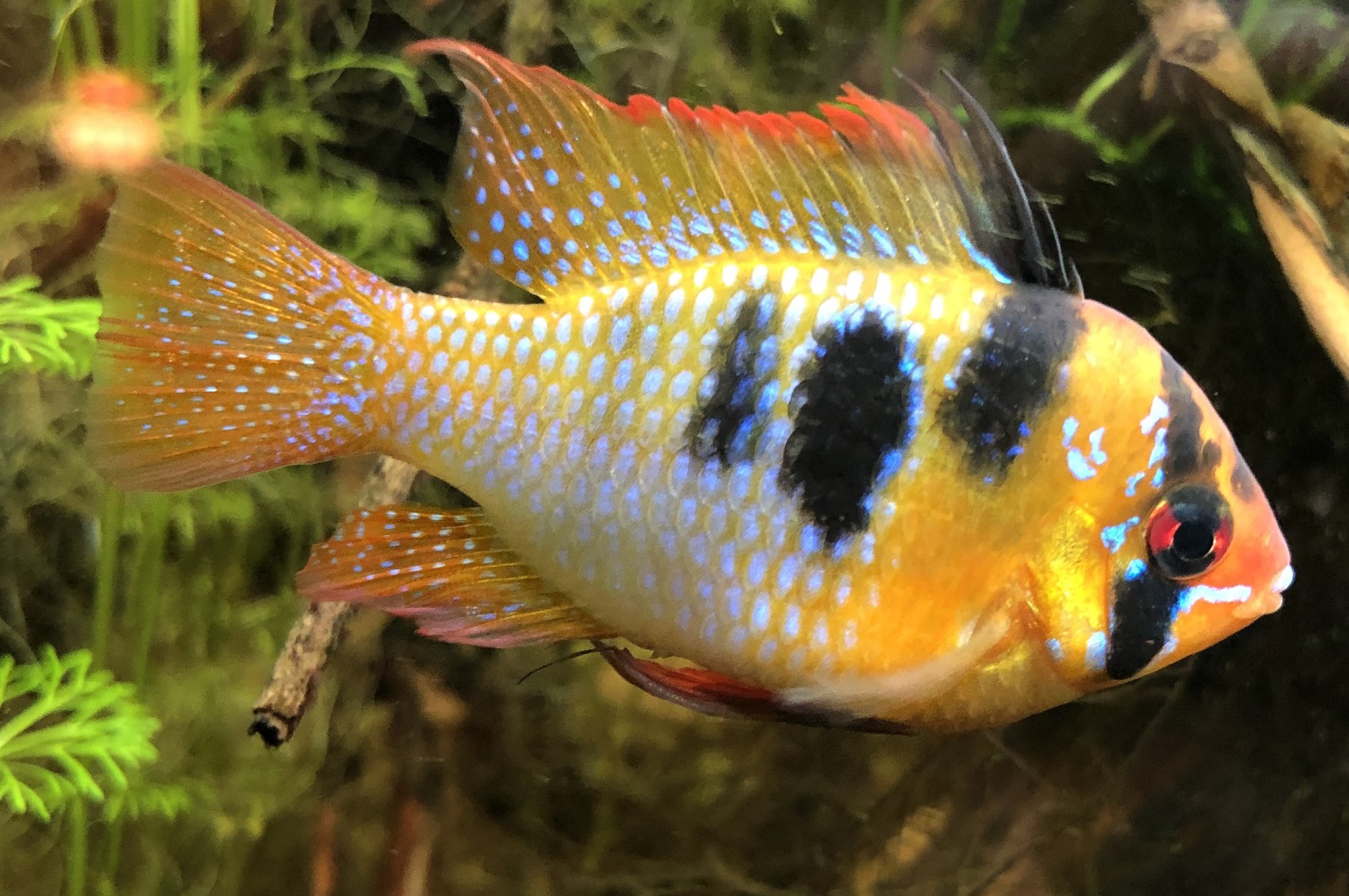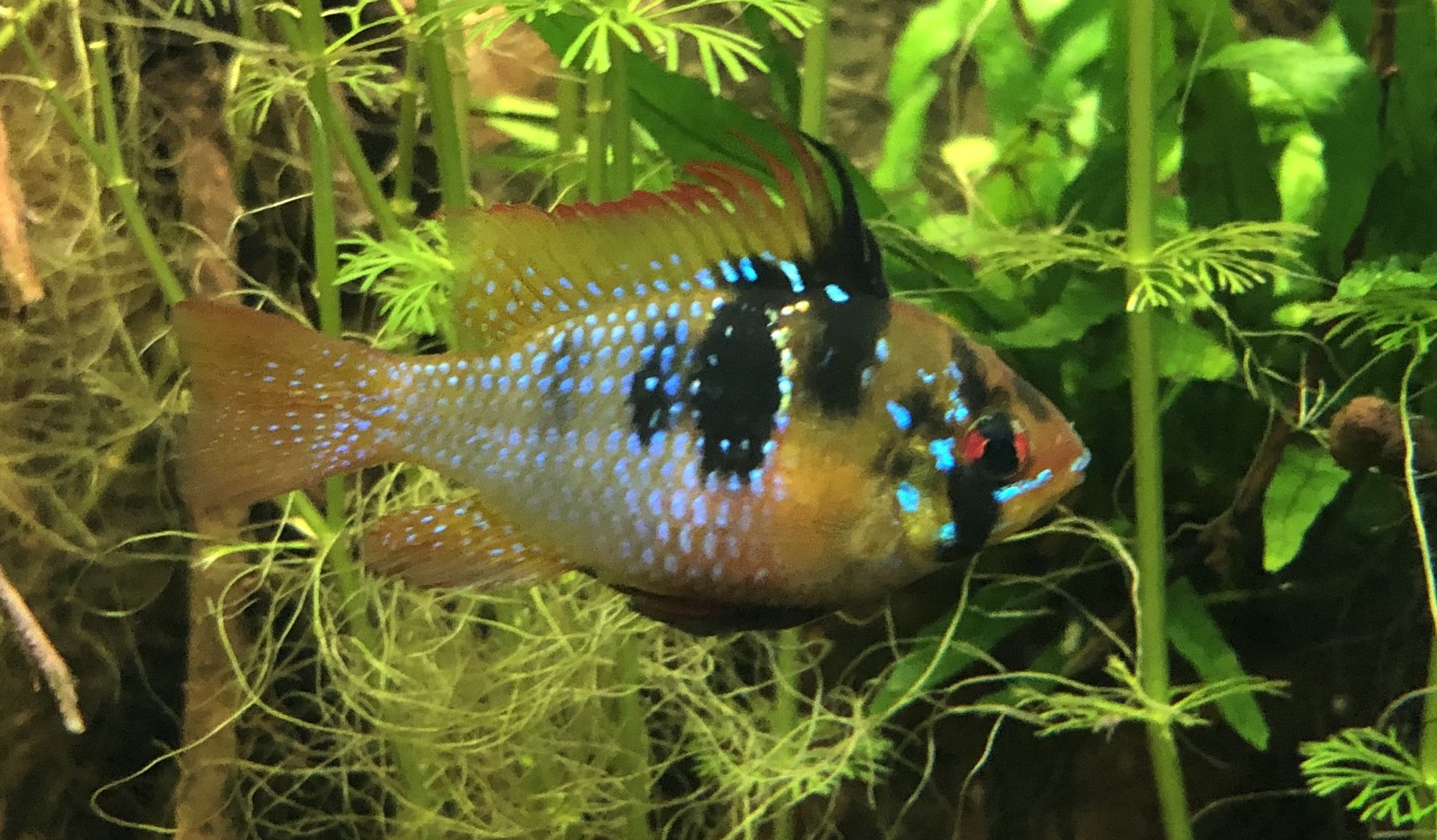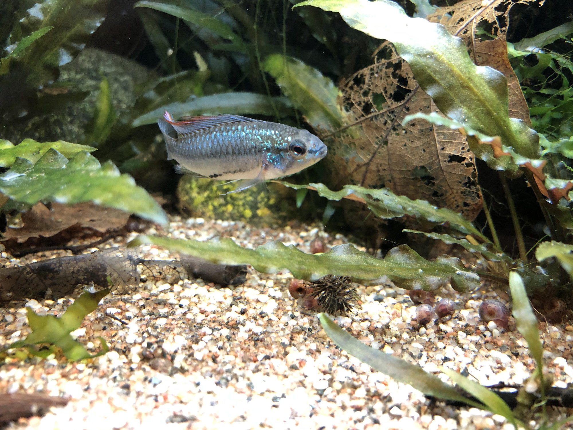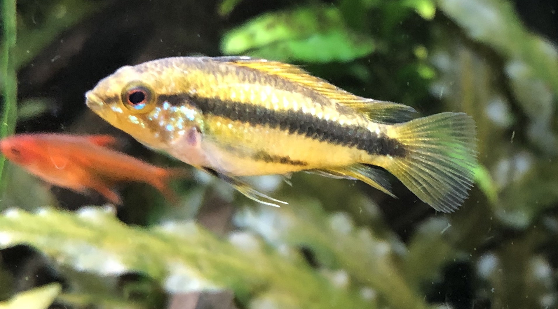 Ap. Trifasciatorna verkar må bra. Det var ju en av honorna som hade synliga maskar men behandlingen synes ha fungerat och hon är redan lite rundare. Hanen glider runt och visar upp sig för honorna när han får tillfälle. Det är inget synligt bråk mellan honorna så båda går fortfarande kvar i samma kar. Ska, som jag tidigare nämnt, åter lägga löv på botten när andra delen av behandlingen är avklarad. Aporna verkade uppskatta lövlagret när det fanns där tidigare. Bortsett från maskproblemet tidigare är jag väldigt nöjd över karets utveckling. Aporna är spännande att titta på och karet ger mig en känsla av lugn. Tetrorna mår bra och ynglar av sig ibland. Ev. ska röda smyckestetror tillsättas senare. Eller så chansar jag och låter dem gå i storkaret istället.Kommentar
