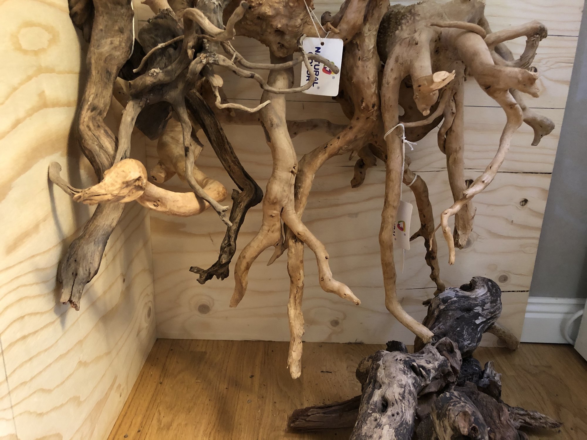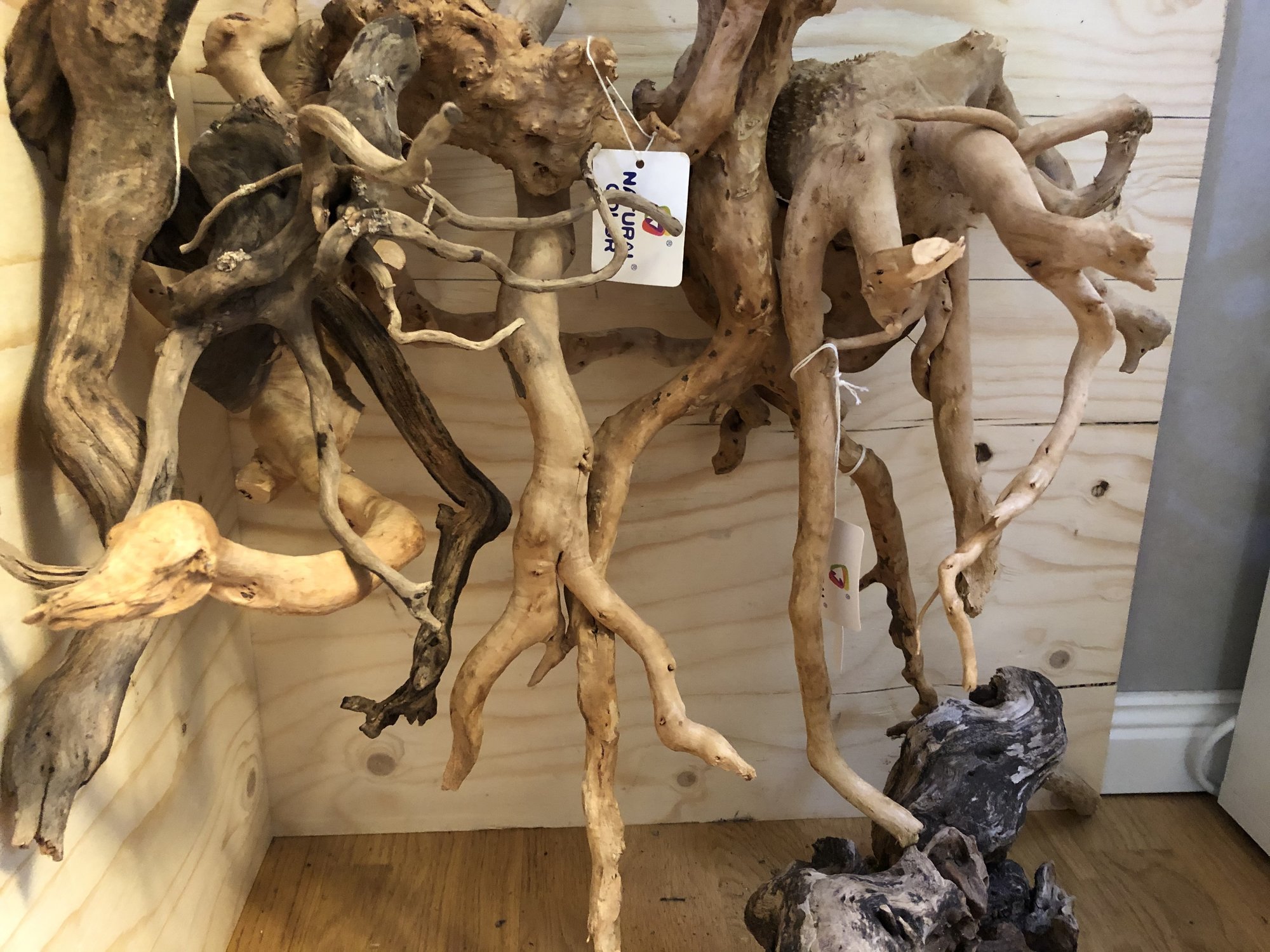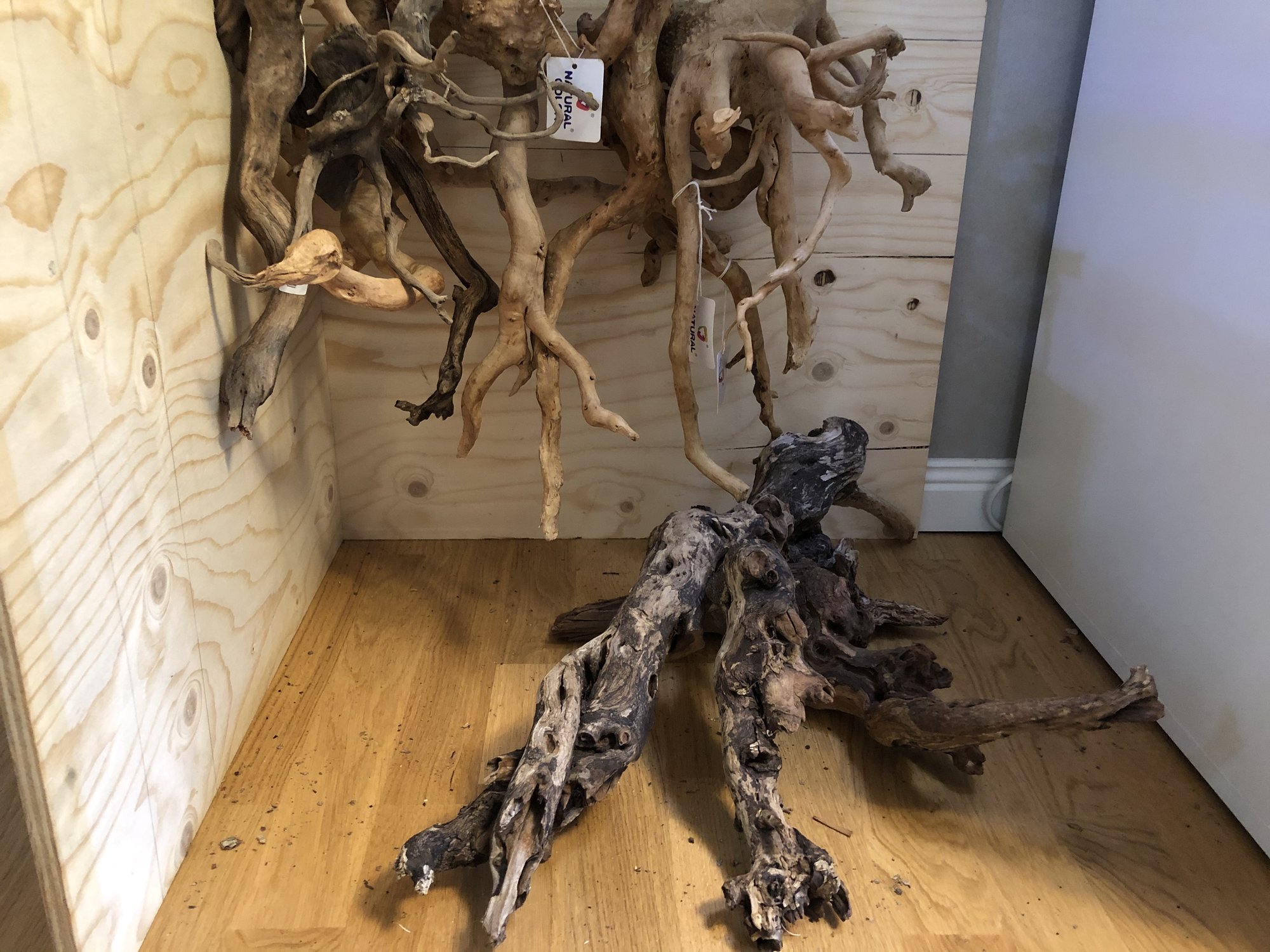 Nu har jag ”bävrat” lite mer (makens ord för mitt byggande/testande av olika kombinationer av rötter ) och kommit fram till att några få rötter, men inte alla, kan hänga från kanten och föreställa trädrötter som blivit översvämmade/sträcker sig ner från strandkanten. På botten kan det ligga en rotvälta med del av trädstammen synlig (detta ska efterlikna ett träd som kollapsat ner i vattnet) Det bör också finnas ytterligare grenar som har ramlat ned från träden ovanför samt en massa pinnar och löv mm. På detta sätt får jag till snygga höjdskillnader, flera trädetaljer på botten samt öppna ytor som leder blicken inåt och utgör plats för någon ev svärdsplanta. Tror det blir bättre (och enklare att få till) än att alla rötter hänger uppifrån. Det bör också gå att skapa bra ställen för apisarna med detta upplägg!