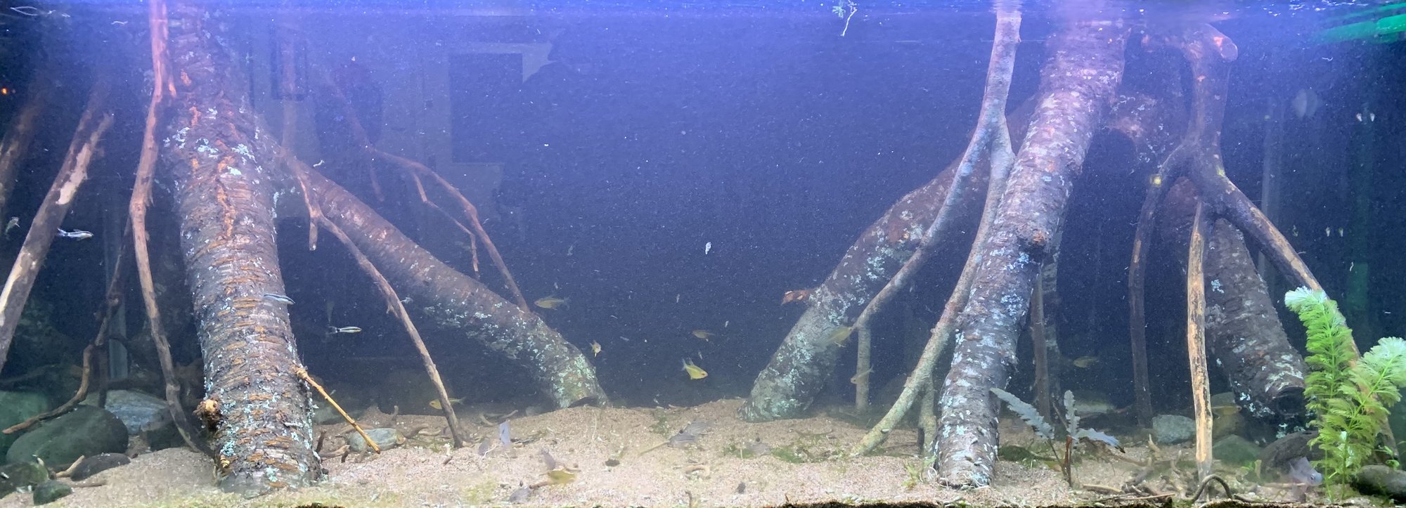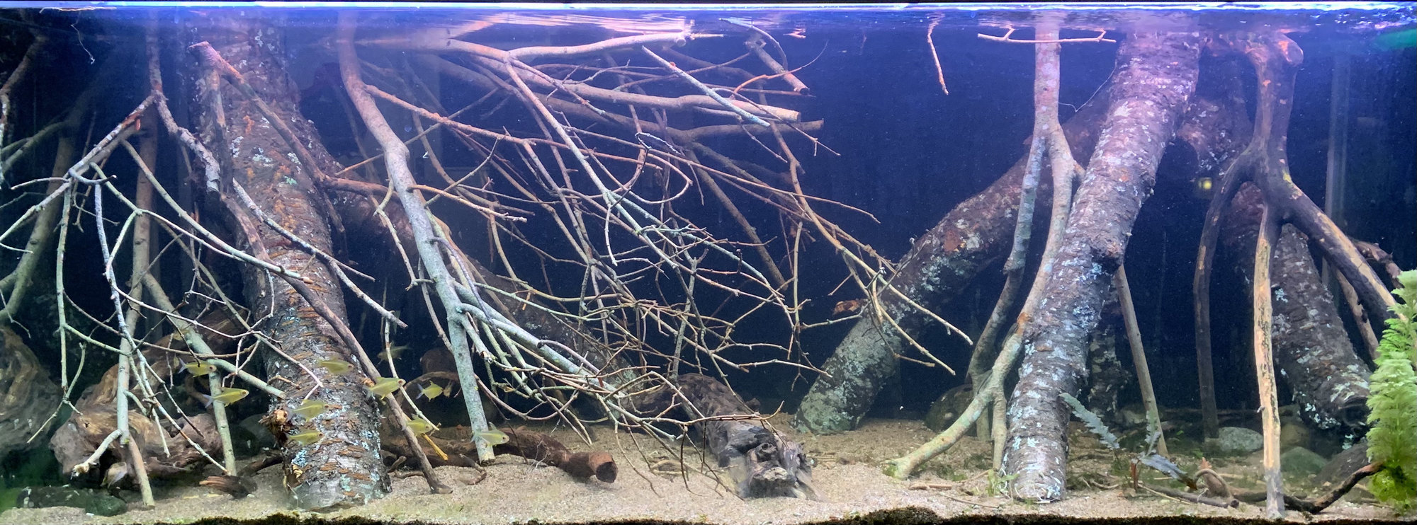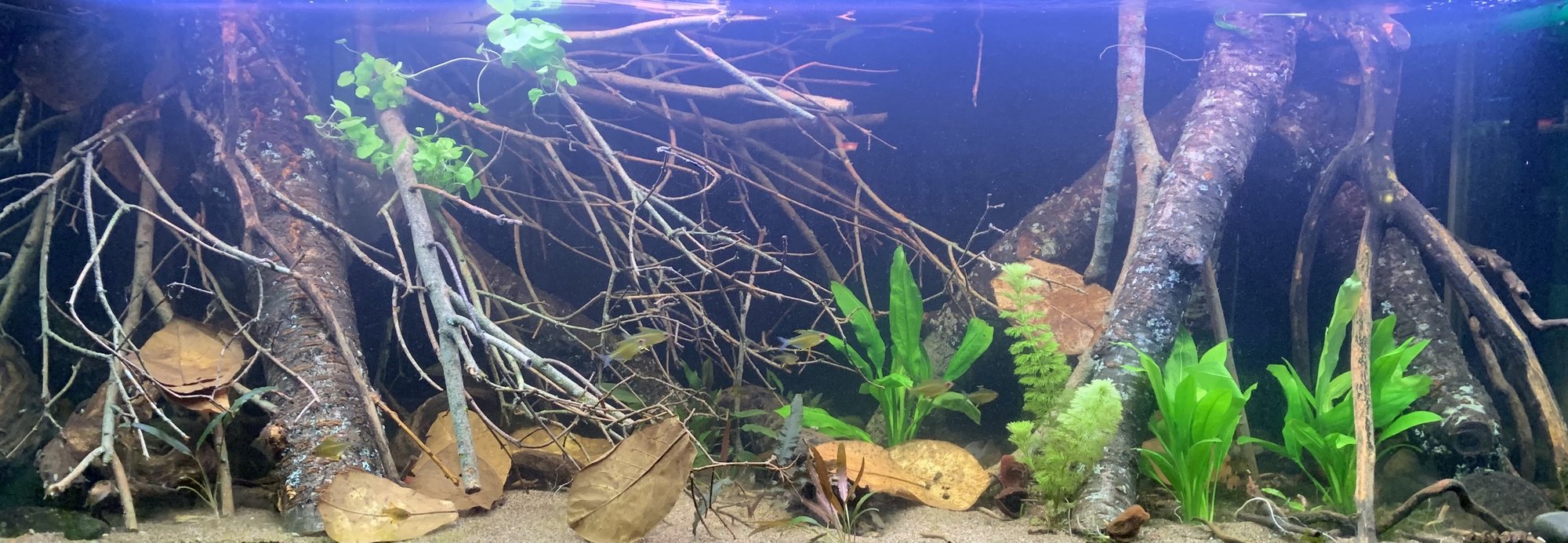 Nu kommer några bilder på inredningen från det att de stora grenarna hamnade i karet till hur det ser ut idag. Inspirationen till karet har främst kommit dels från Mats i Akvariestugan, dels från mitt ”svartvattenkar” som jag är väldigt nöjd med. Tanken är att tillsätta mer löv/svartvattenjox successivt så att vattnet blir lagom tefärgat. När jag får tag på mer spikblad ska jag också snurra in fler sådana plantor i grenverket till vänster. Den planta limnophila sessiflora som syns i framkant är bara där tillfälligt.Kommentar