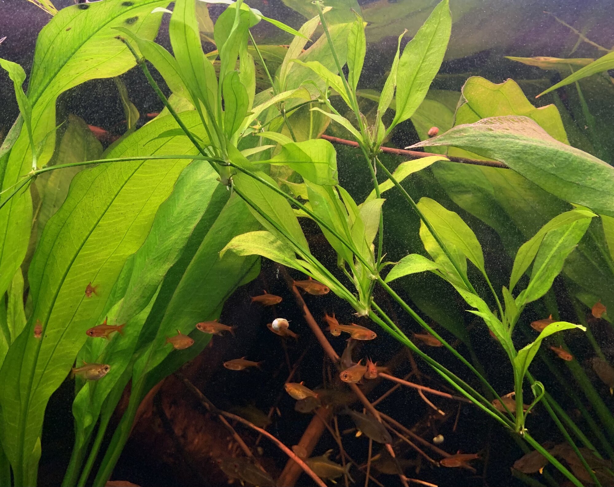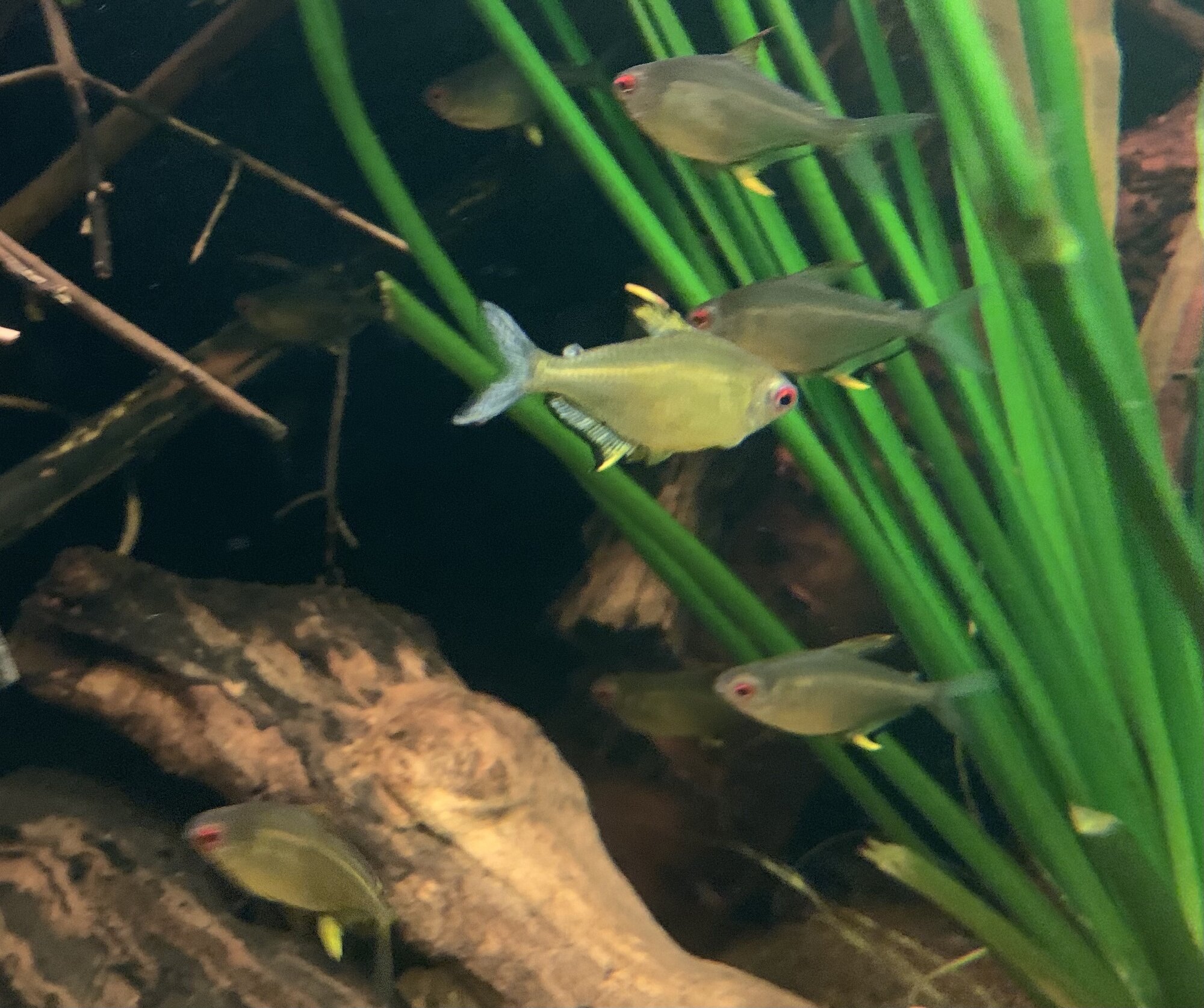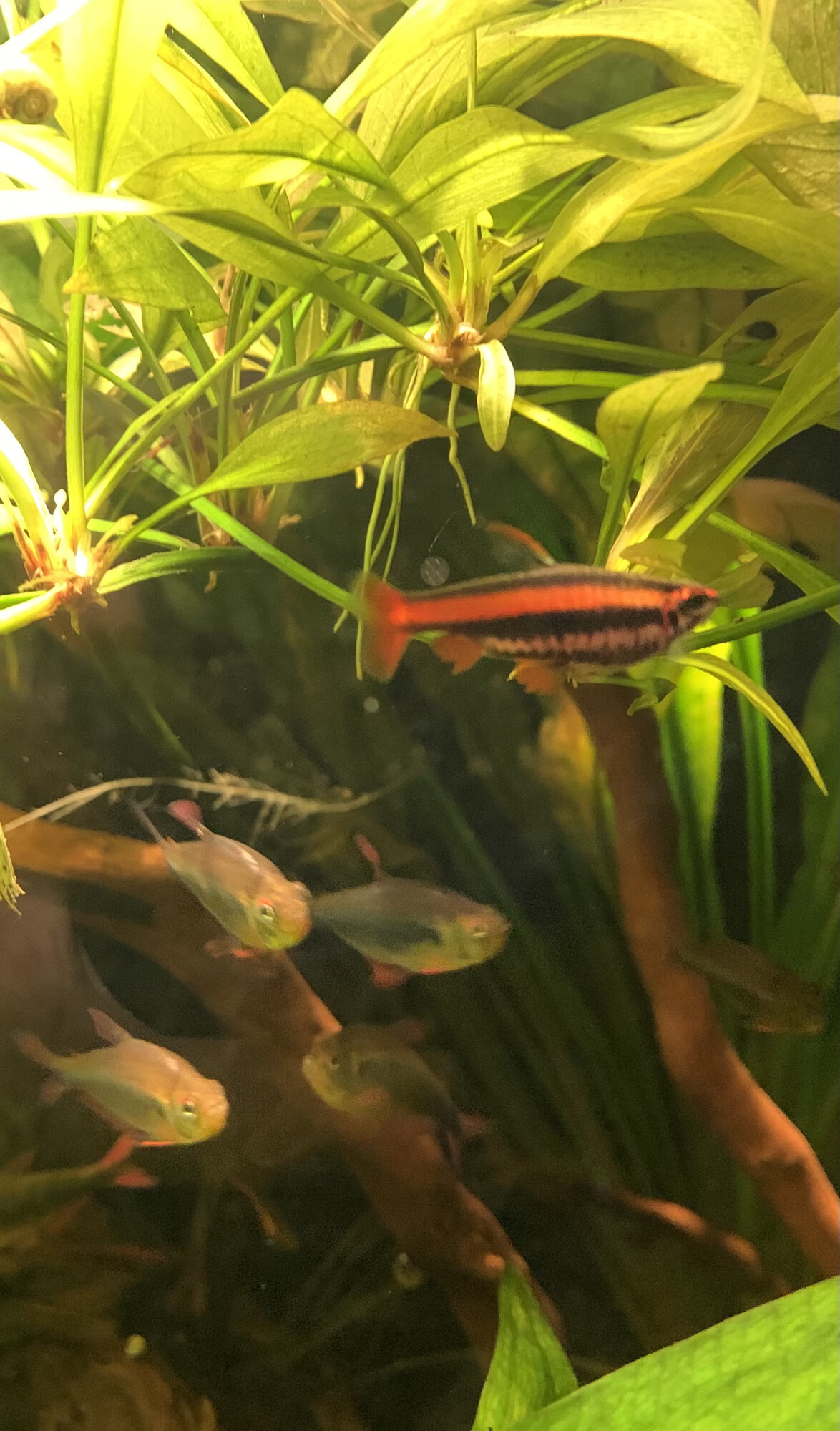 Småtetrorna verkar trivas bra! Egentligen är det väldigt harmoniskt med ett större gäng mindre fisk i ett hyfsat stort kar. Det blir mer naturligt när det är ett stor stim och de inte har det så trångt. Jag uppskattar också att slippa de revirbråk som lätt uppstod mellan scalarerna. (Det jag skriver nu blir dock väldigt motsägelsefullt när jag samtidigt funderar på discus i framtiden).Kommentar