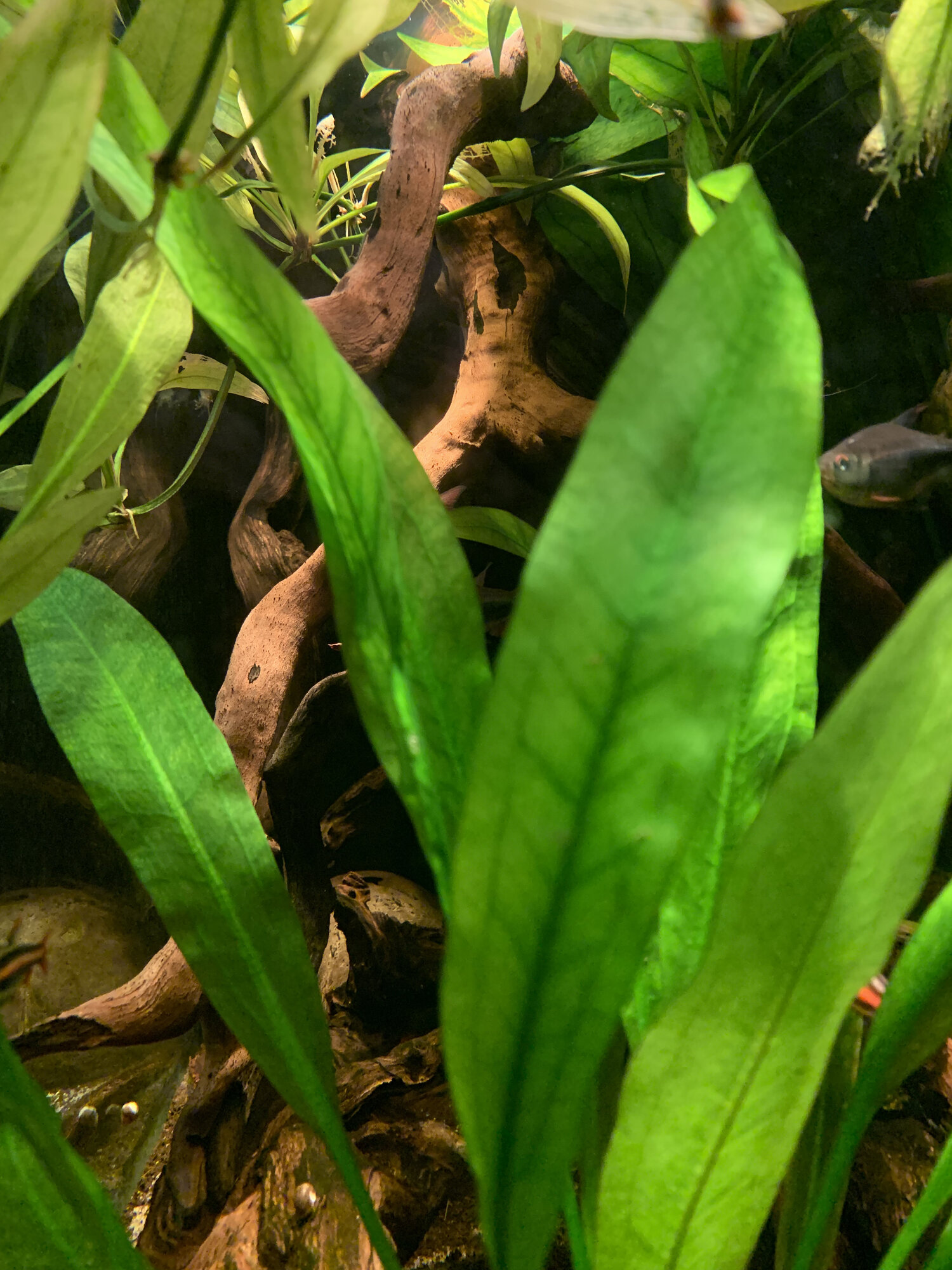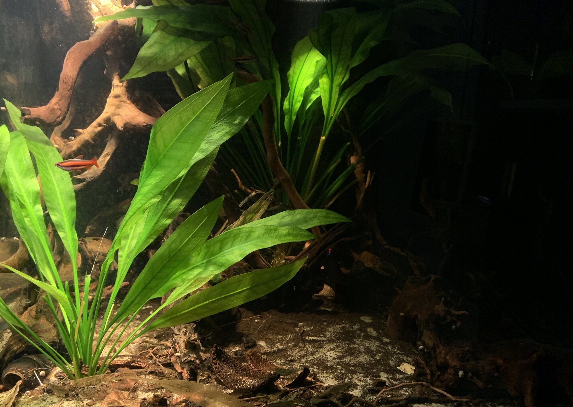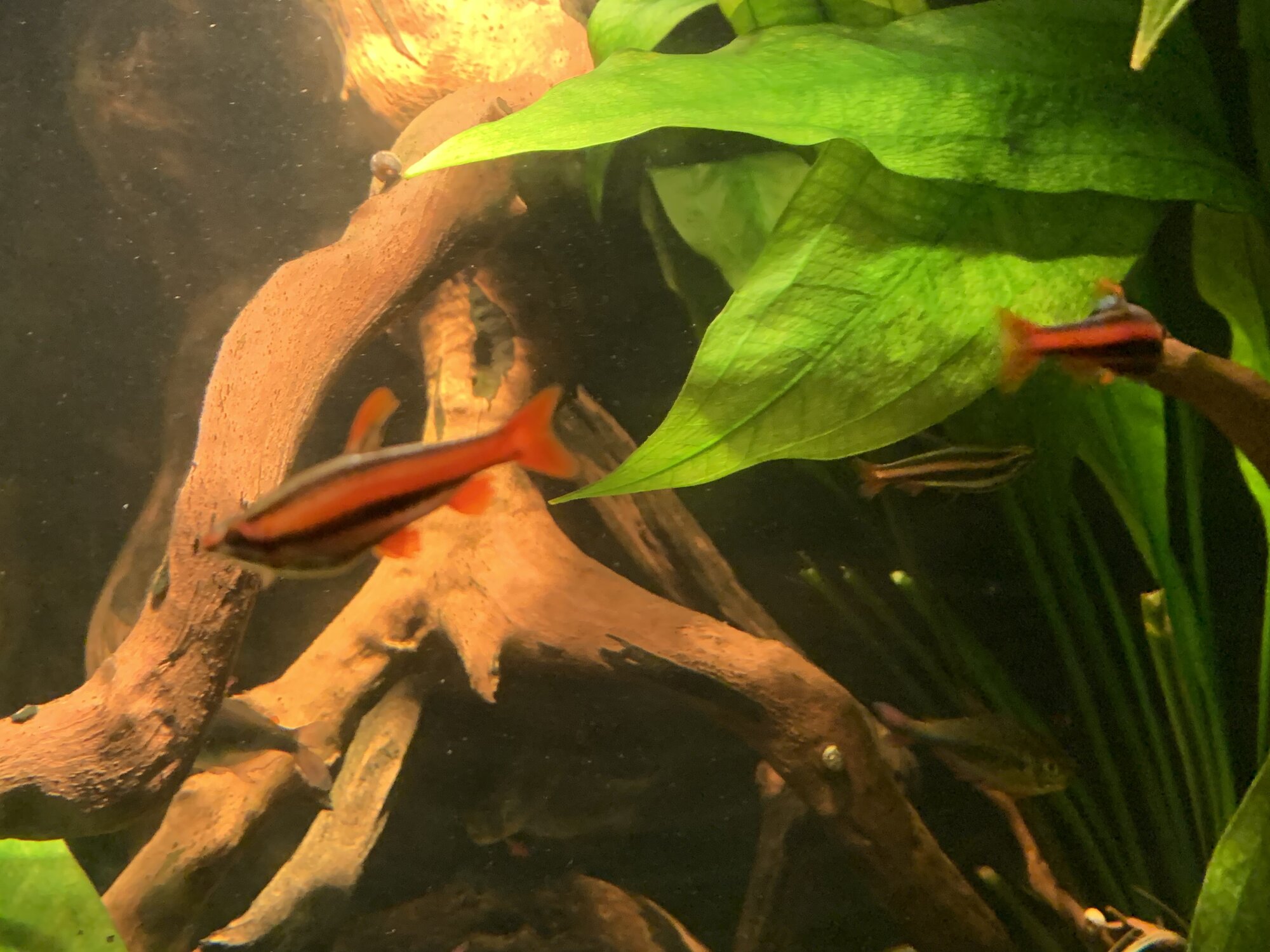 Småtetrorna verkar trivas bra! Egentligen är det väldigt harmoniskt med ett större gäng mindre fisk i ett hyfsat stort kar. Det blir mer naturligt när det är ett stor stim och de inte har det så trångt. Jag uppskattar också att slippa de revirbråk som lätt uppstod mellan scalarerna. (Det jag skriver nu blir dock väldigt motsägelsefullt när jag samtidigt funderar på discus i framtiden).Kommentar
