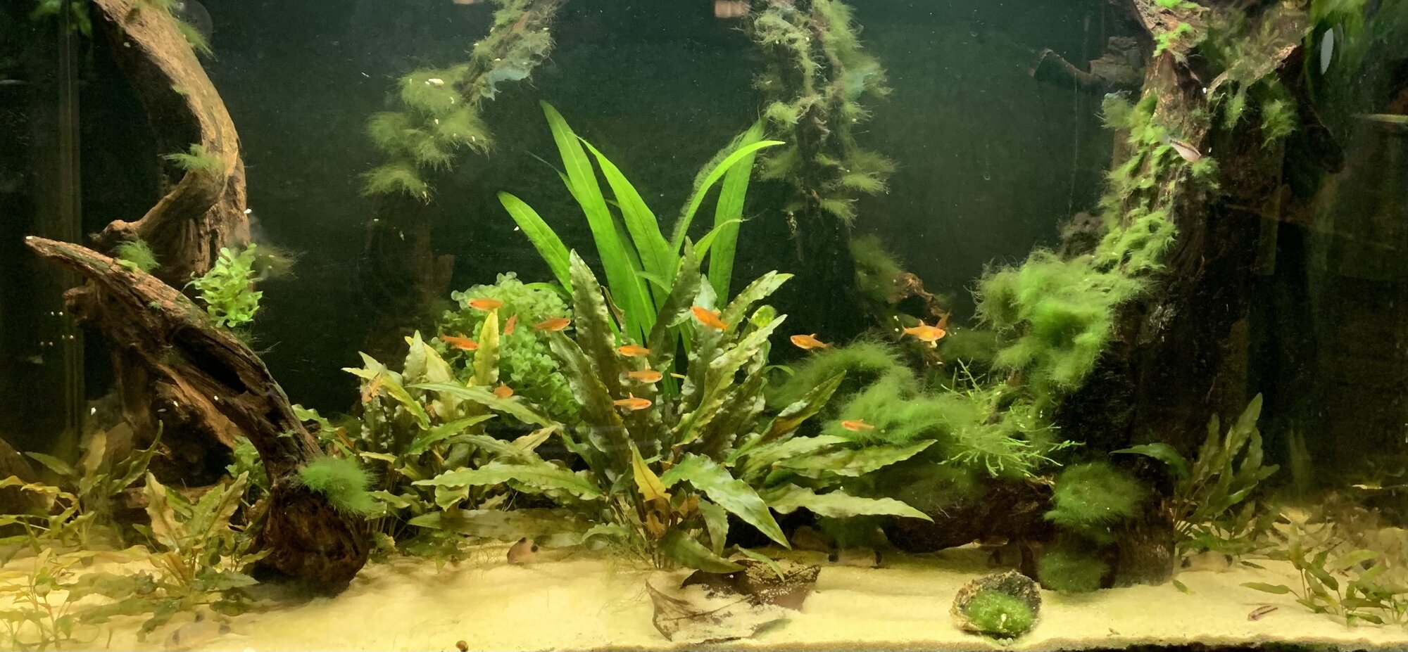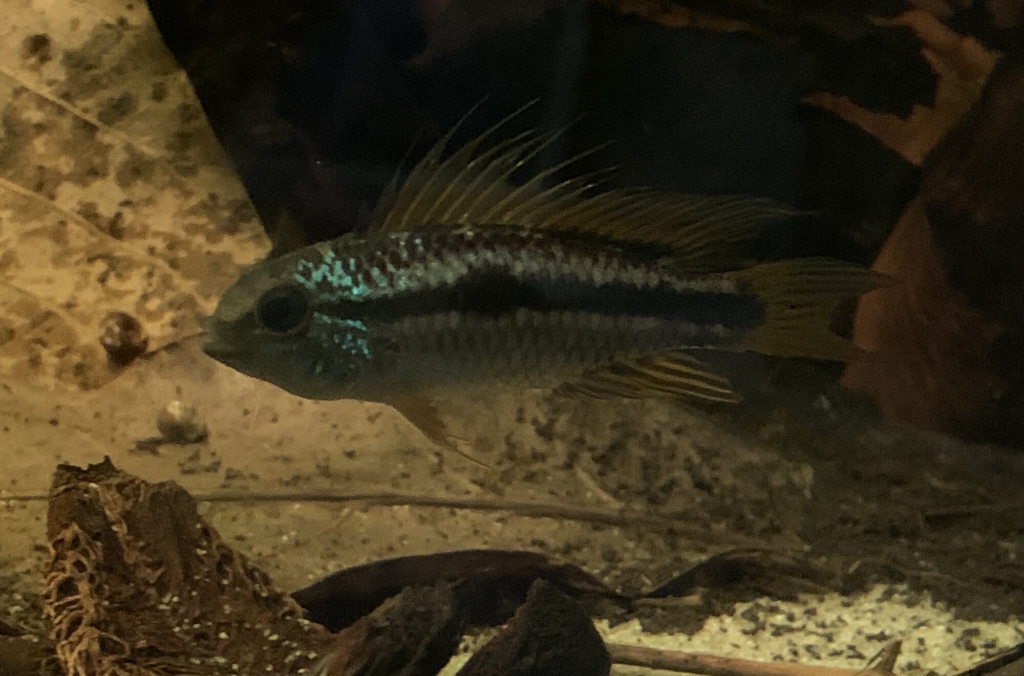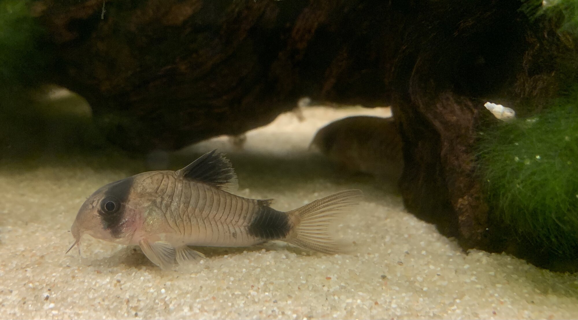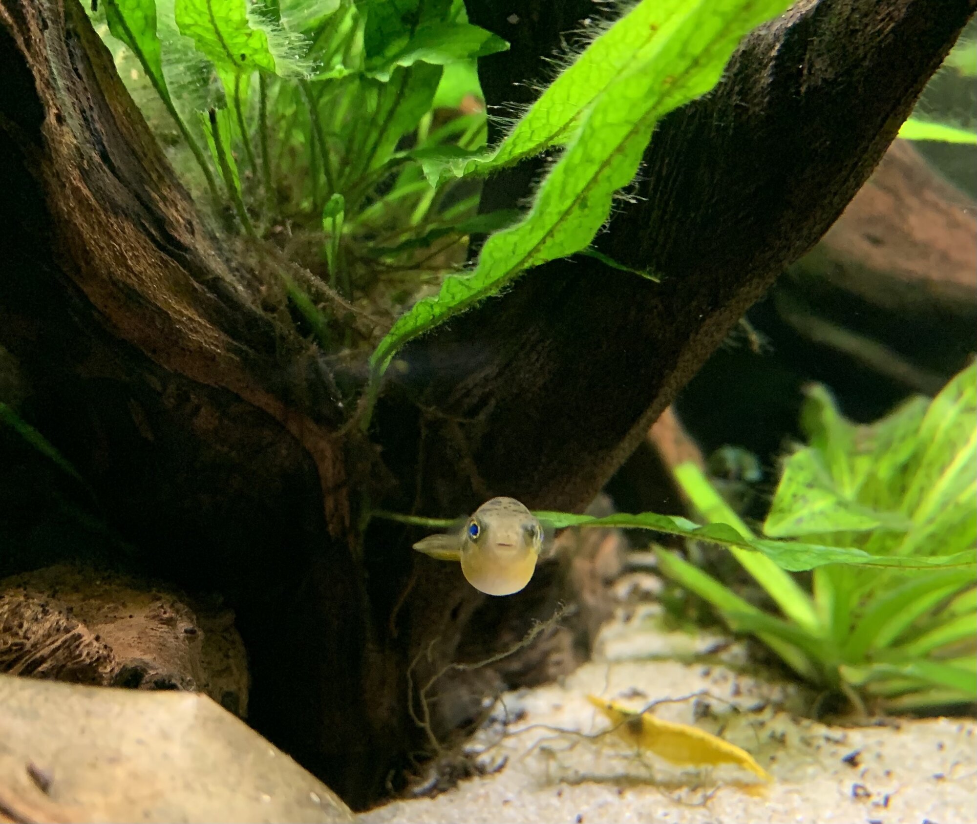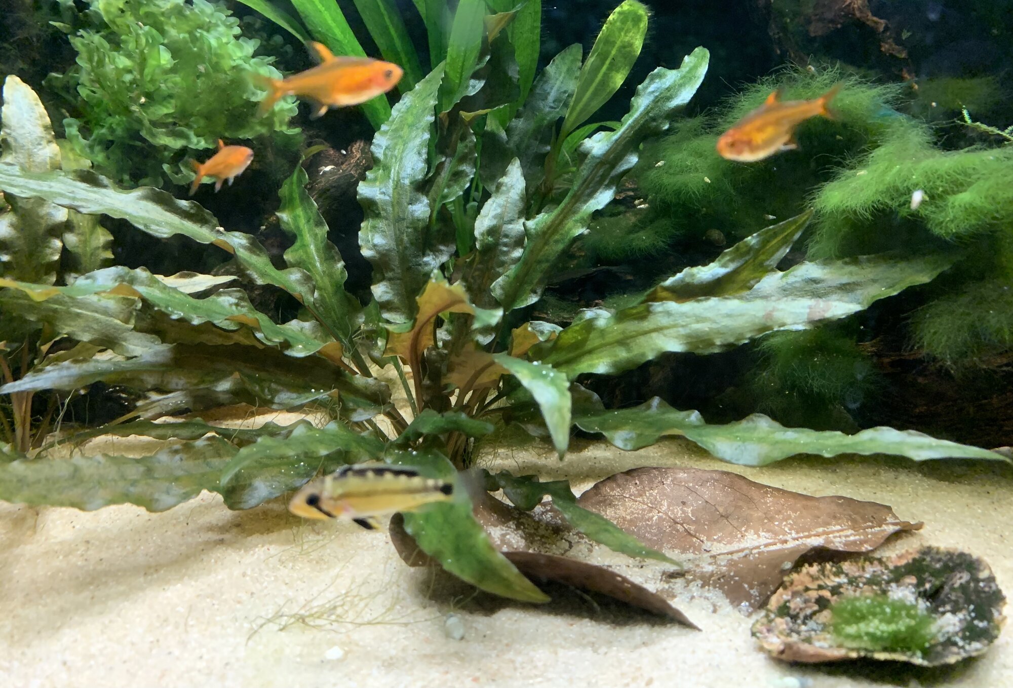 Kulkaret är på 54L och där går sex dvärgkulfiskar tillsammans med amanoräkor och gula räkor. Jag har finkornig ljus sand, rötter/grenar/pinnar, sötvattentång, en del andra växter och några stenar. Tanken med inredningen var att skapa något för dem att titta på och undersöka samtidigt som det inte skulle vara för mycket öppna ytor. De är väldigt nyfikna och ”med” i allt som händer. Samtidigt behöver de plats att dra sig undan från varandra för det kan bli lite ruffigt mellan hanarna emellanåt. Jag matar med olika typer av levandefoder (vita mygg, blackworms och tubifex), snäckor (har en snäckodling i en separat bunke) samt frysta vita mygg. Det är en väldigt rolig och söt fisk!Kommentar