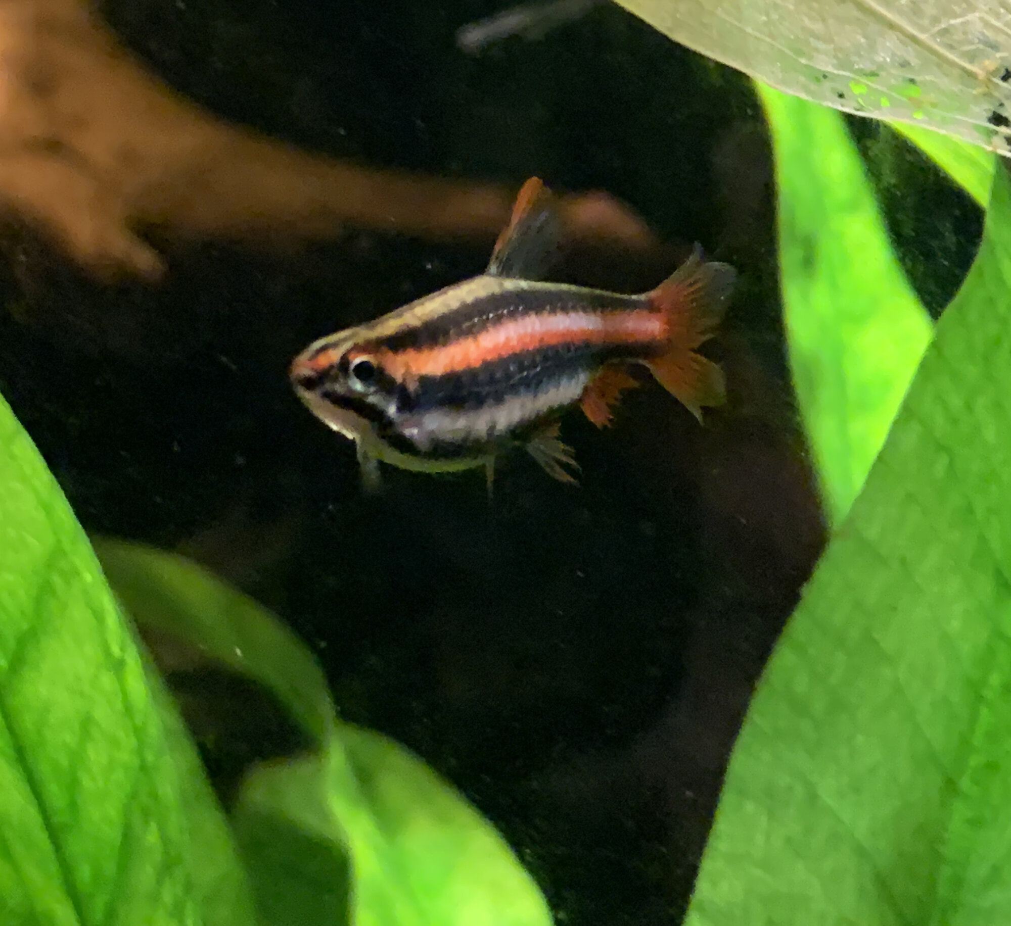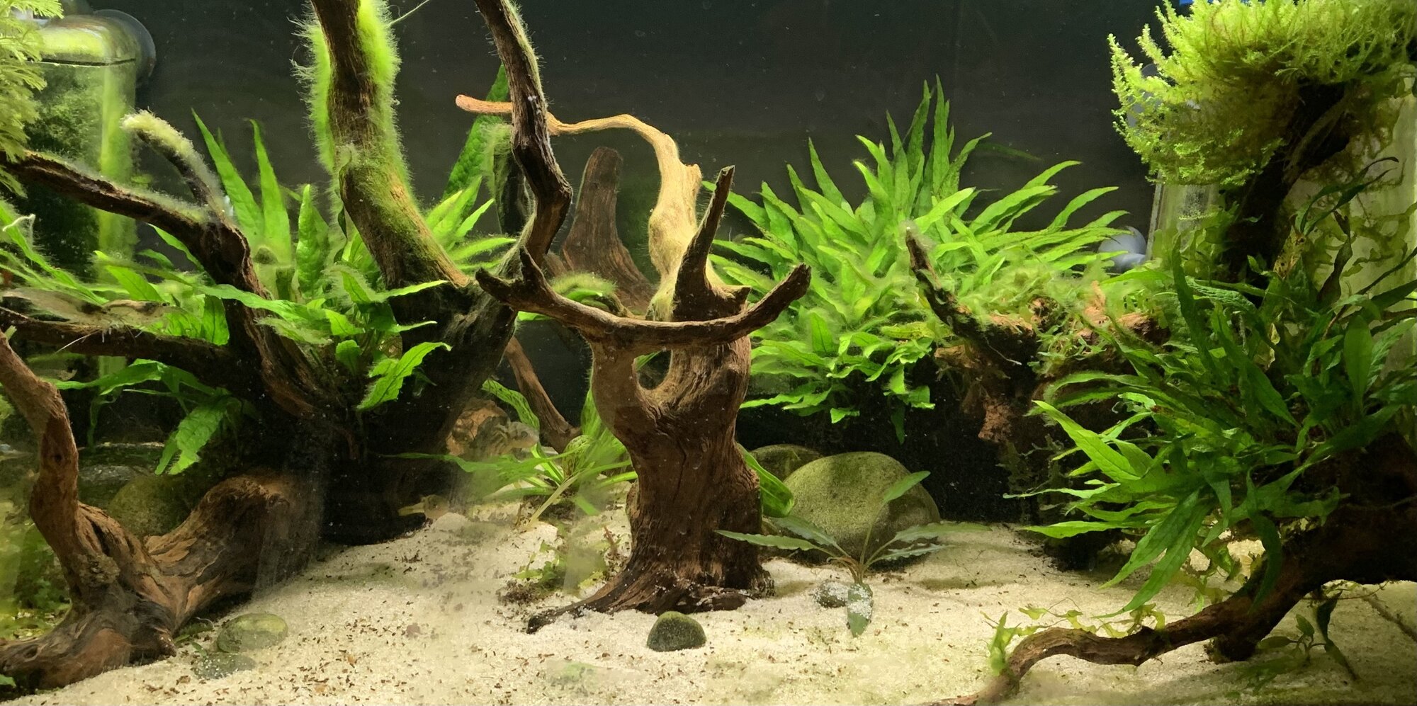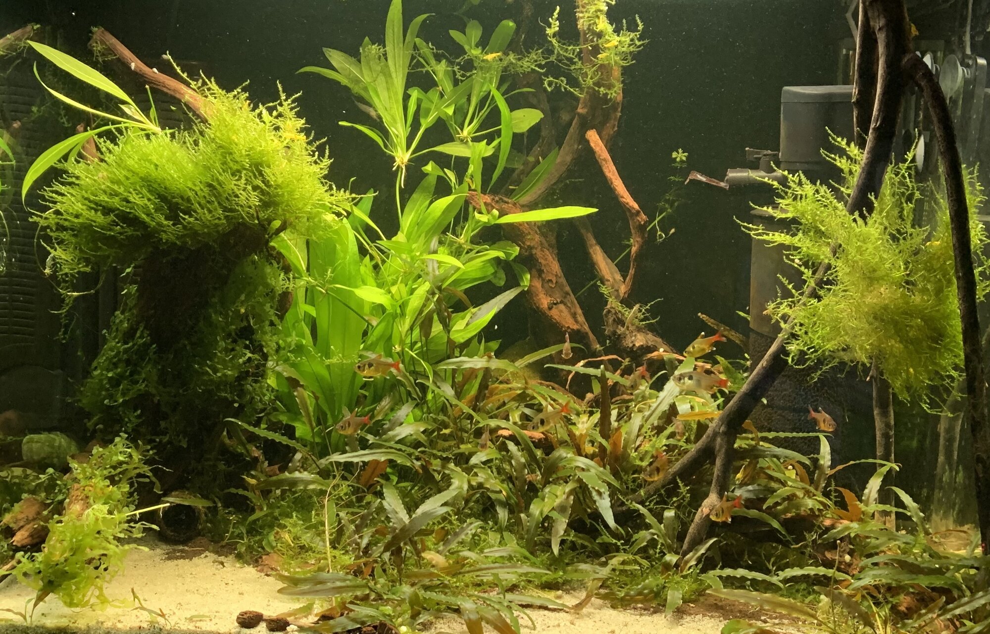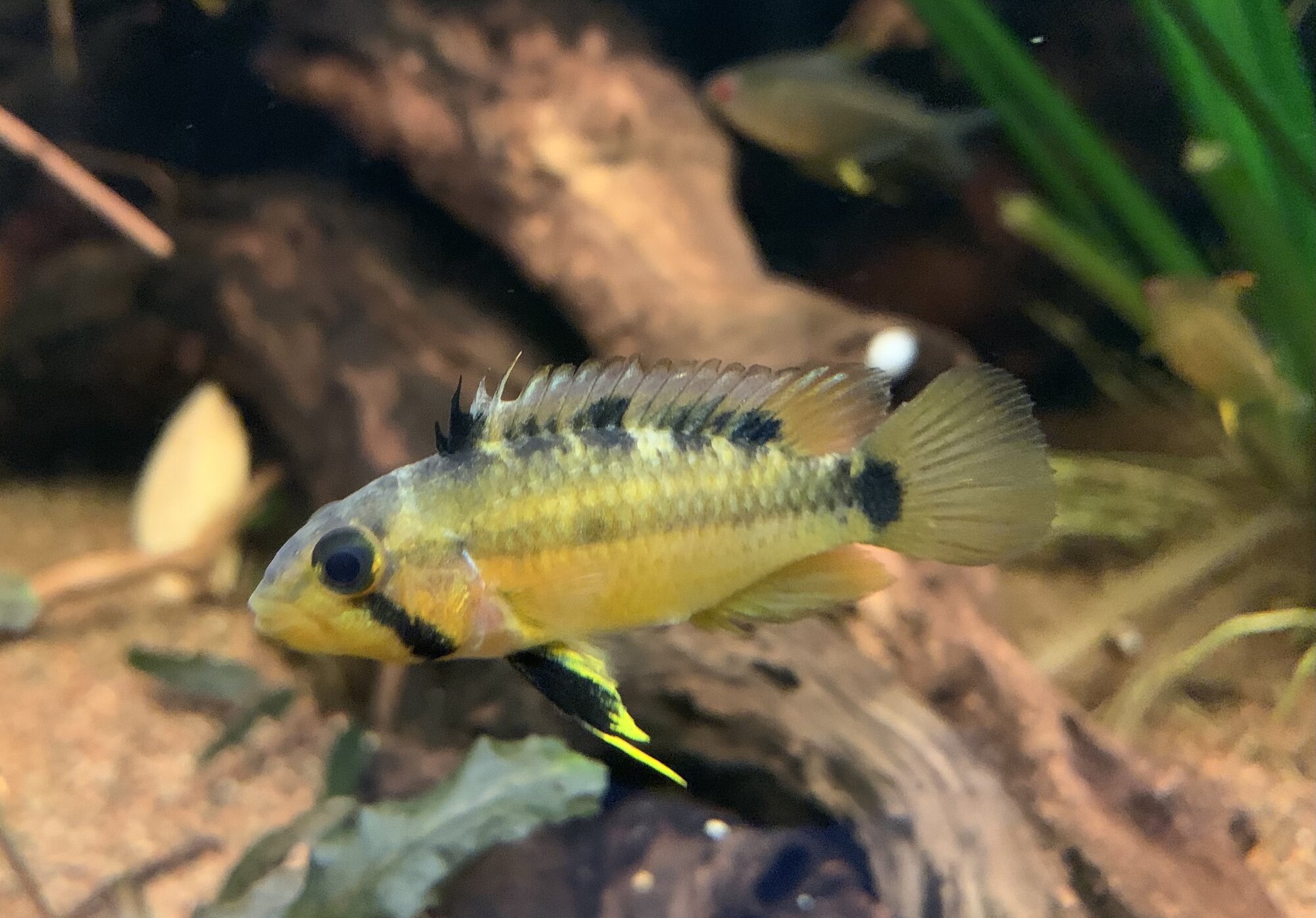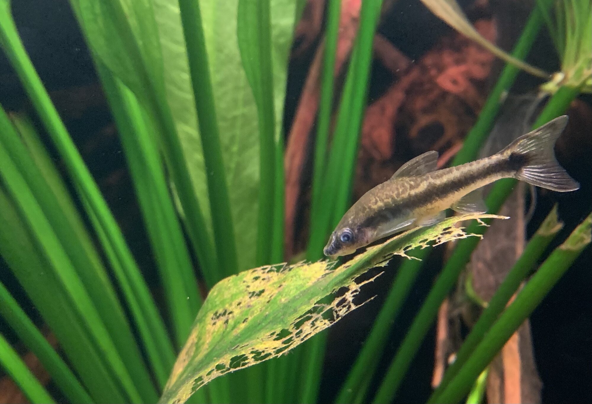 Kulkaret är på 54L och där går sex dvärgkulfiskar tillsammans med amanoräkor och gula räkor. Jag har finkornig ljus sand, rötter/grenar/pinnar, sötvattentång, en del andra växter och några stenar. Tanken med inredningen var att skapa något för dem att titta på och undersöka samtidigt som det inte skulle vara för mycket öppna ytor. De är väldigt nyfikna och ”med” i allt som händer. Samtidigt behöver de plats att dra sig undan från varandra för det kan bli lite ruffigt mellan hanarna emellanåt. Jag matar med olika typer av levandefoder (vita mygg, blackworms och tubifex), snäckor (har en snäckodling i en separat bunke) samt frysta vita mygg. Det är en väldigt rolig och söt fisk!Kommentar