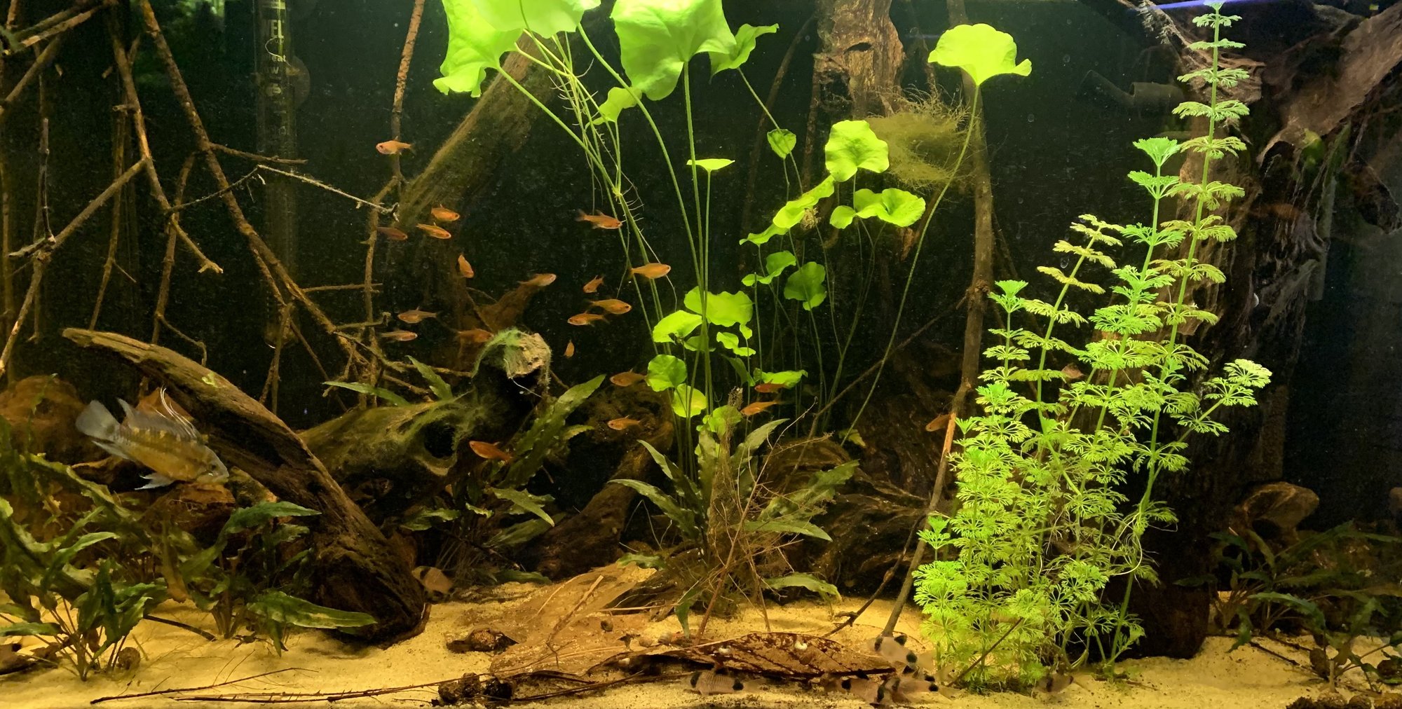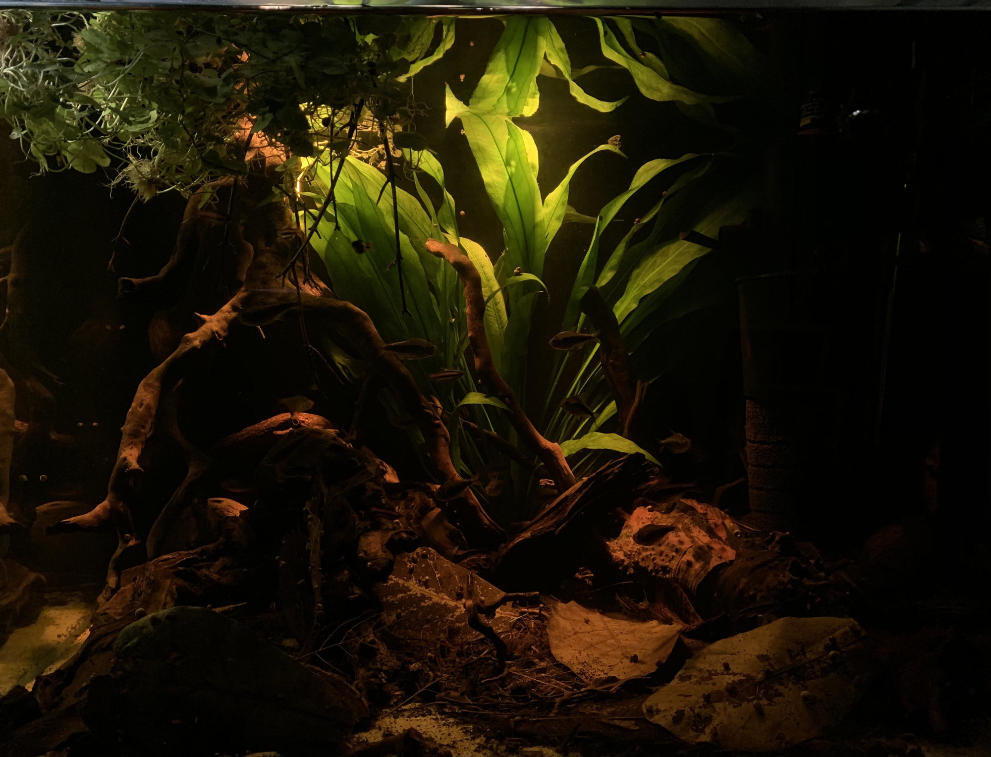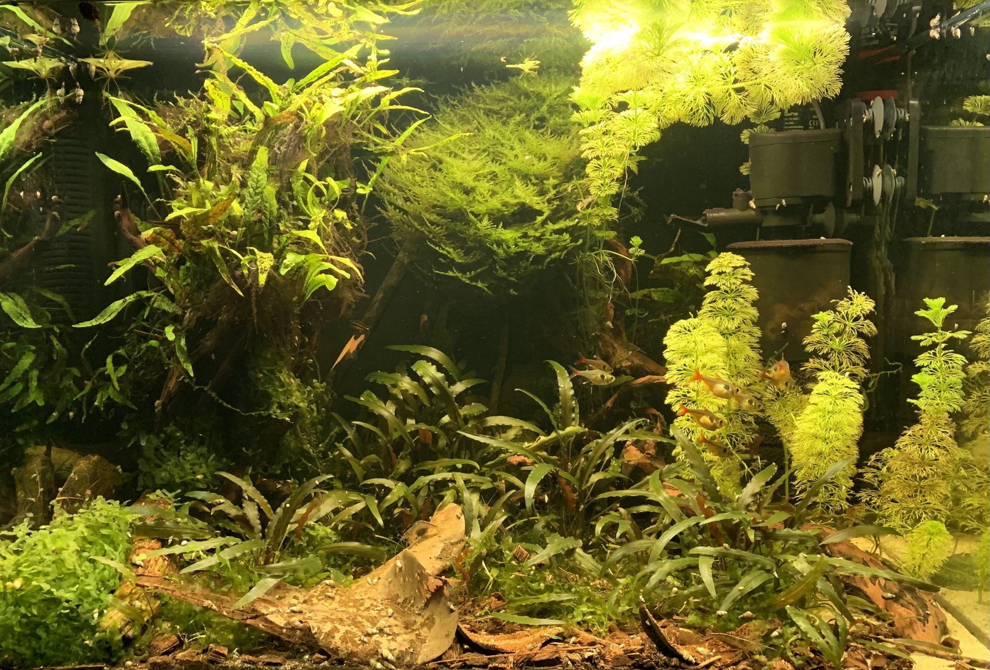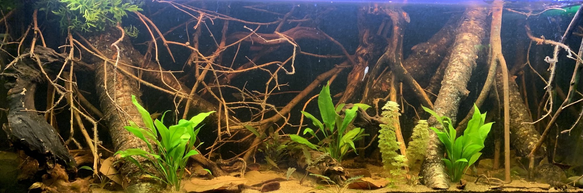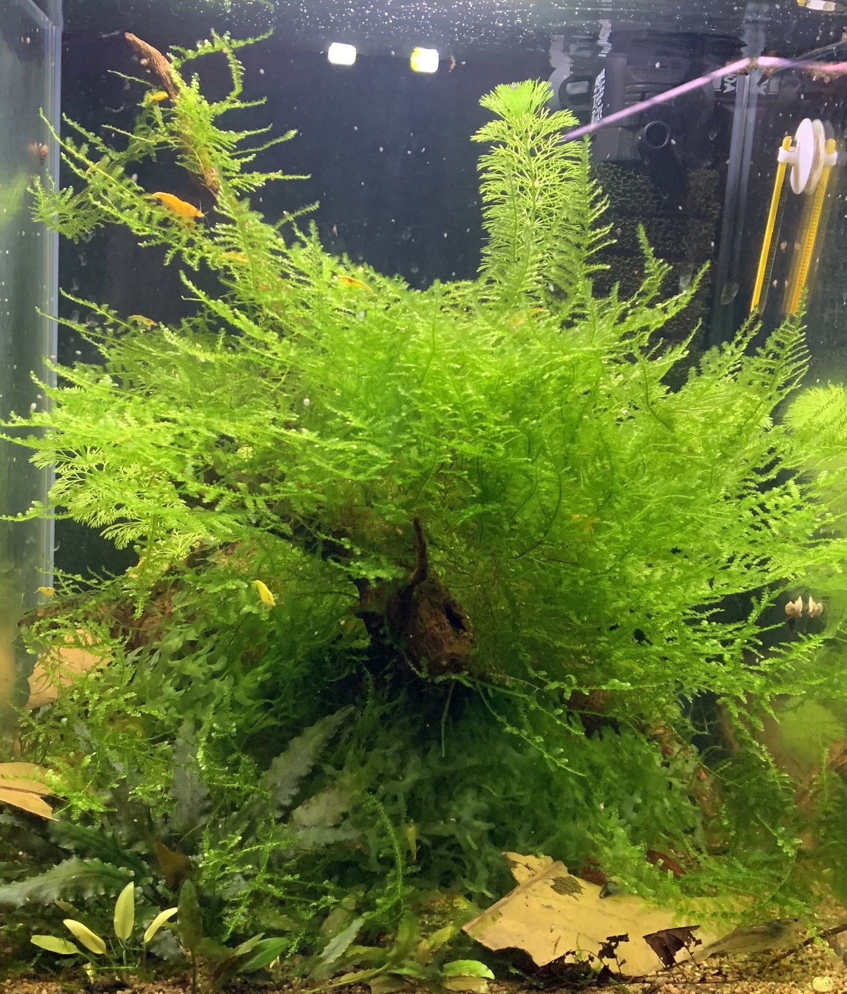 Själv hade jag nog inte haft i så mycket mera växter/mossa, tycker det är riktigt fint som det är- hade nog snarare satsat på att fylla på med växter ovanför akvariet i så fall. Tycker allting ser jättebra ut möjligtvis med undantag för den lite mörkare roten till höger(vänster på bild) som jag tycker sticker ut lite, men det är möjligt att den ser bättre ut i person eller fyller någon funktion som jag inte ser(eller så är det jag som har dålig smak!
